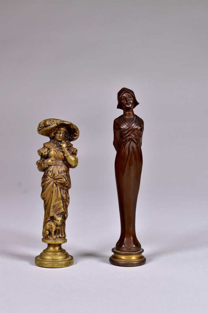Deux sceaux, un en bronze l’autre en métal gris patiné brun, les deux représentant des femmes, non gravés (usures). Vers 1900 pour un. Haut. : 11 cm pour le plus grand.