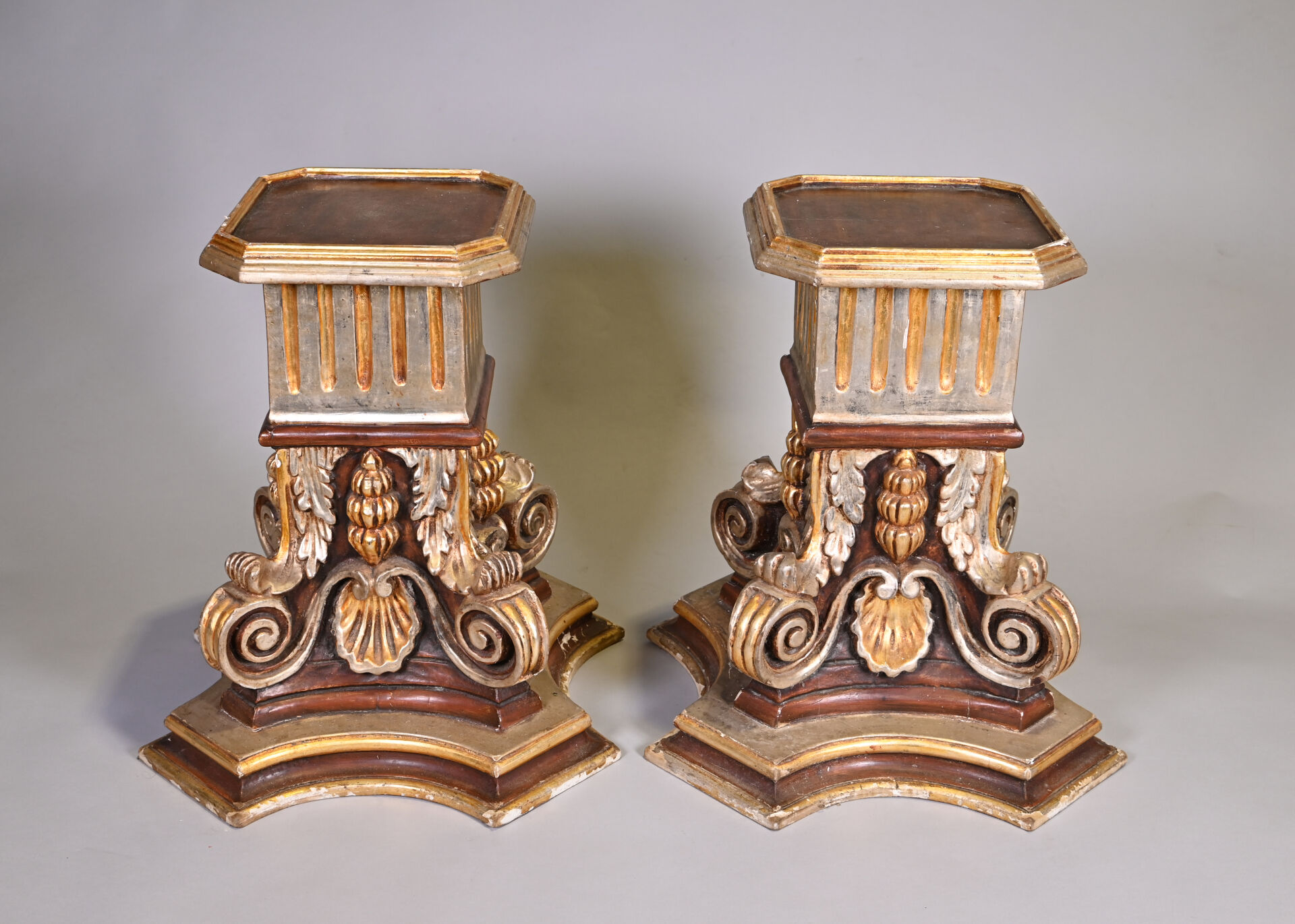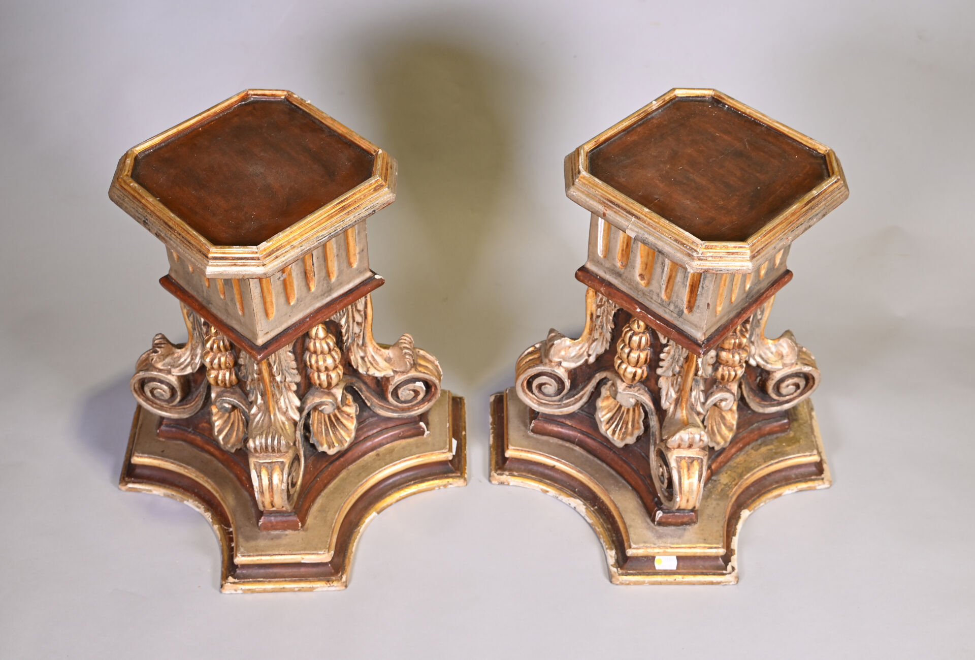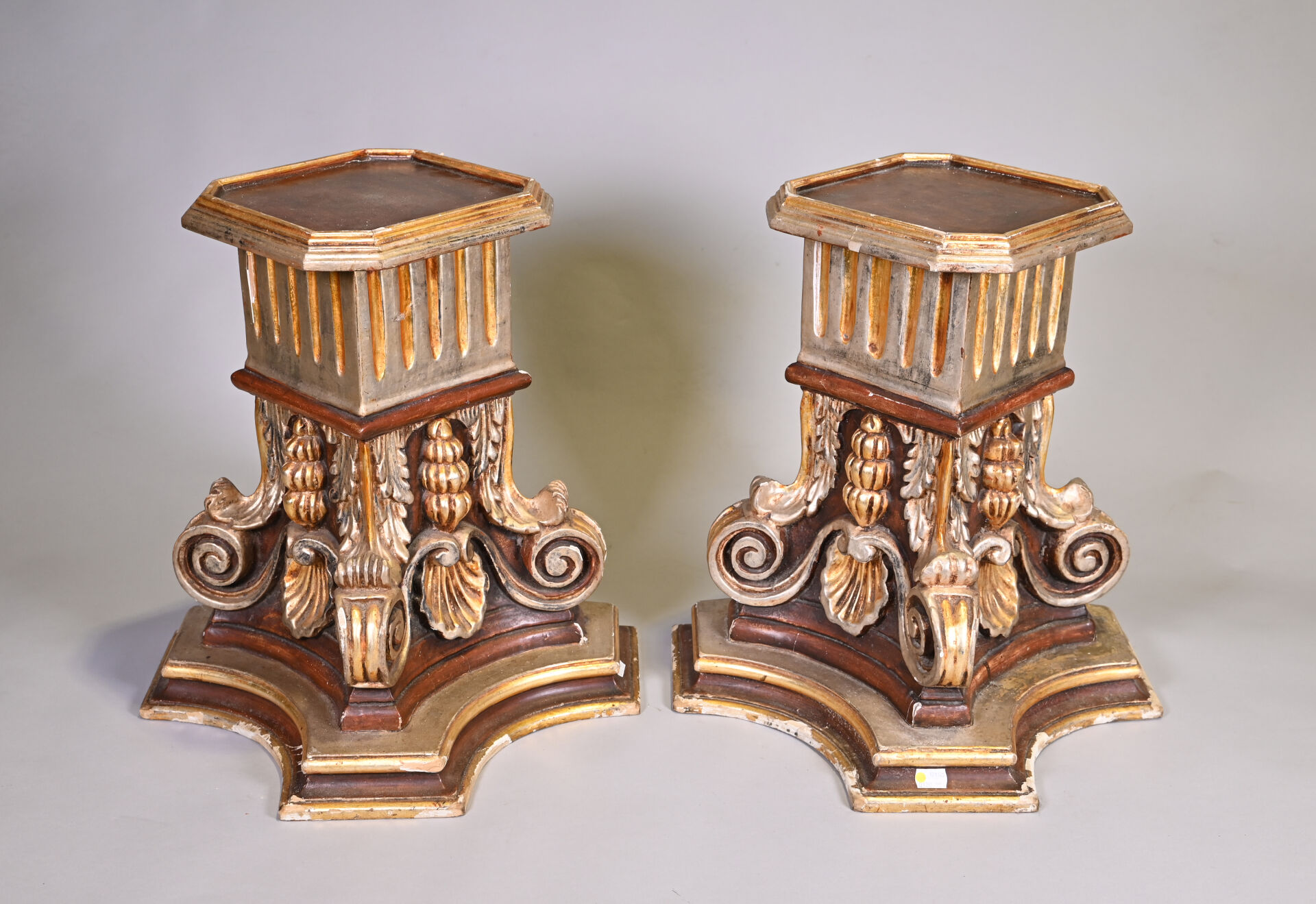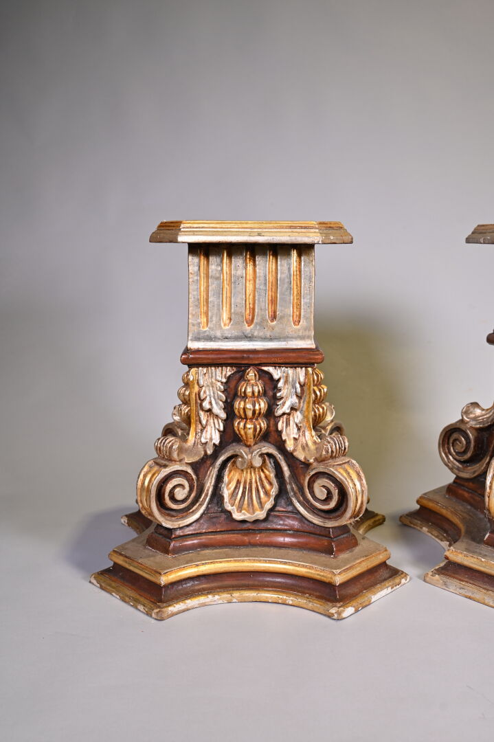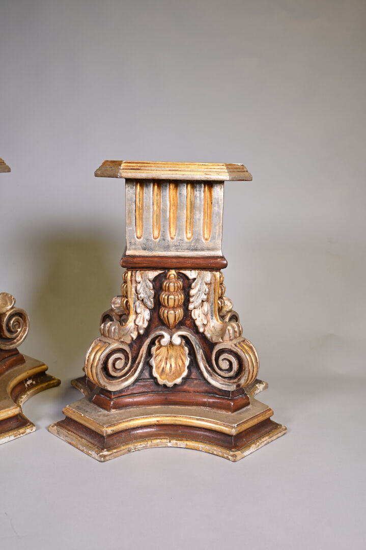 Deux sellettes cannelées en bois sculpté, argenté et doré à décor de coquilles et enroulements (usures et éclats). XXe siècle. Haut. : 47 cm.