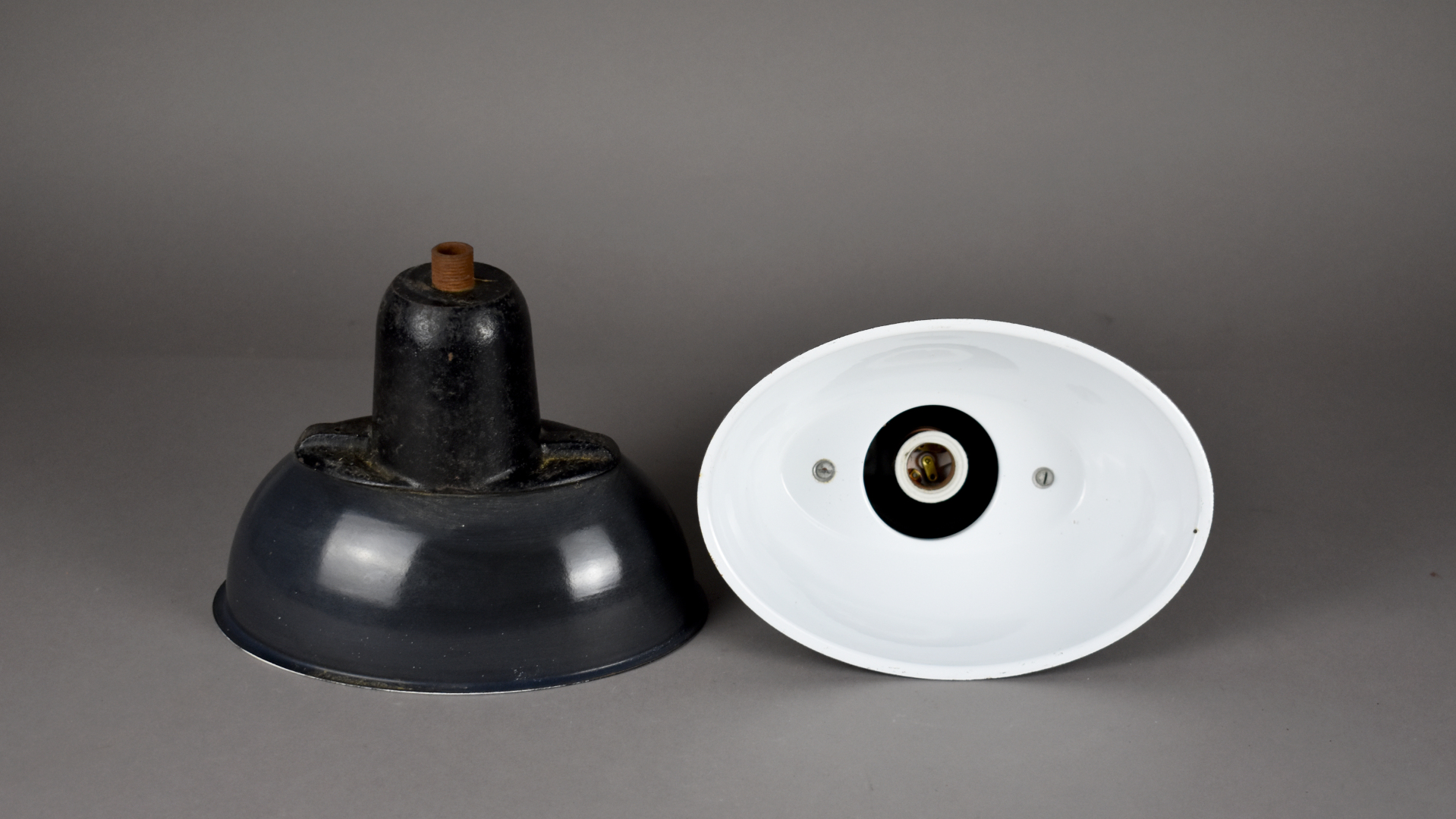 Deux suspensions en tôle émaillée noire, intérieur blanc et fonte. Milieu du XXe siècle.