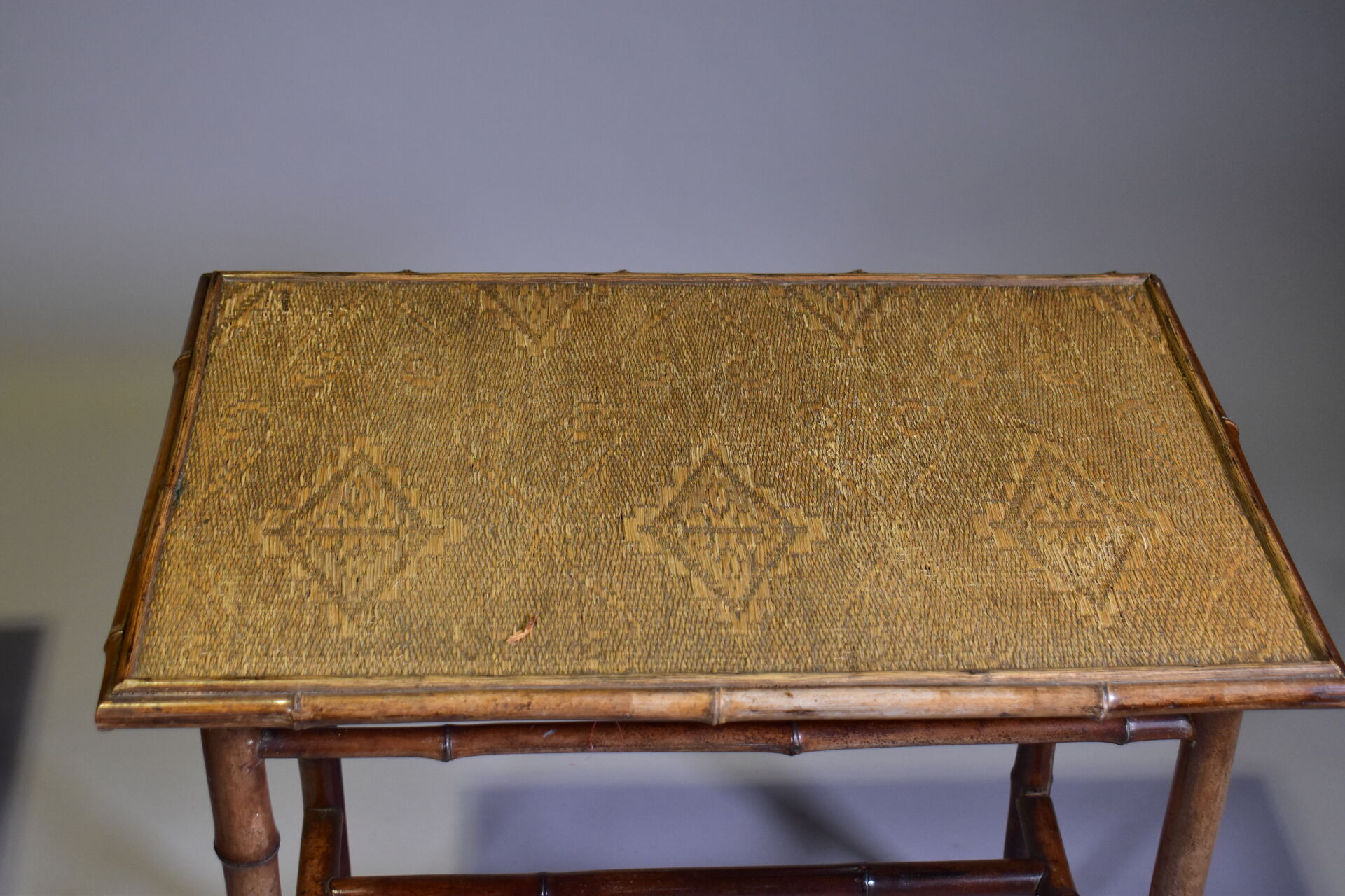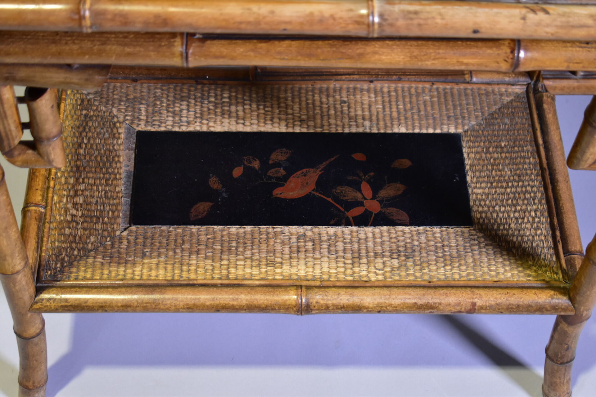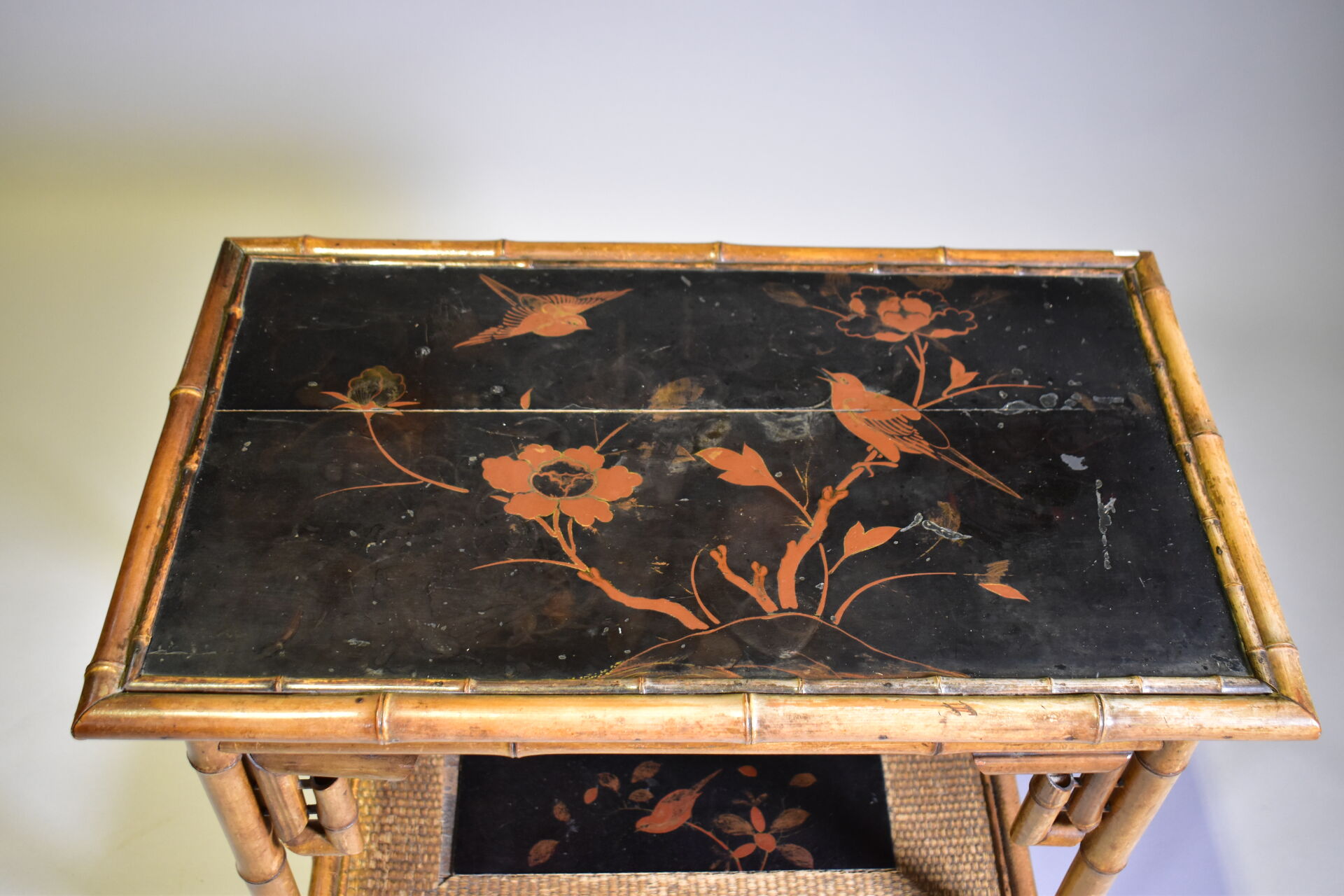 Deux tables en bambou, l’une à double plateau laqué noir à décor de fleurs et oiseaux (usures). Haut. : 75 cm et Haut. : 74 cm.