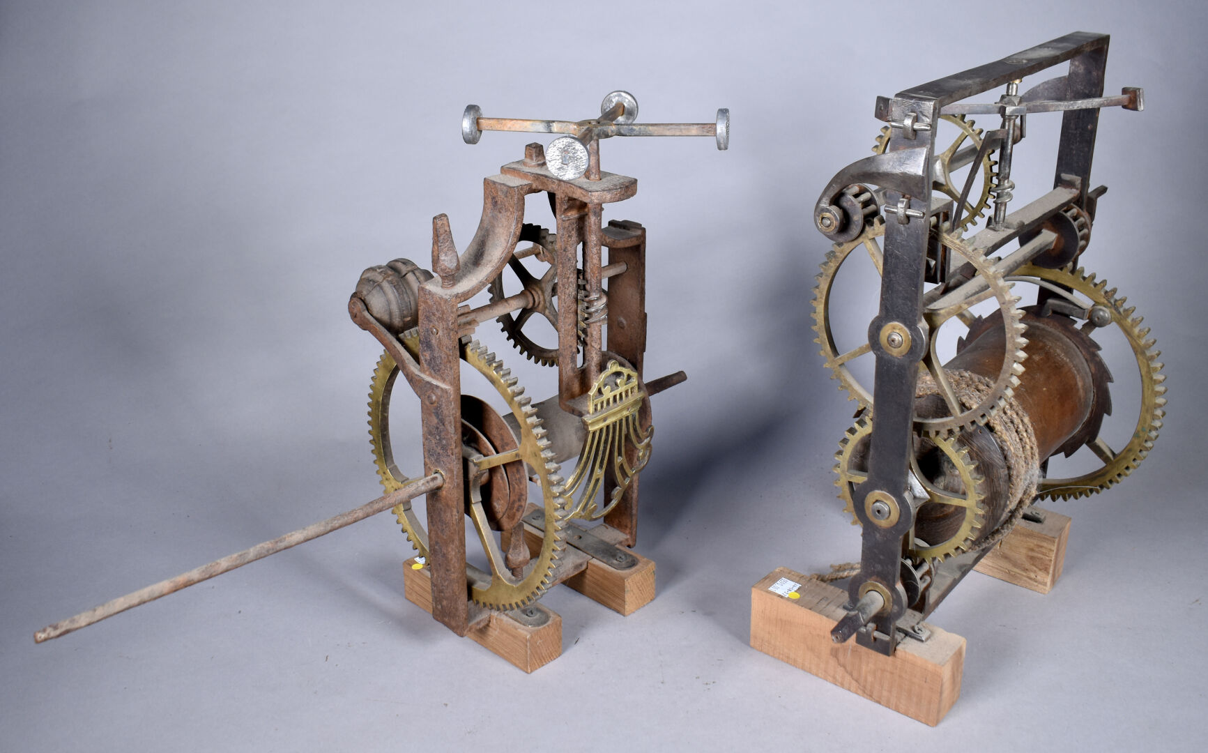 Deux tourne-broches ?? un tour mécanique. Dim. du tour. : Haut. : 37 cm – Larg. : 80 cm – Prof. : 23 cm.
