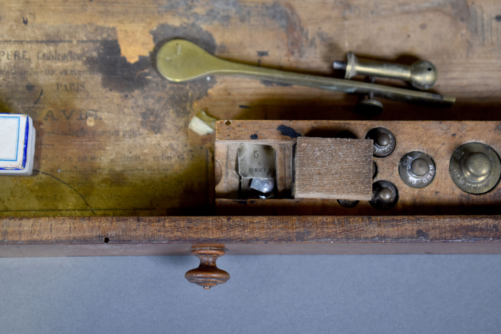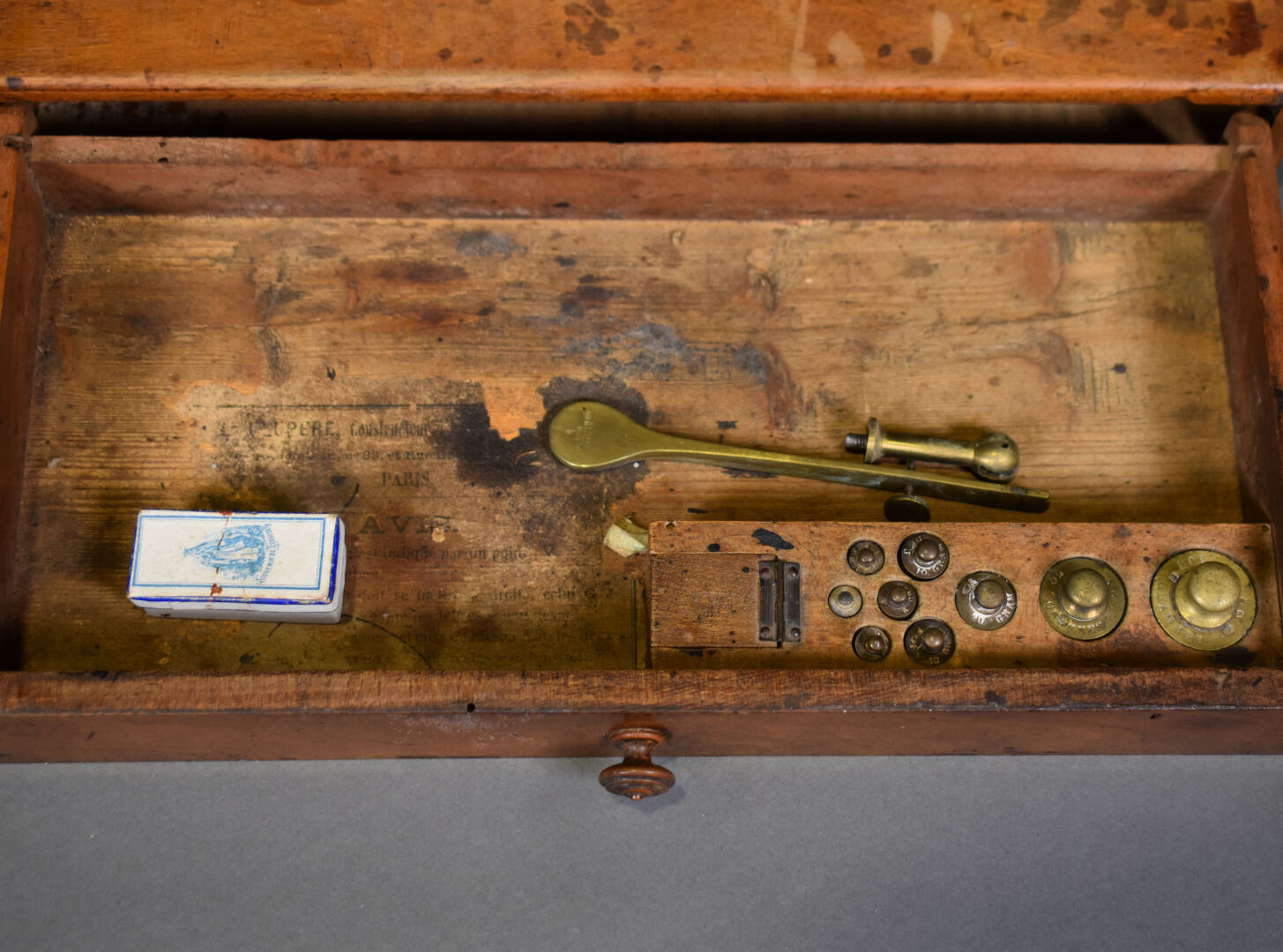 Deux trébuchets en laiton avec leurs poids dans leurs coffrets de noyer. Début du XXe siècle.