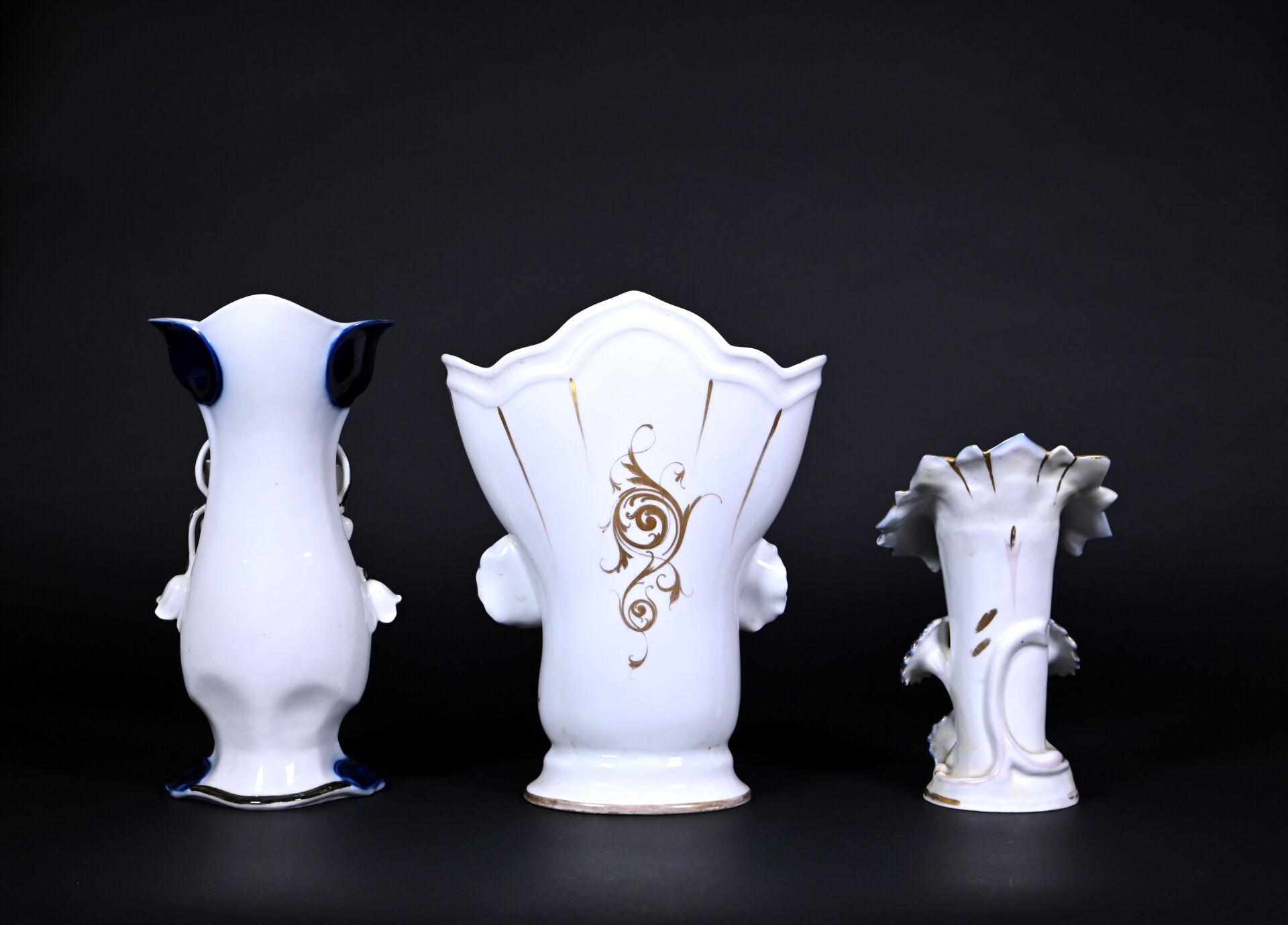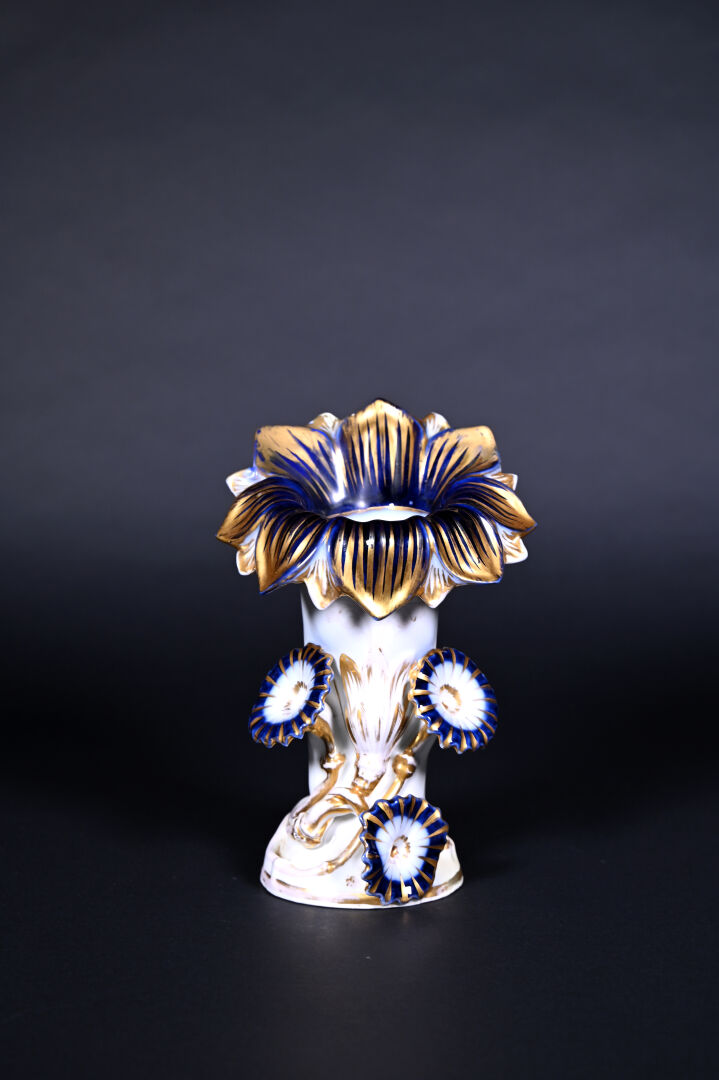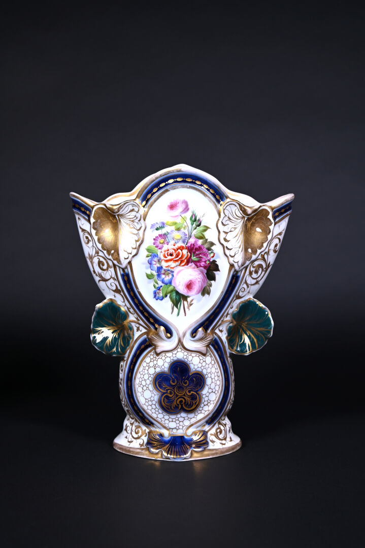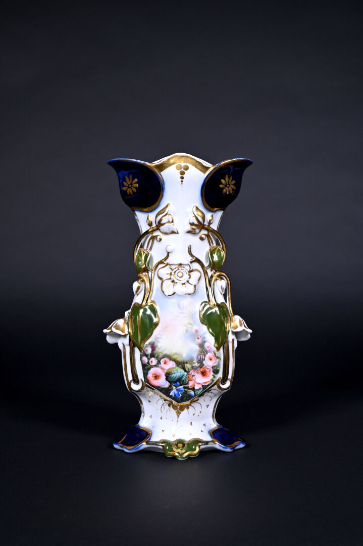 Deux vases cornet en porcelaine émaillée en polychromie de fleurs, vert, bleu et or ( une restauration sur le col, deux éclats et un fèle sur plus mince, un défaut de cuisson sur l’autre). Probablement BAYEUX ou VALENTINE. XIXe siècle. Haut. du plus grand. : 35,5 cm. On joint un troisième vase en porcelaine à décor de liserons en bleu et or.