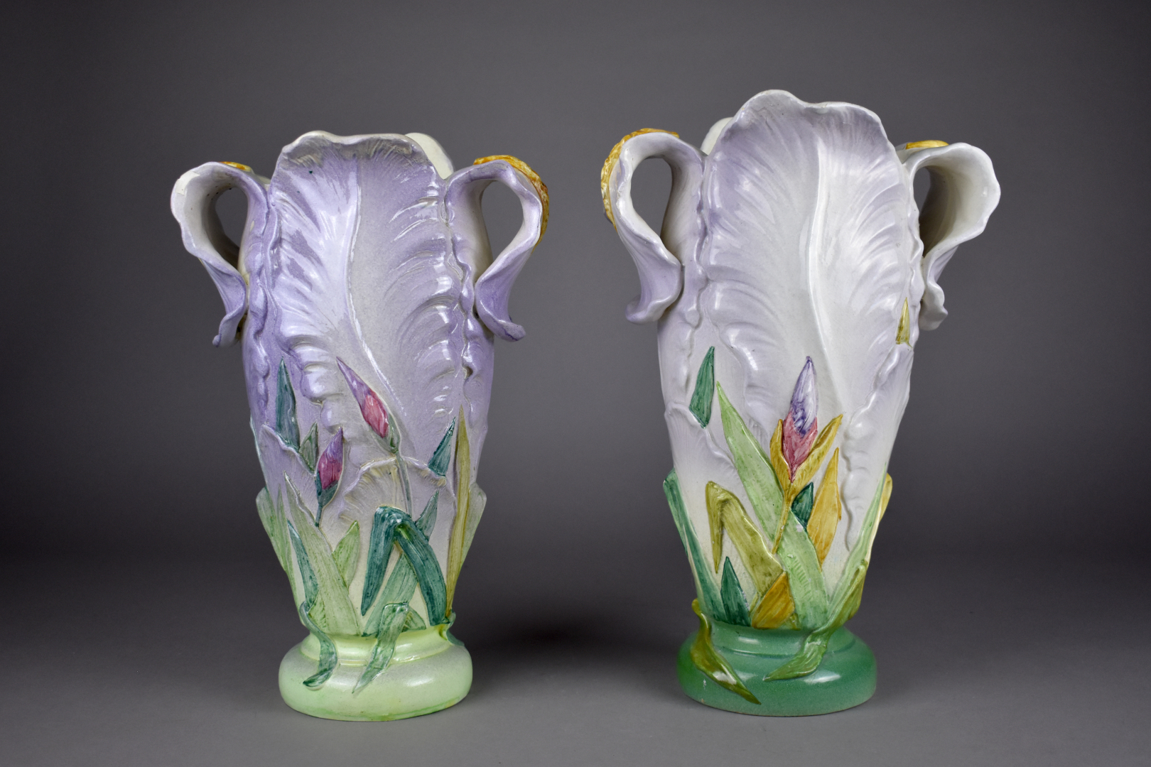 Deux vases en barbotine représentant des iris mauves (éclats). Vers 1900. 39,5 cm.
