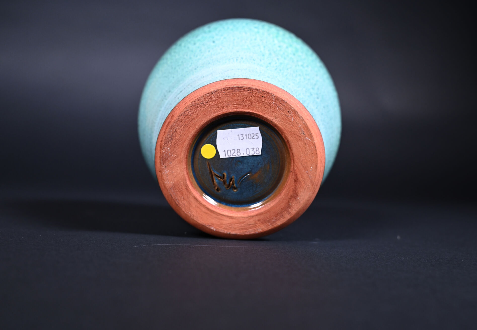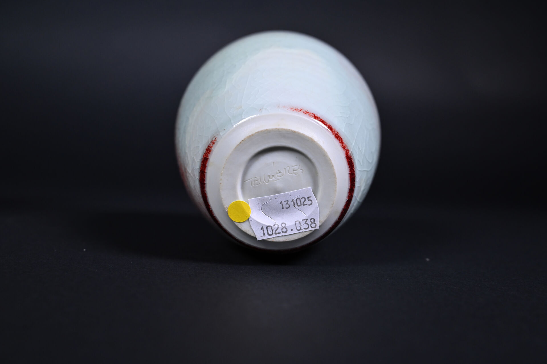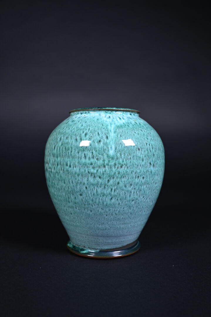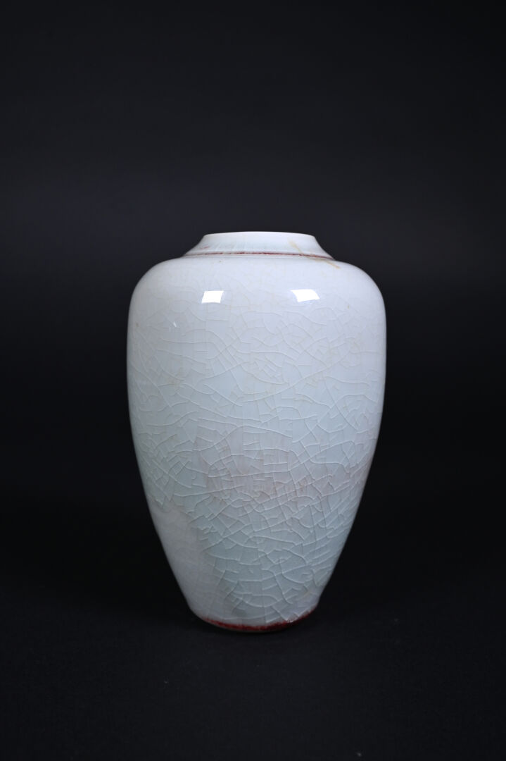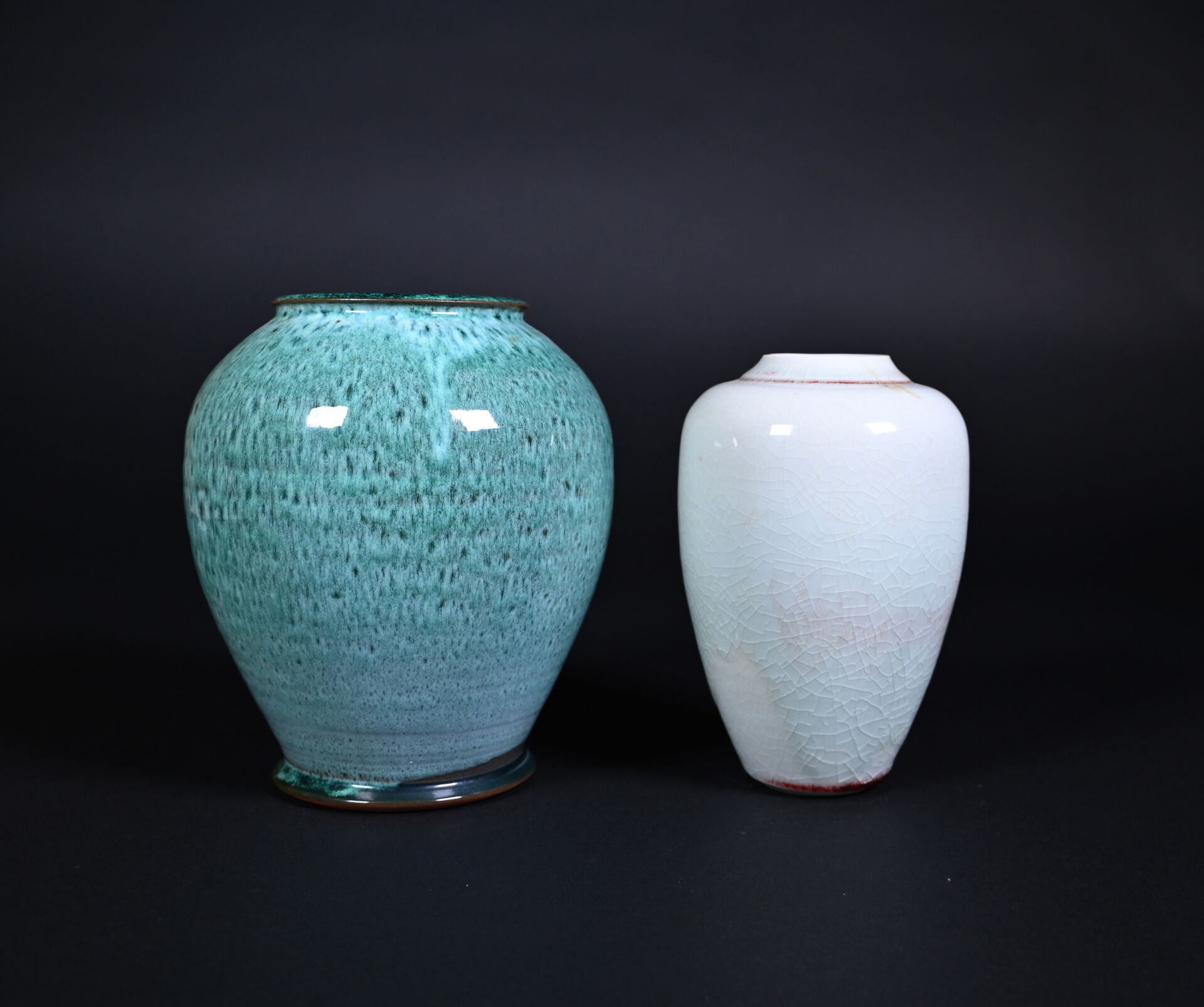 Deux vases en céramique émaillée, un crème et rouge sur fond craquelé, signé au dessous. L’autre en turquoise. Haut. : 19 cm pour le plus grand.