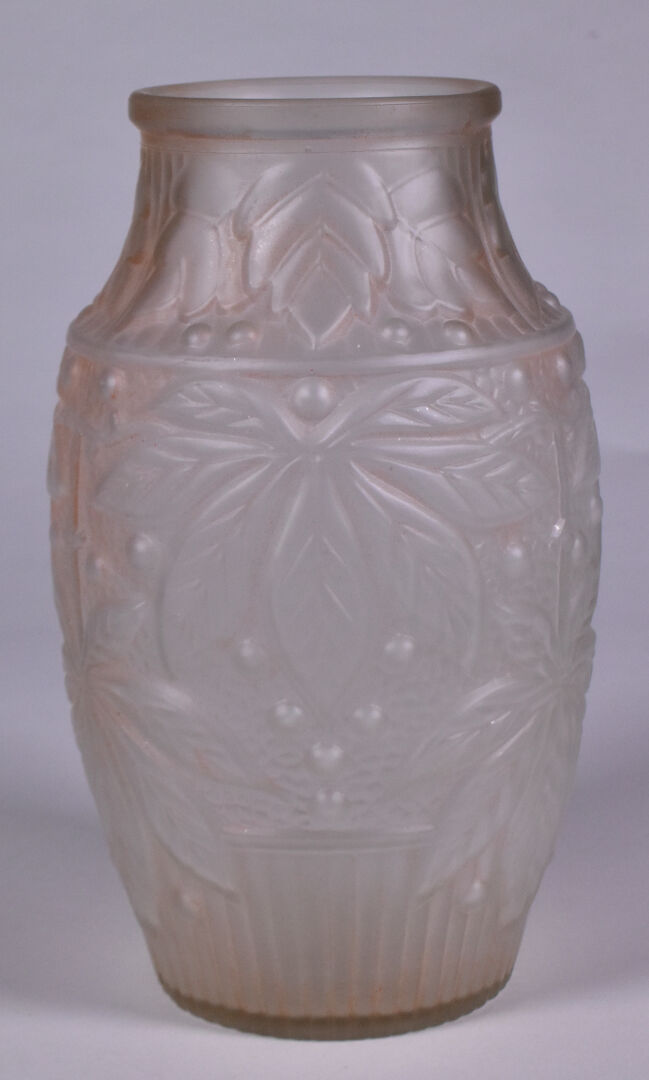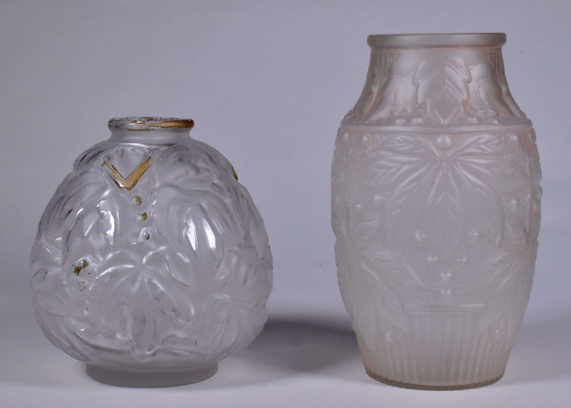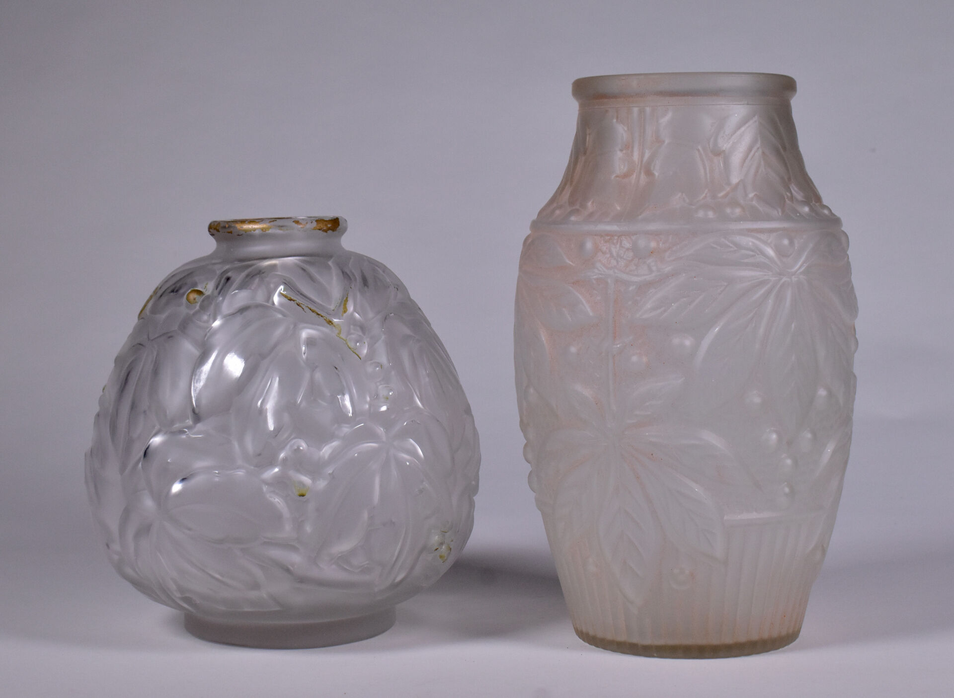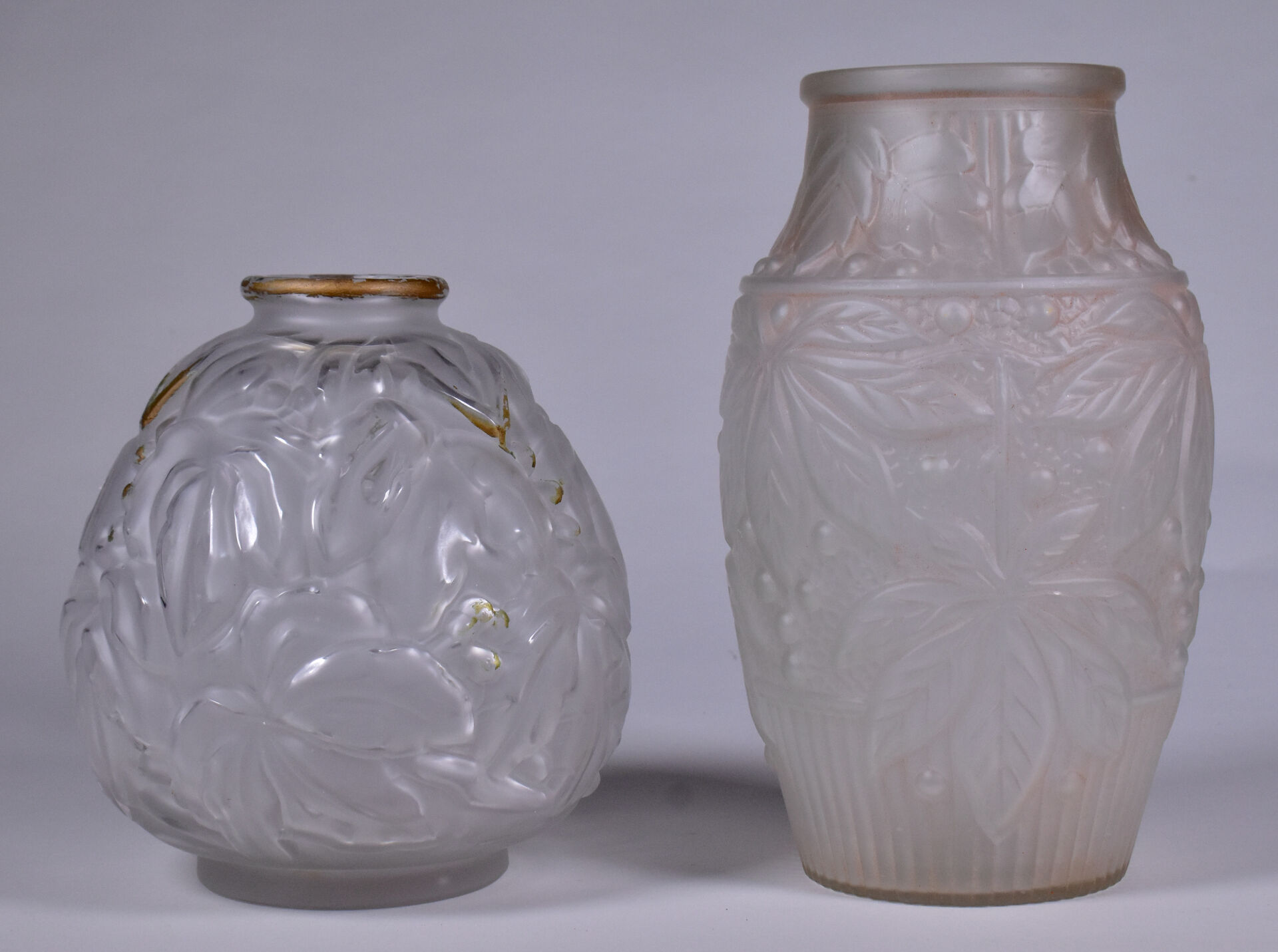 Deux vases en verre moulé dépoli, l’un patiné rose à décor de feuilles de marronnier, l’autre à décor de bananiers anciennement doré. Haut. du plus grand. : 25 cm.