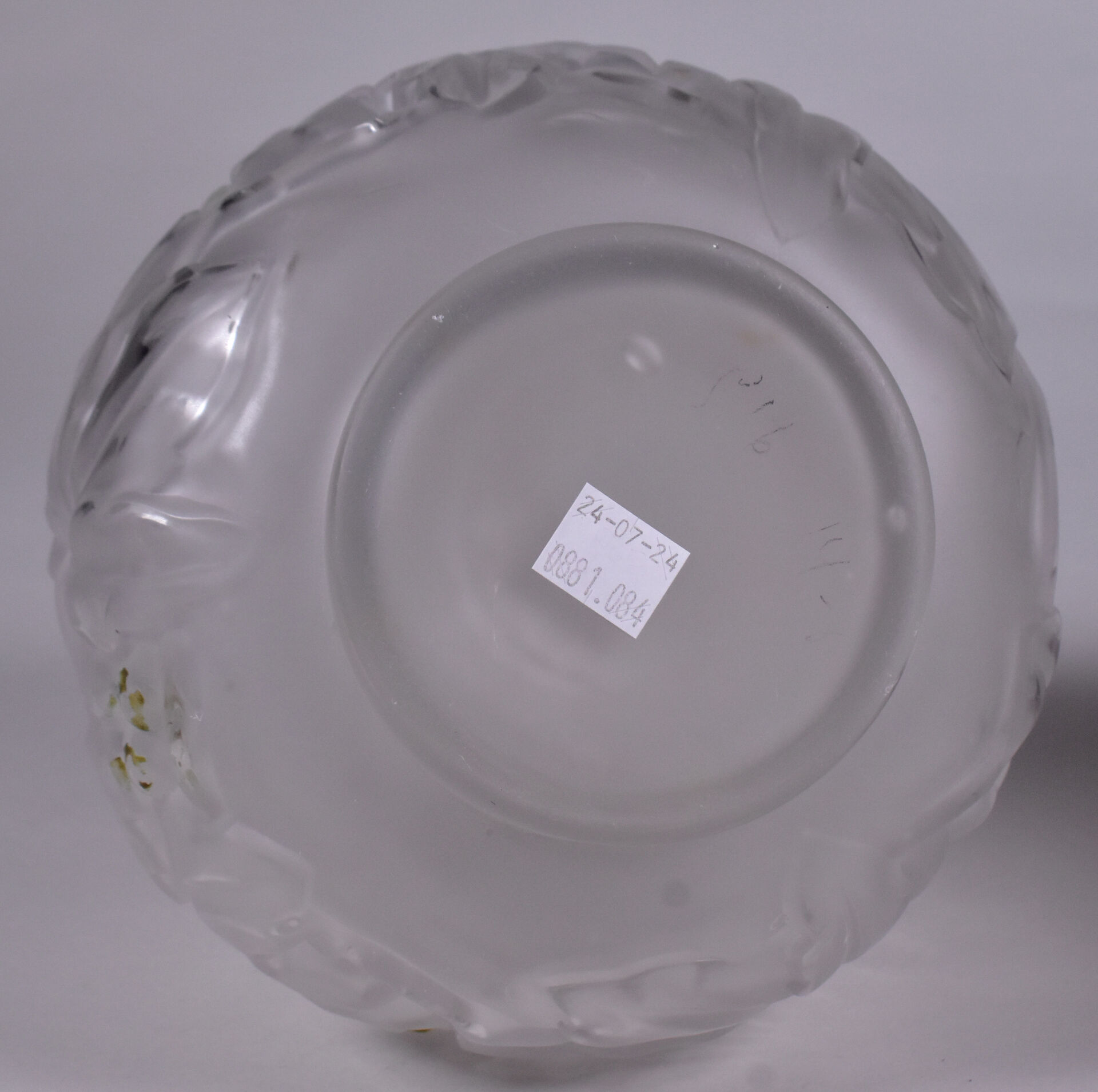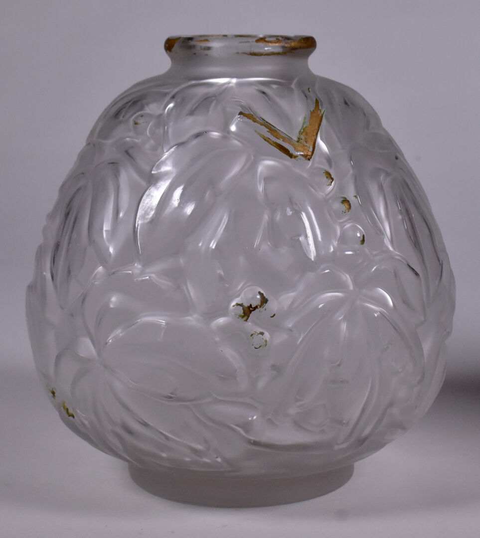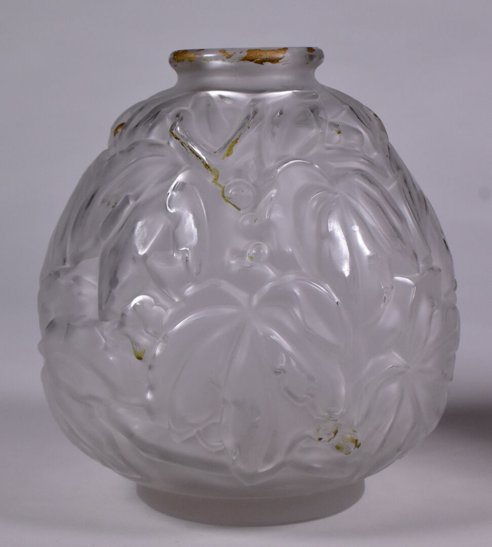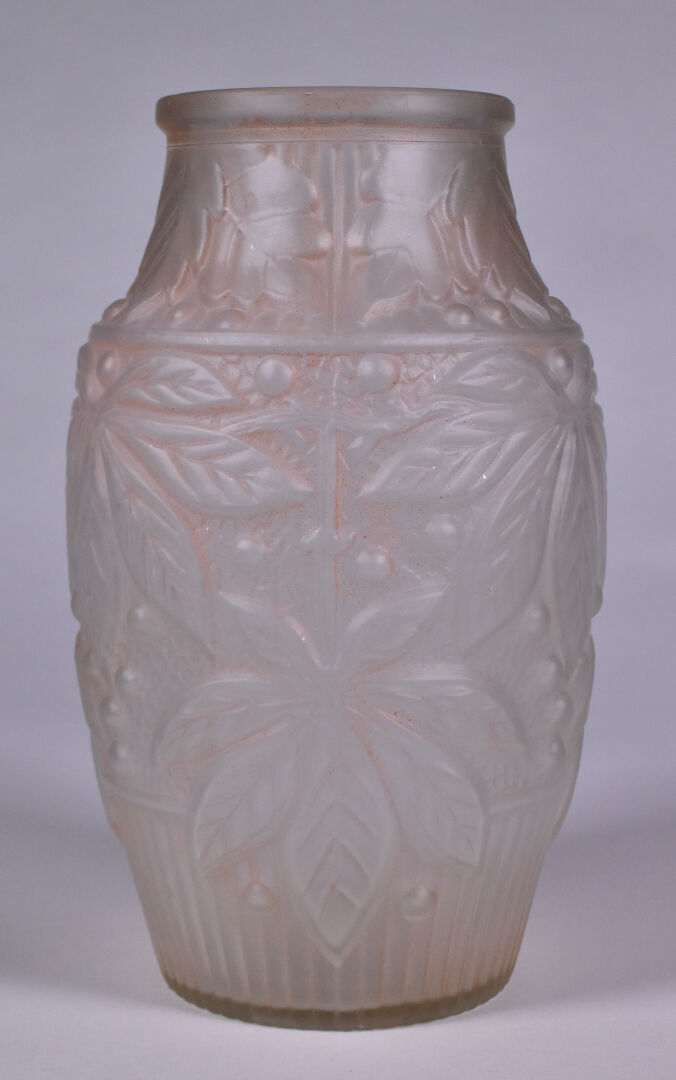 Deux vases en verre moulé dépoli, l’un patiné rose à décor de feuilles de marronnier, l’autre à décor de bananiers anciennement doré. Haut. du plus grand. : 25 cm.