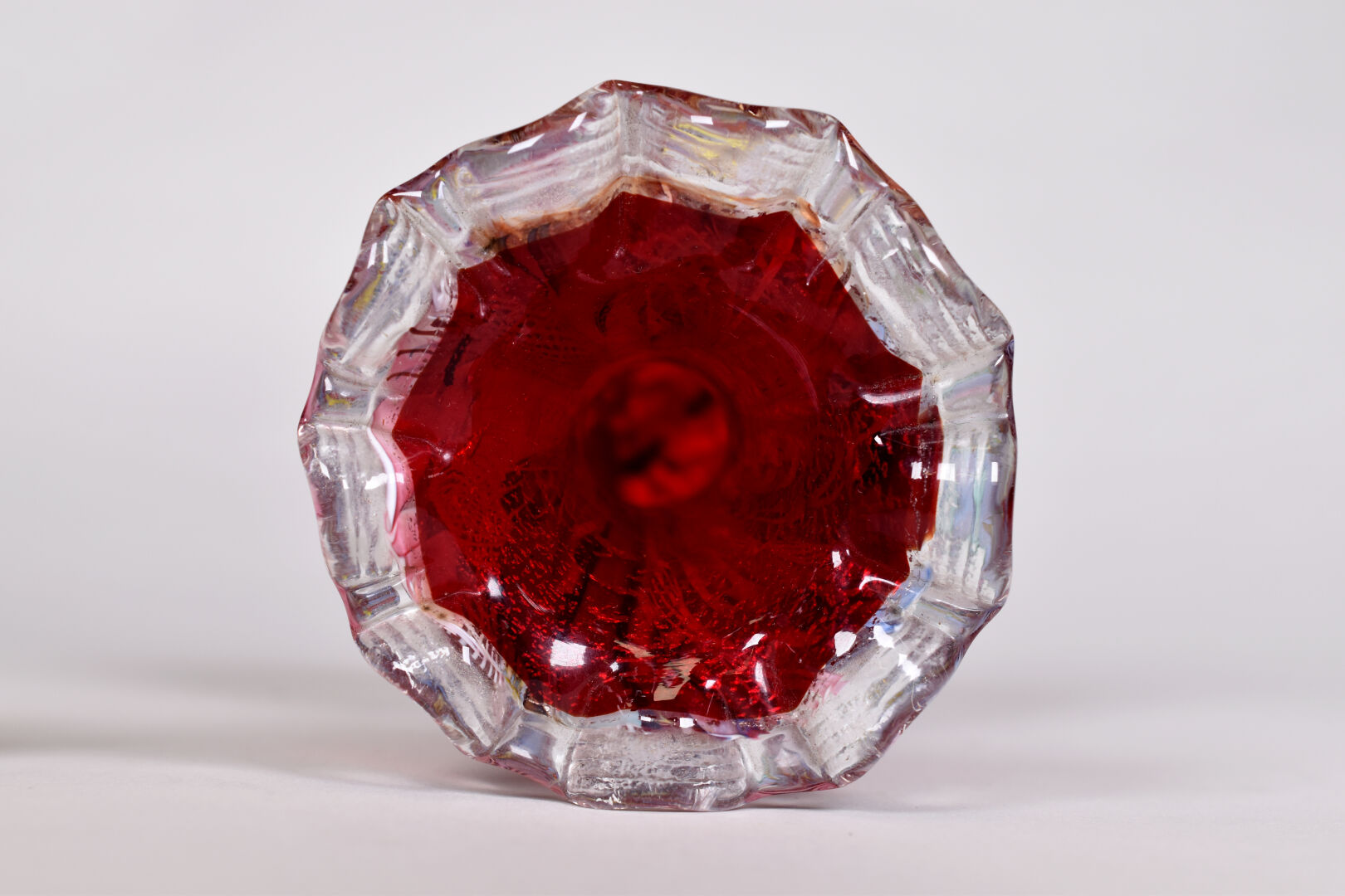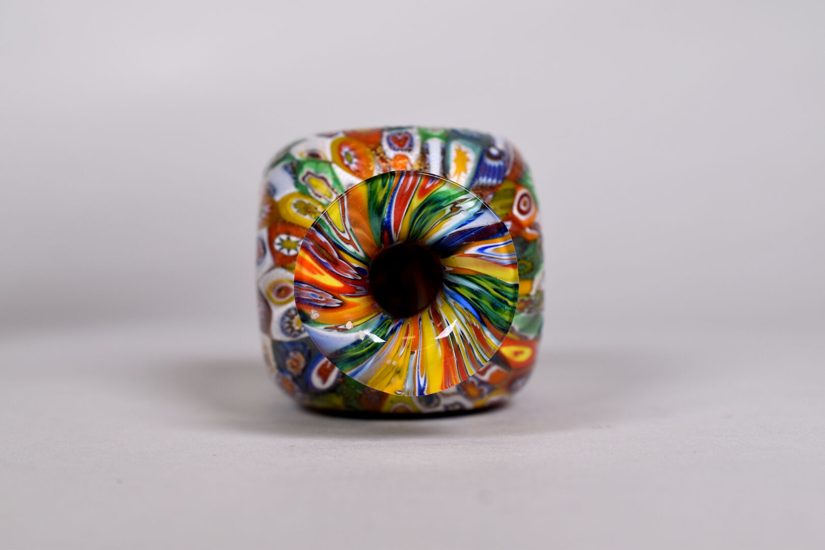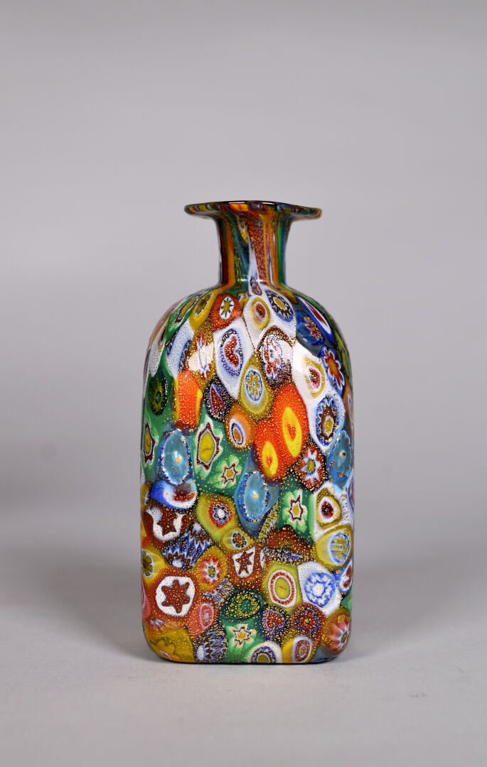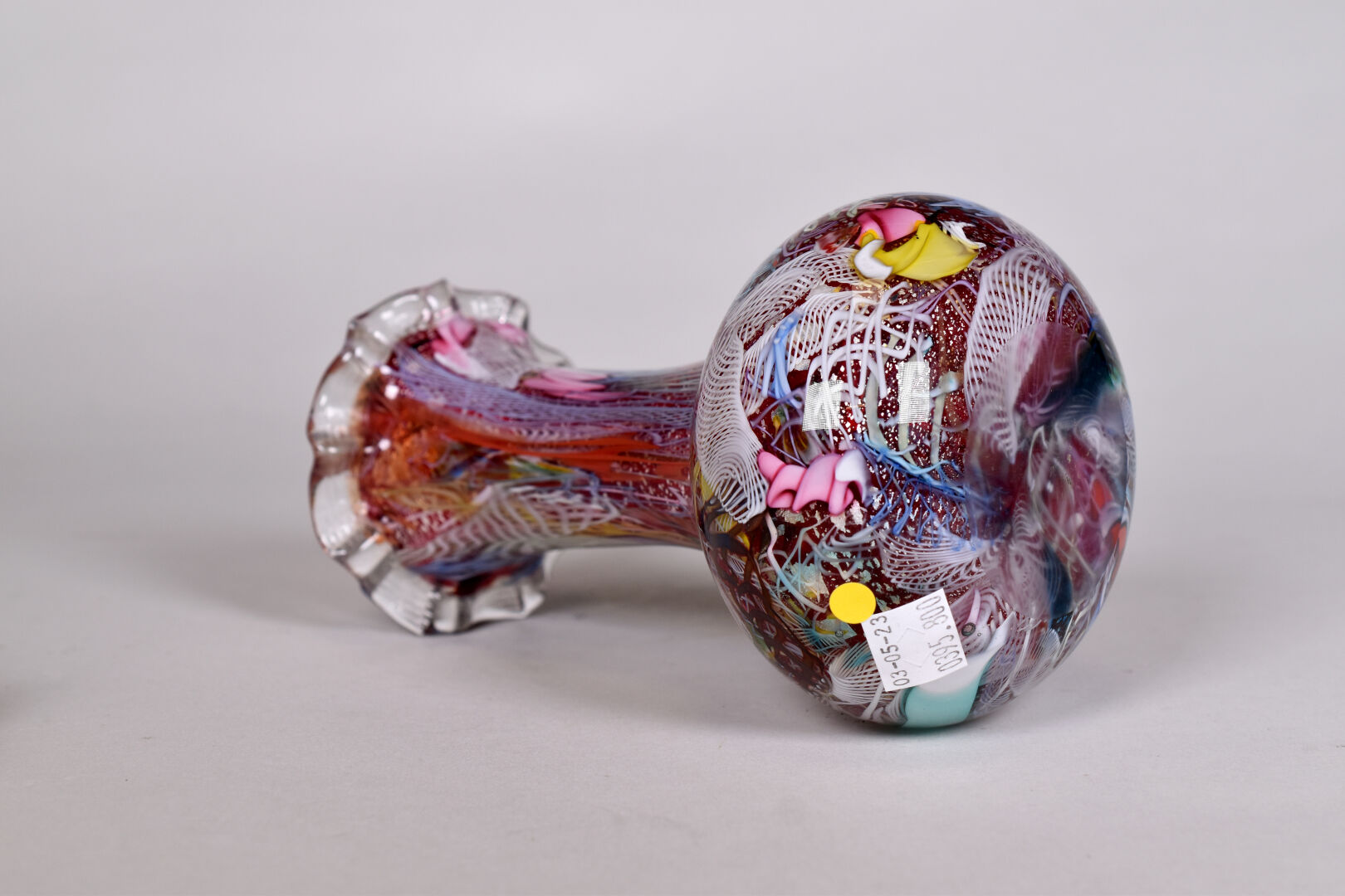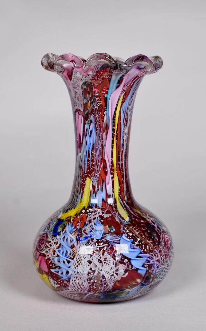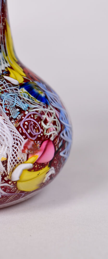 Deux vases en verre soit un soliflore à décor de murines, l’autre multicouches à décor de rubans et filigrannes dans le goût de Toso à Murano et Dino MARTENS. XXe siècle. Haut. : 12 cm et 18 cm.