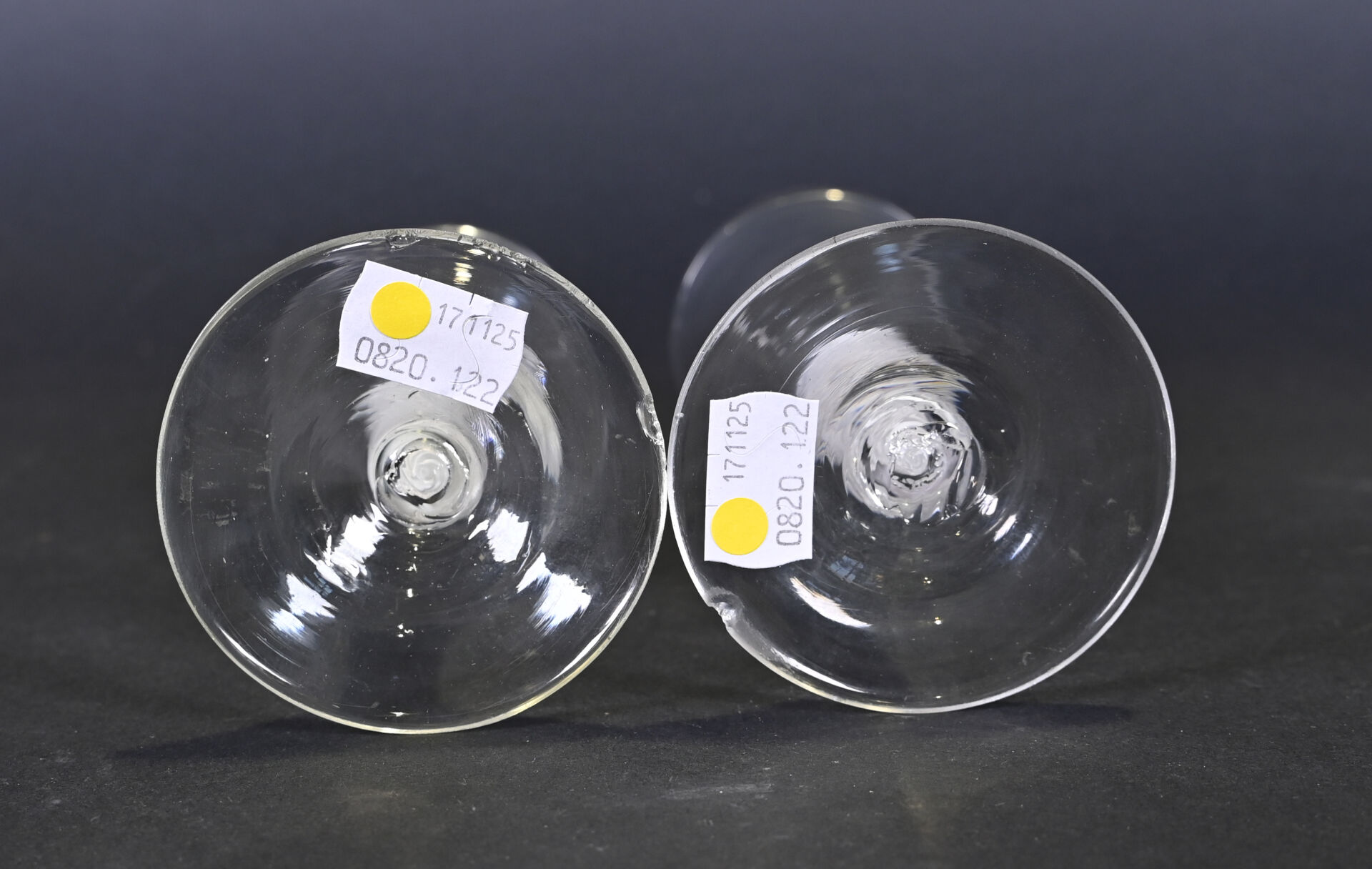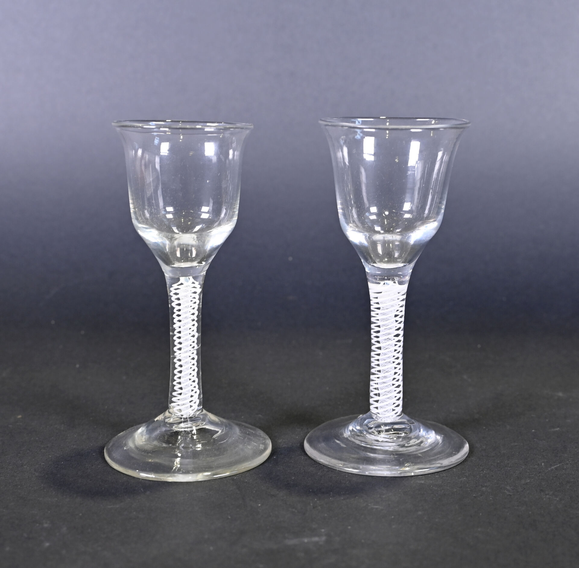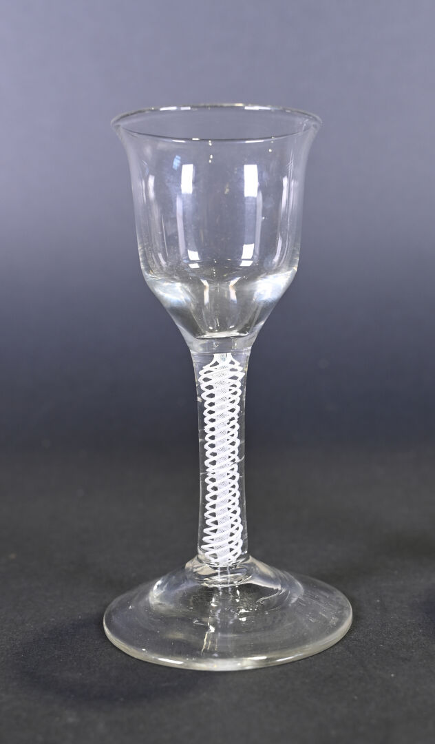Deux verres à Porto ? en cristal. La coupe évasée. La jambe à inclusion d’un multi twist opaque. (petits éclats à la base) Angleterre, XVIIIe siècle. Haut. : 14 cm.