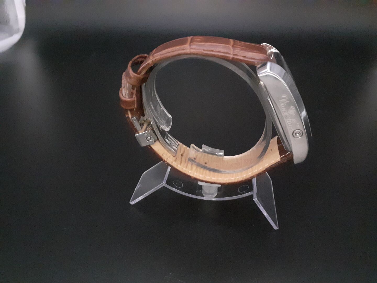 DIAM STARS automatic, montre bracelet d’homme, guichet mois à 3H, guichet jour à 9H guichet date à 12H, boitier et fermoir en acier, index chiffres romains en noir, cadran fond blanc, aiguilles bleues, bracelet d’origine en cuir véritable marron.