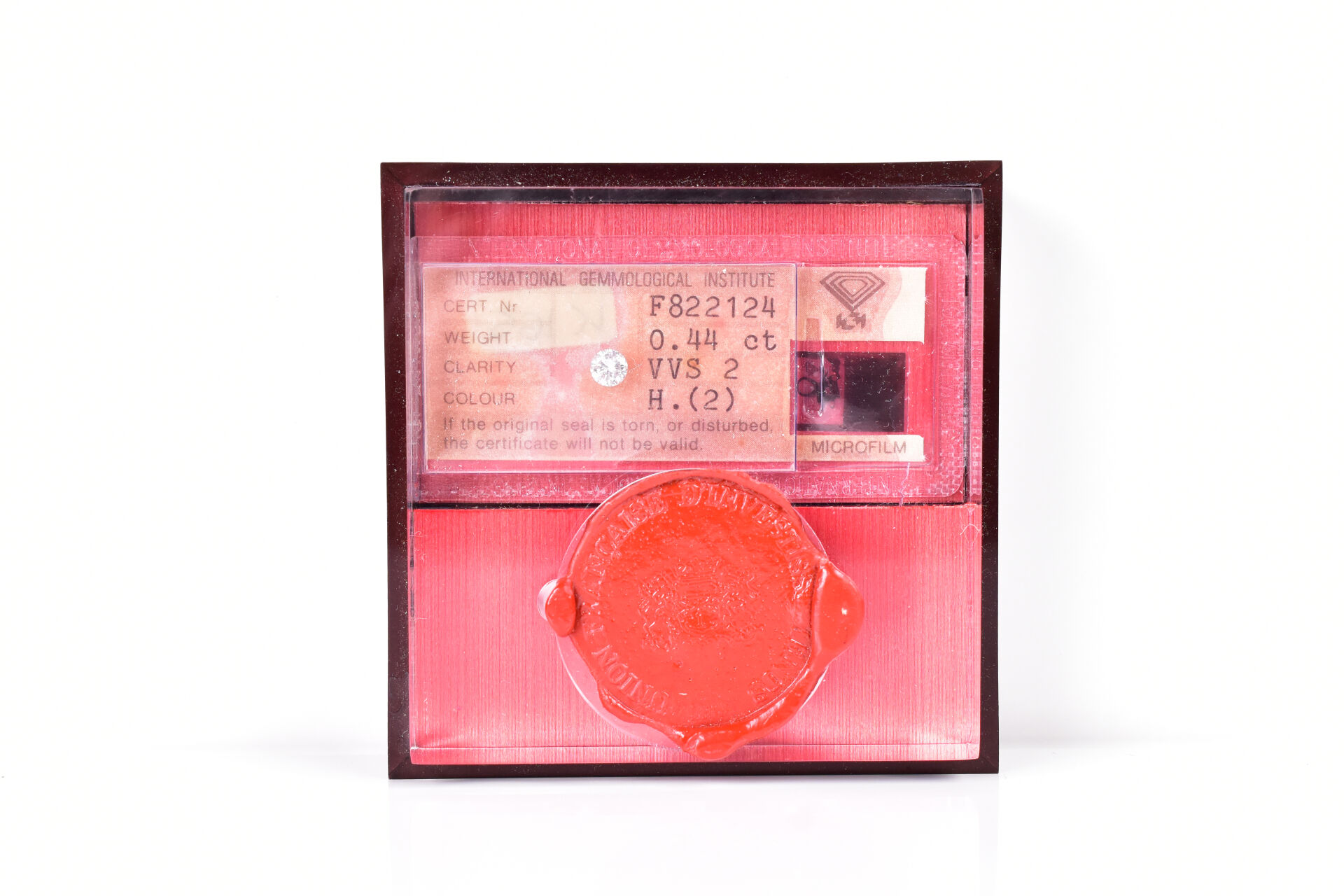 Diamant dans son scellé (IGI) de 0,44 carat. Couleur H, pureté VVS2.