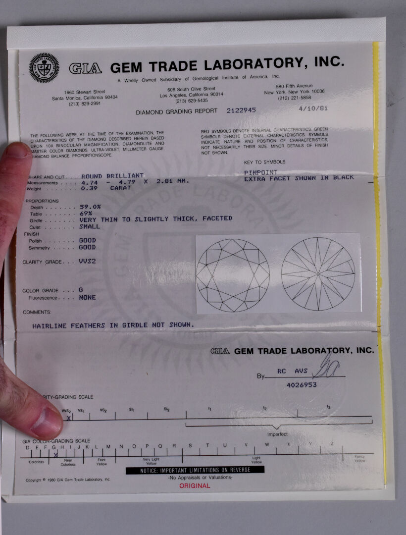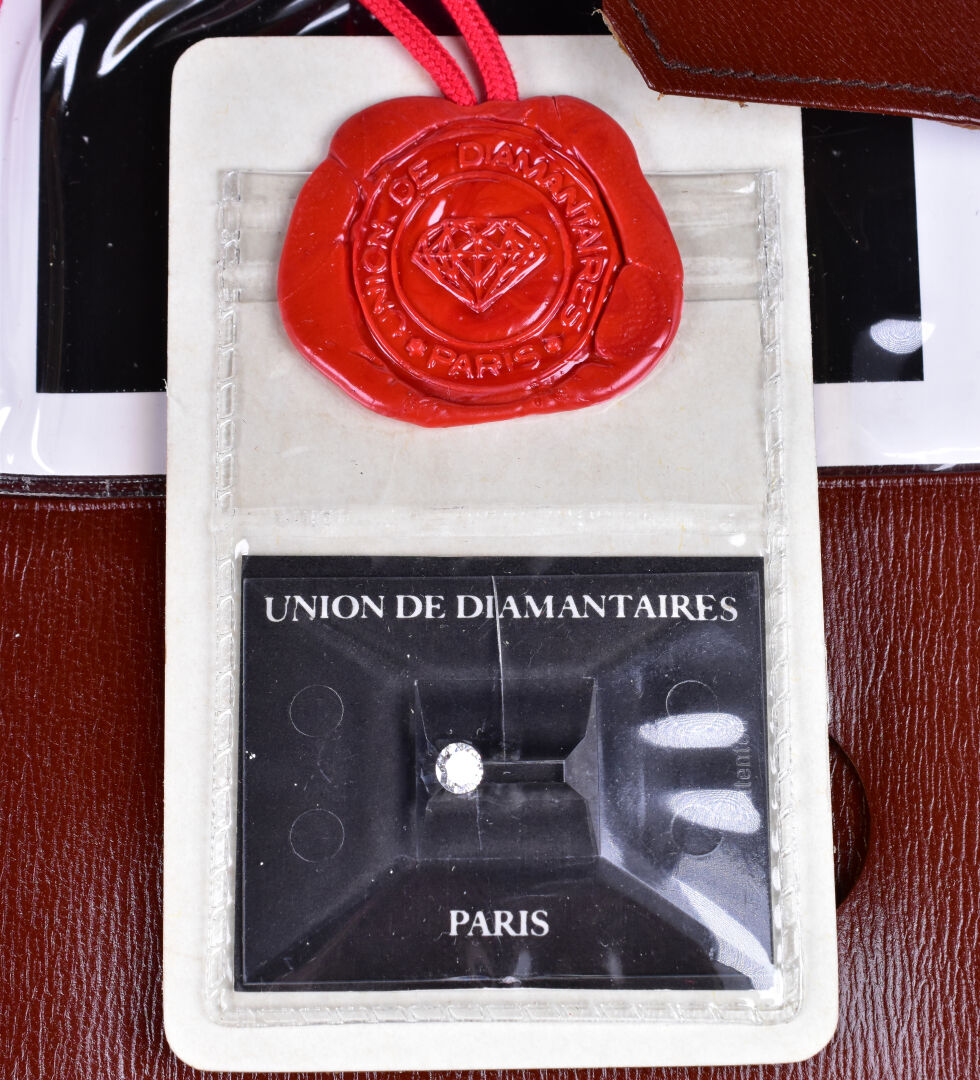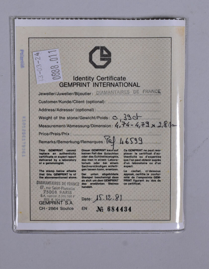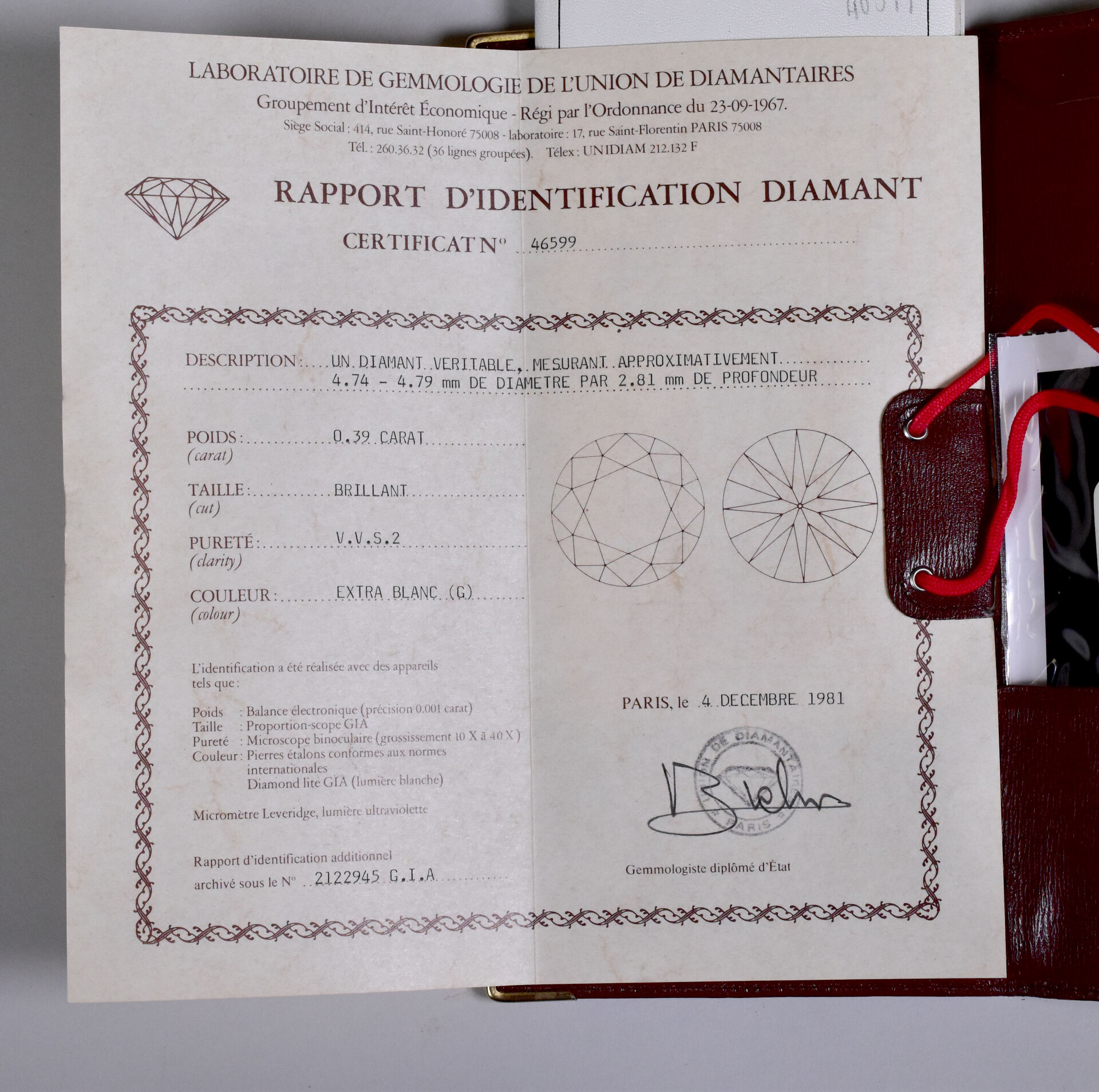 Diamant dans son scellé (Union des diamantaires) de 0,39 carat. Couleur G, pureté VVS2. Certificat GIA (4 octobre 1981).