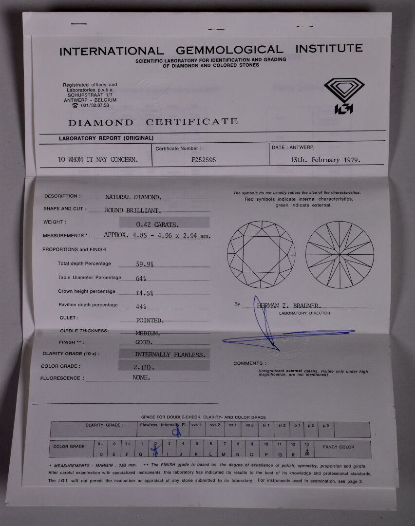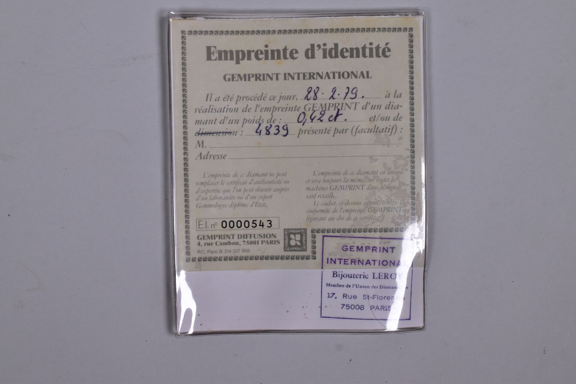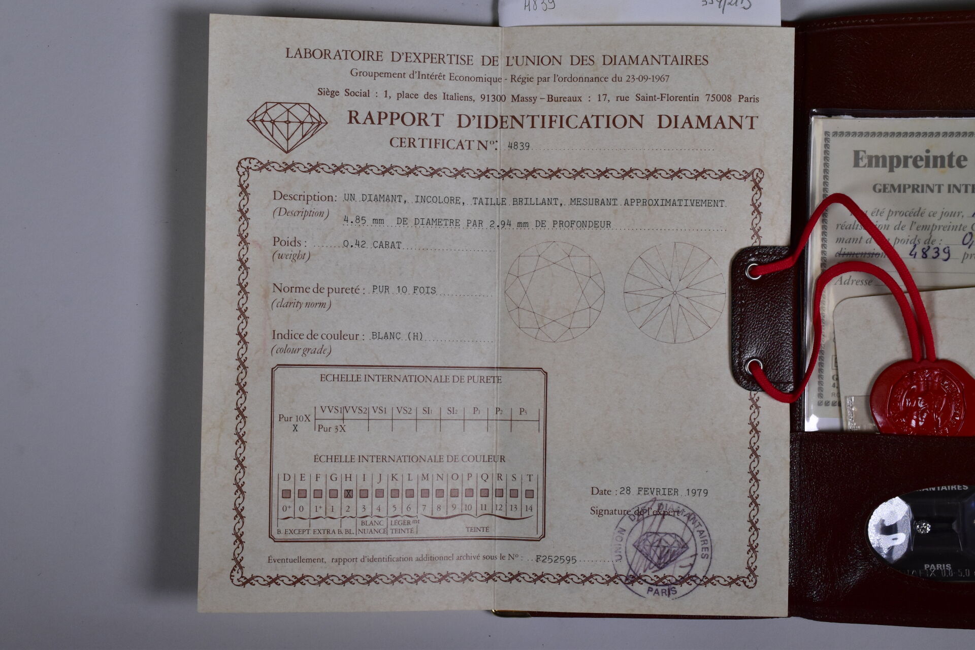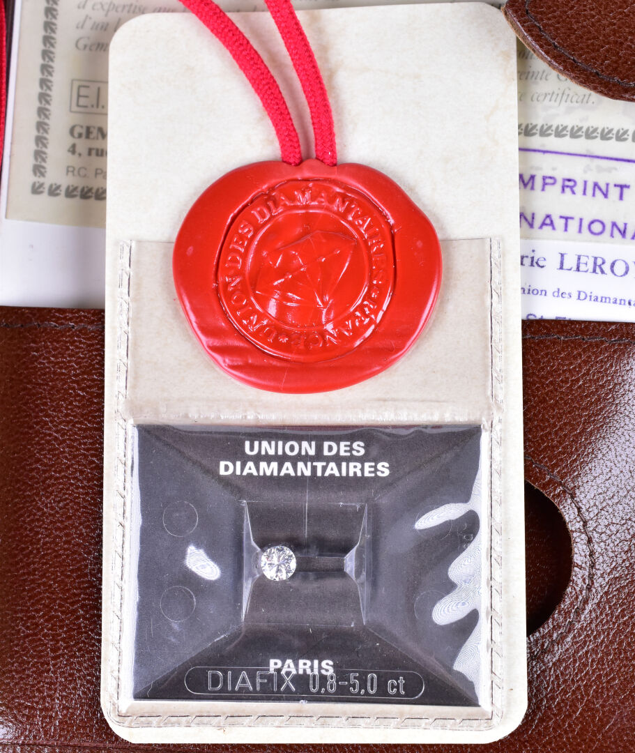 Diamant dans son scellé (Union des diamantaires) de 0,42 carat. Couleur H, pureté IF. Certificat IGI (13 février 1979).