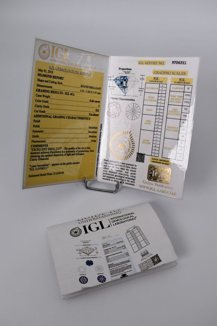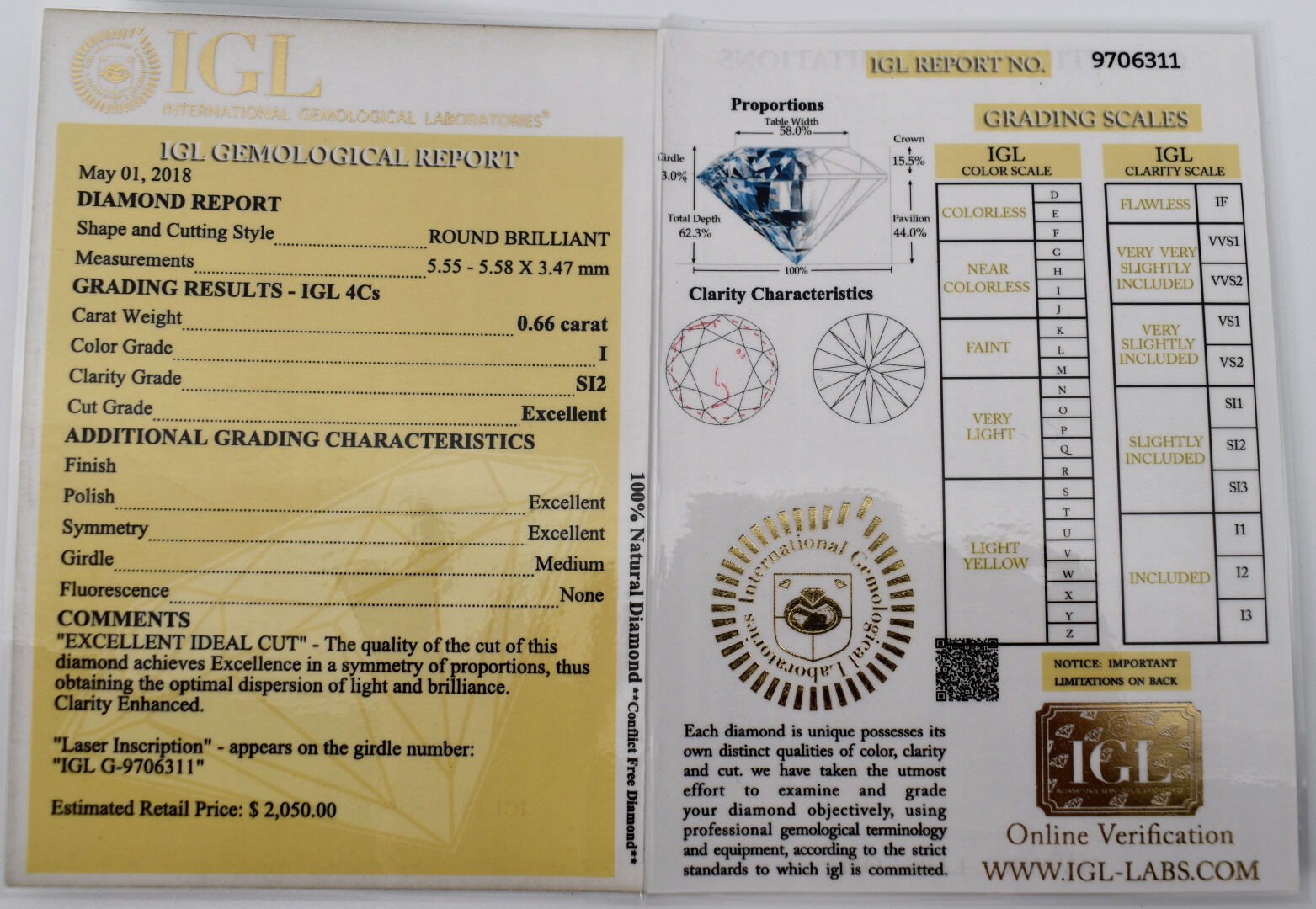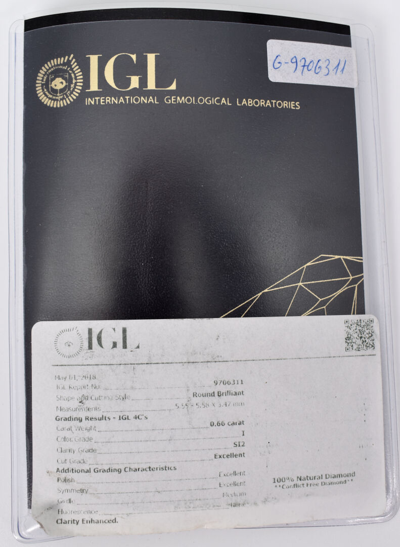 Diamant sur papier de taille brillant d’environ 0,60 carat, couleur présumée I, clareté présumée SI2. Vendu avec certificat IGL.