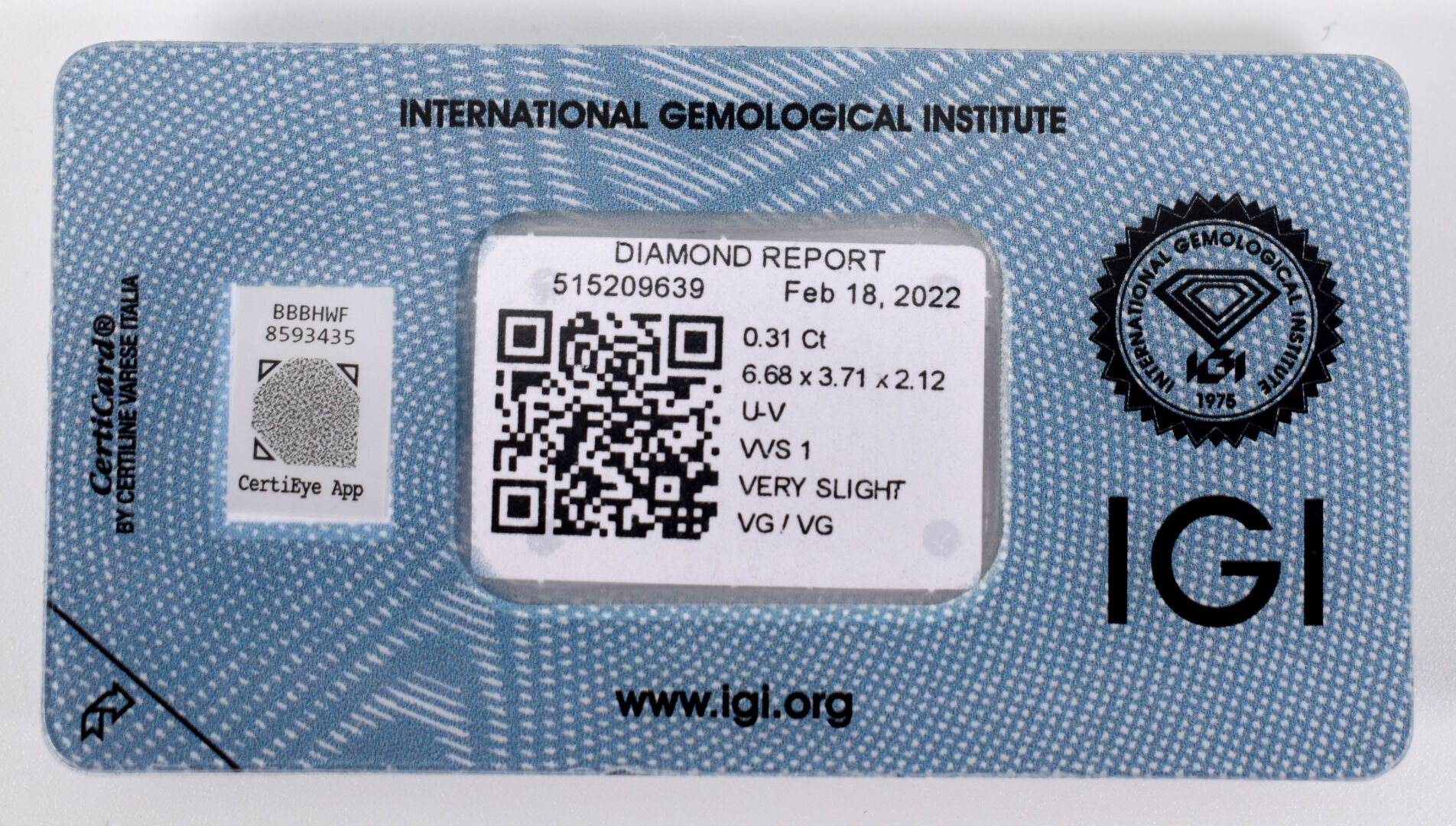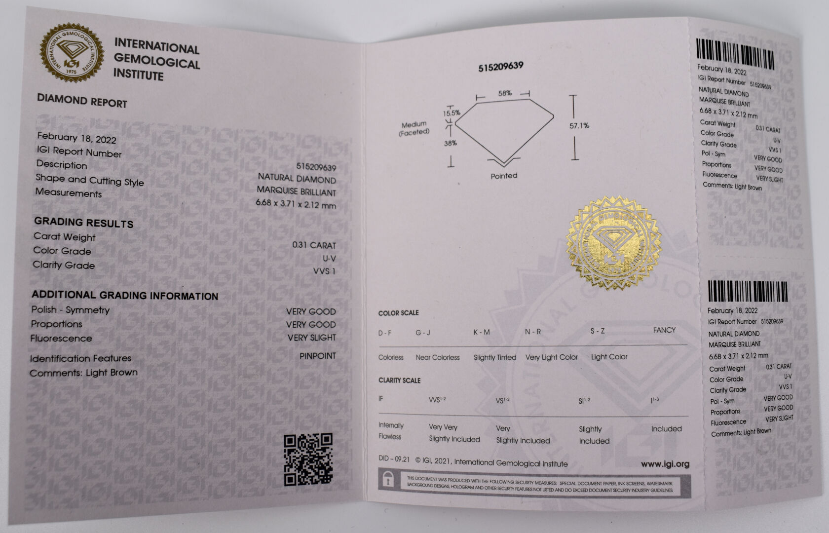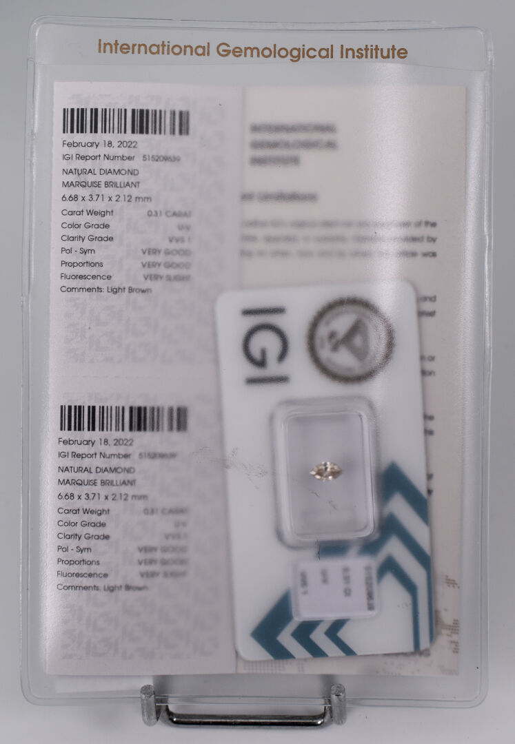 Diamant sur papier de taille marquise d’environ 0,30 carat, couleur présumée U-V et pureté VVS1. Avec certificat IGI.