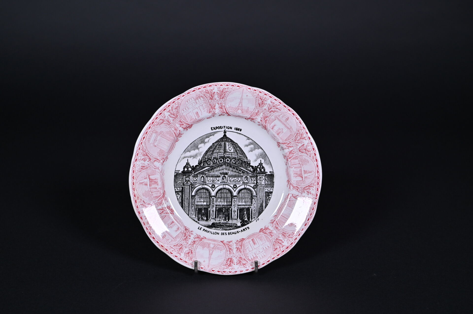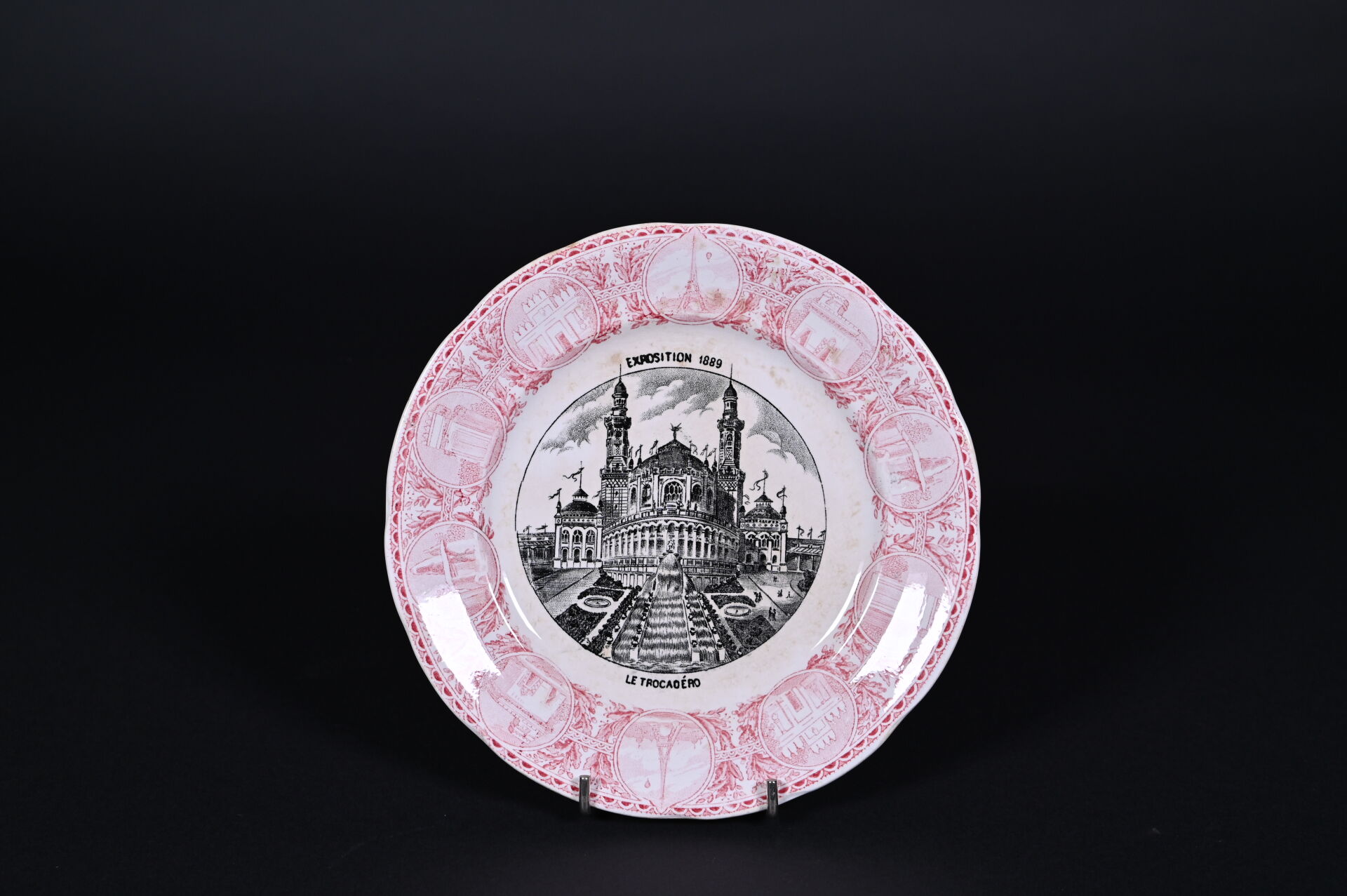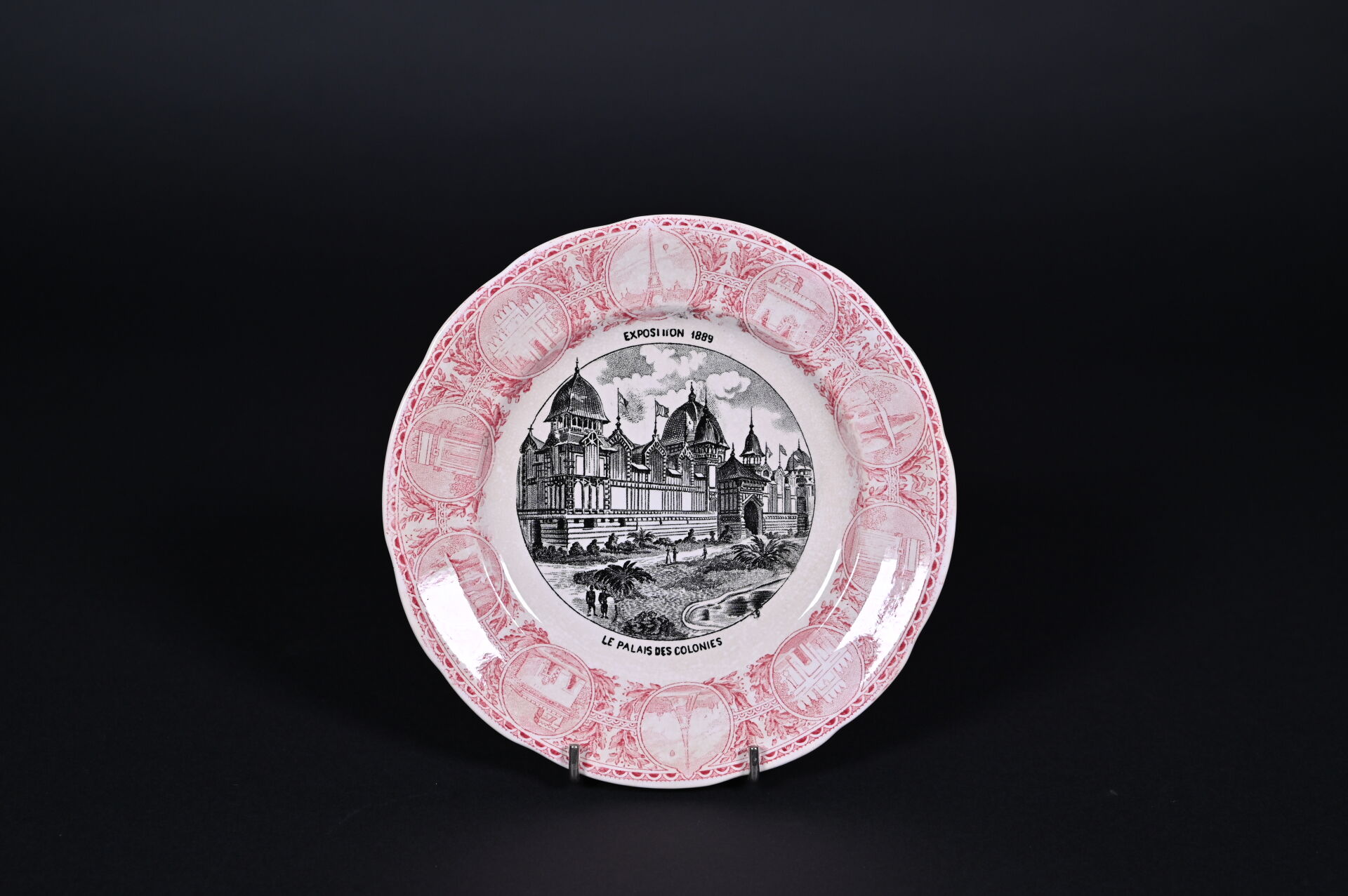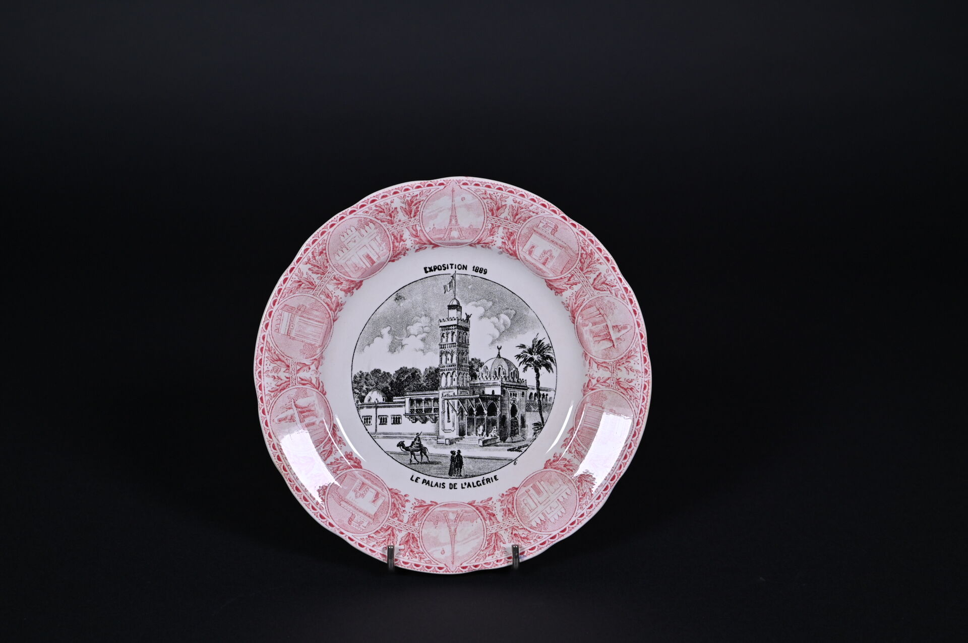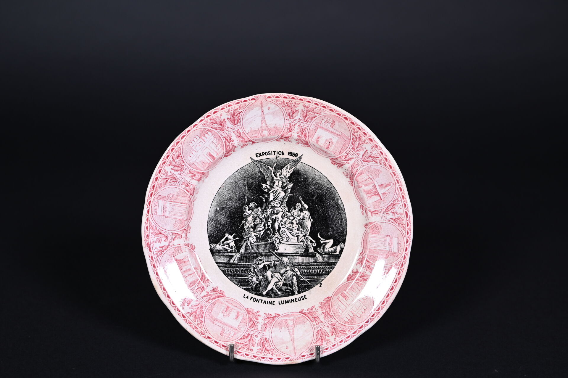 DIGOIN, SARREGUEMINES. Exposition Universelle de 1889. Suite de 9 assiettes parlantes en faïence à décor imprimé dans le bassin des Pavillons remarquables de l’exposition universelle de Paris (1889). (usures et salissures, une avec éclat). Marquées. Diam. : 19,5 cm.
