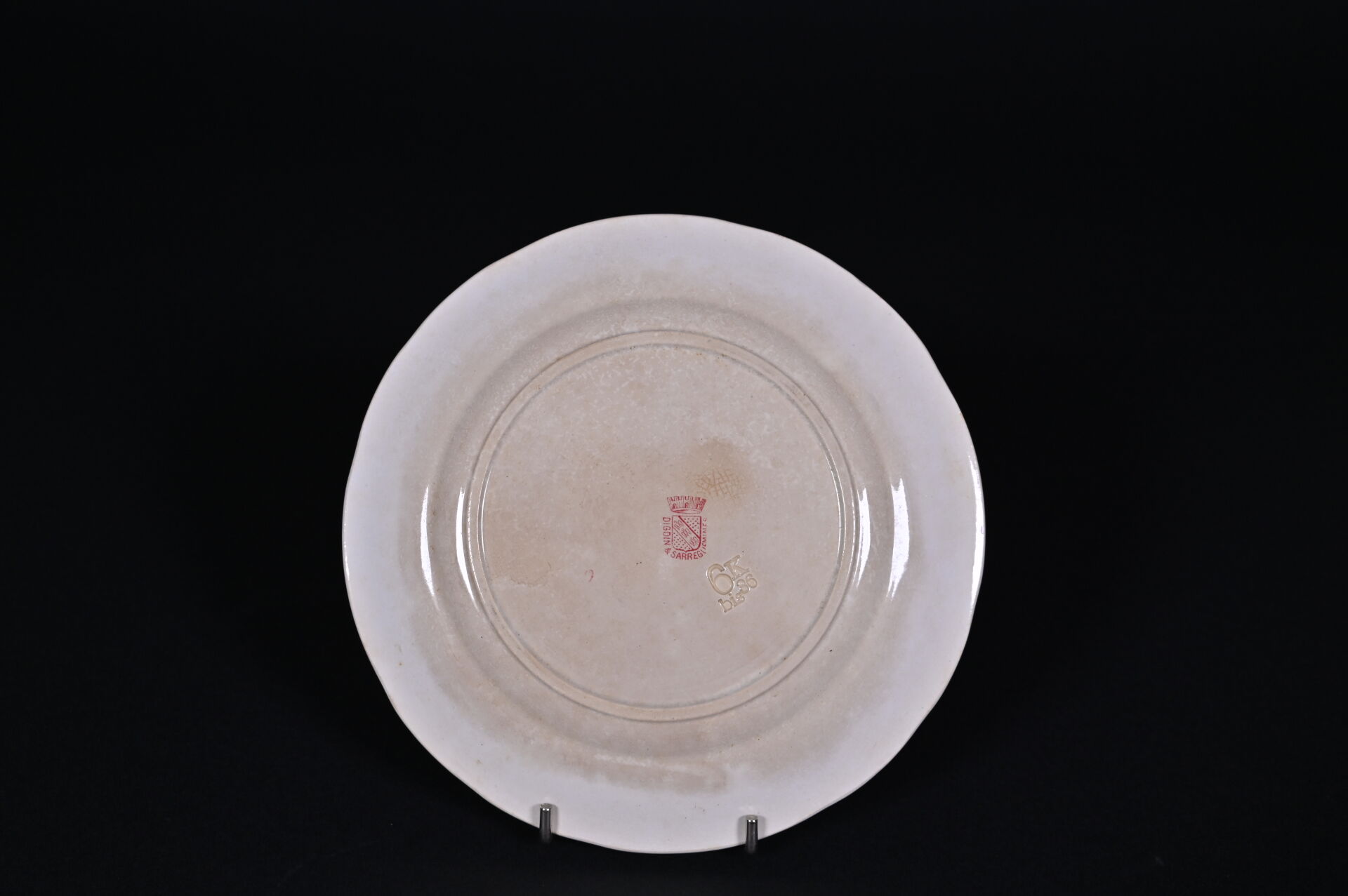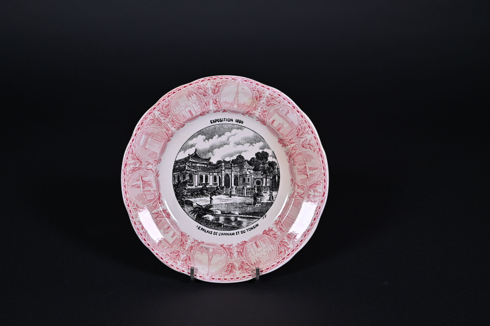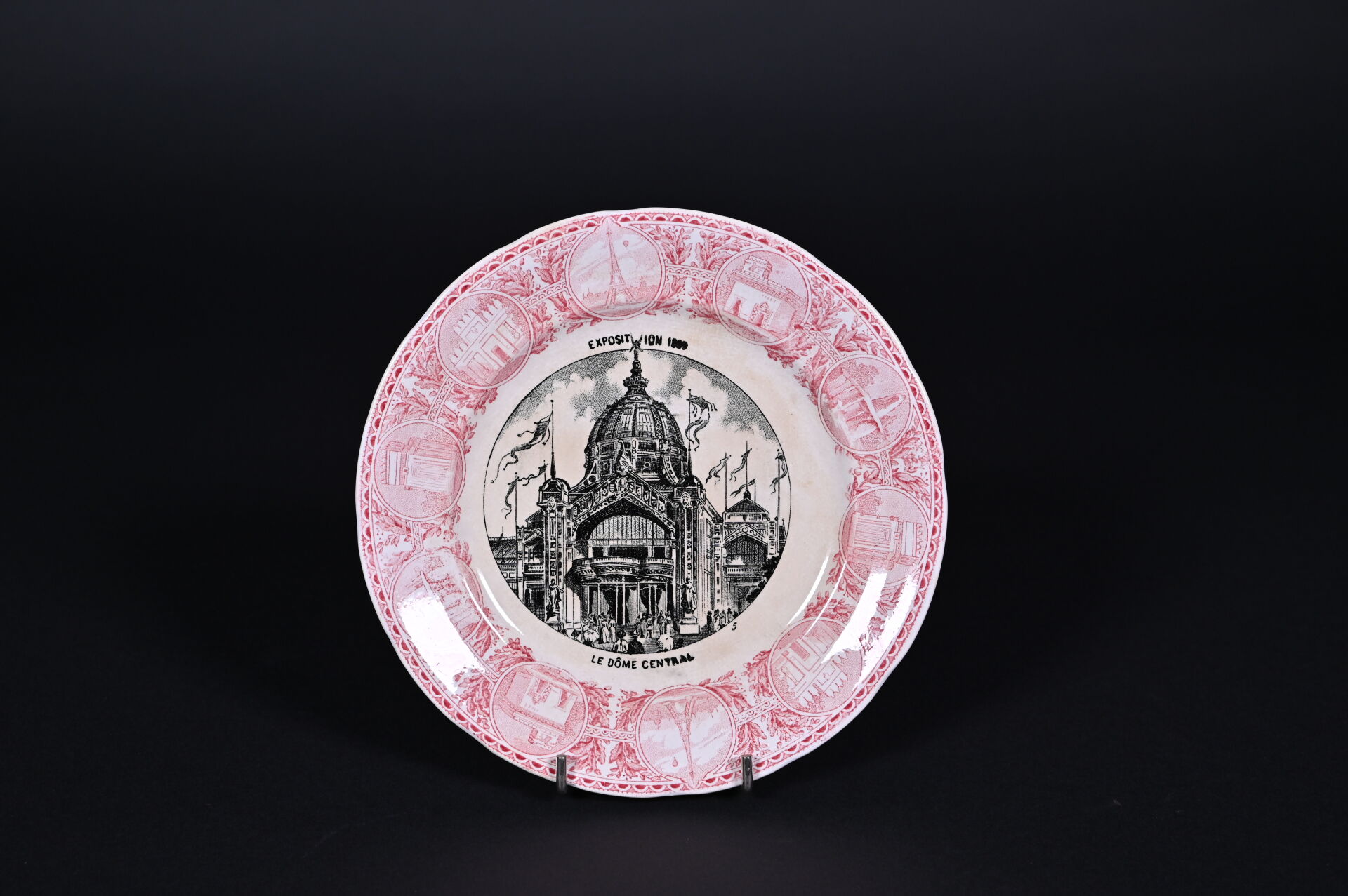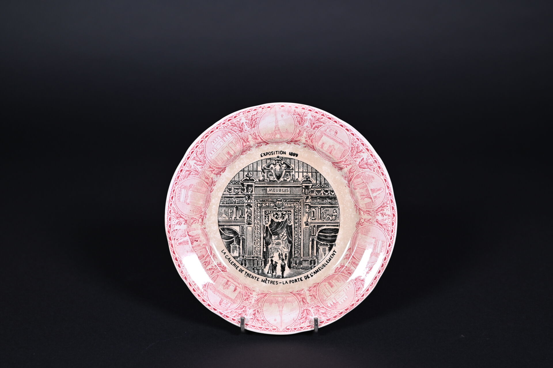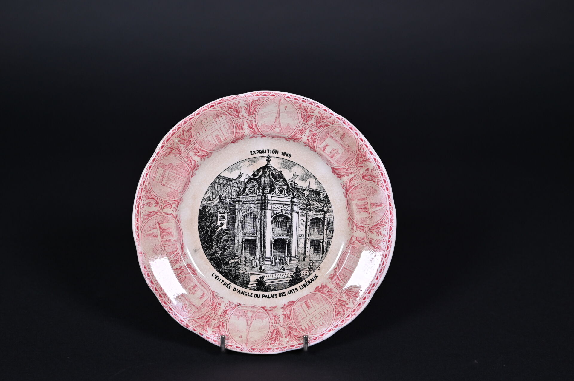 DIGOIN, SARREGUEMINES. Exposition Universelle de 1889. Suite de 9 assiettes parlantes en faïence à décor imprimé dans le bassin des Pavillons remarquables de l’exposition universelle de Paris (1889). (usures et salissures, une avec éclat). Marquées. Diam. : 19,5 cm.
