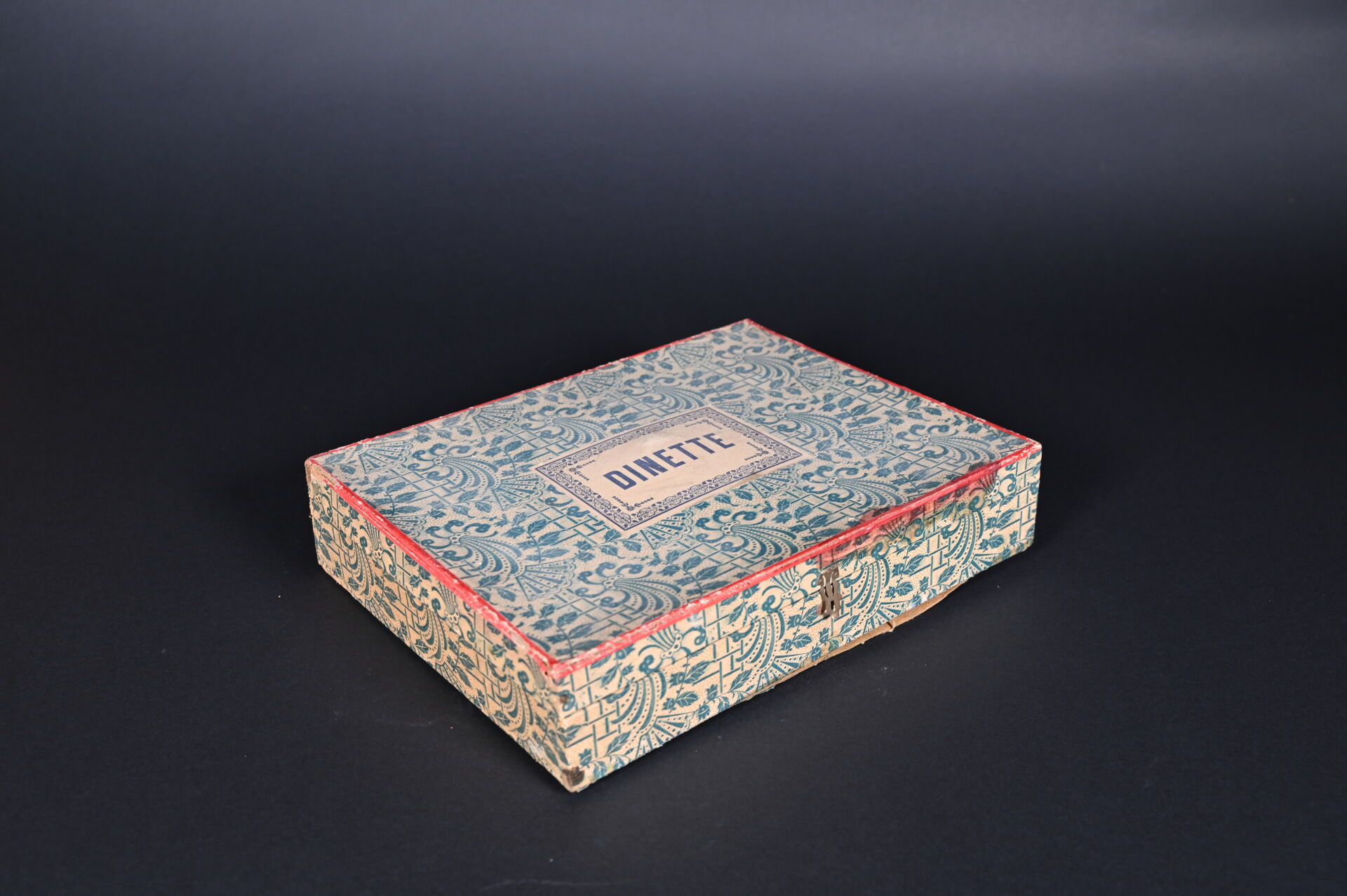 Dinette jouet de bazar des années 30, dans son cartonnage d’origine avec un service en faïence de l’Est, peinte au pochoir (usures).