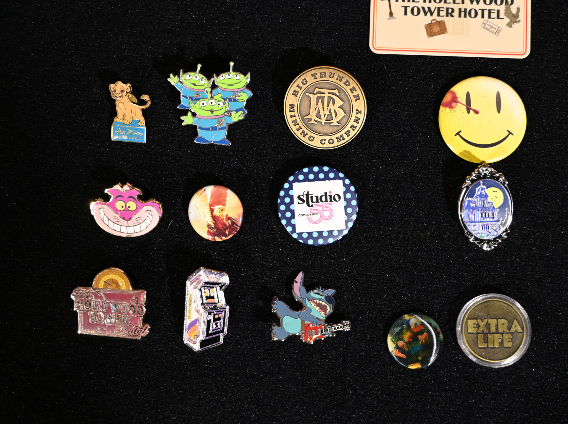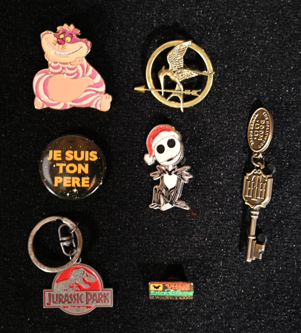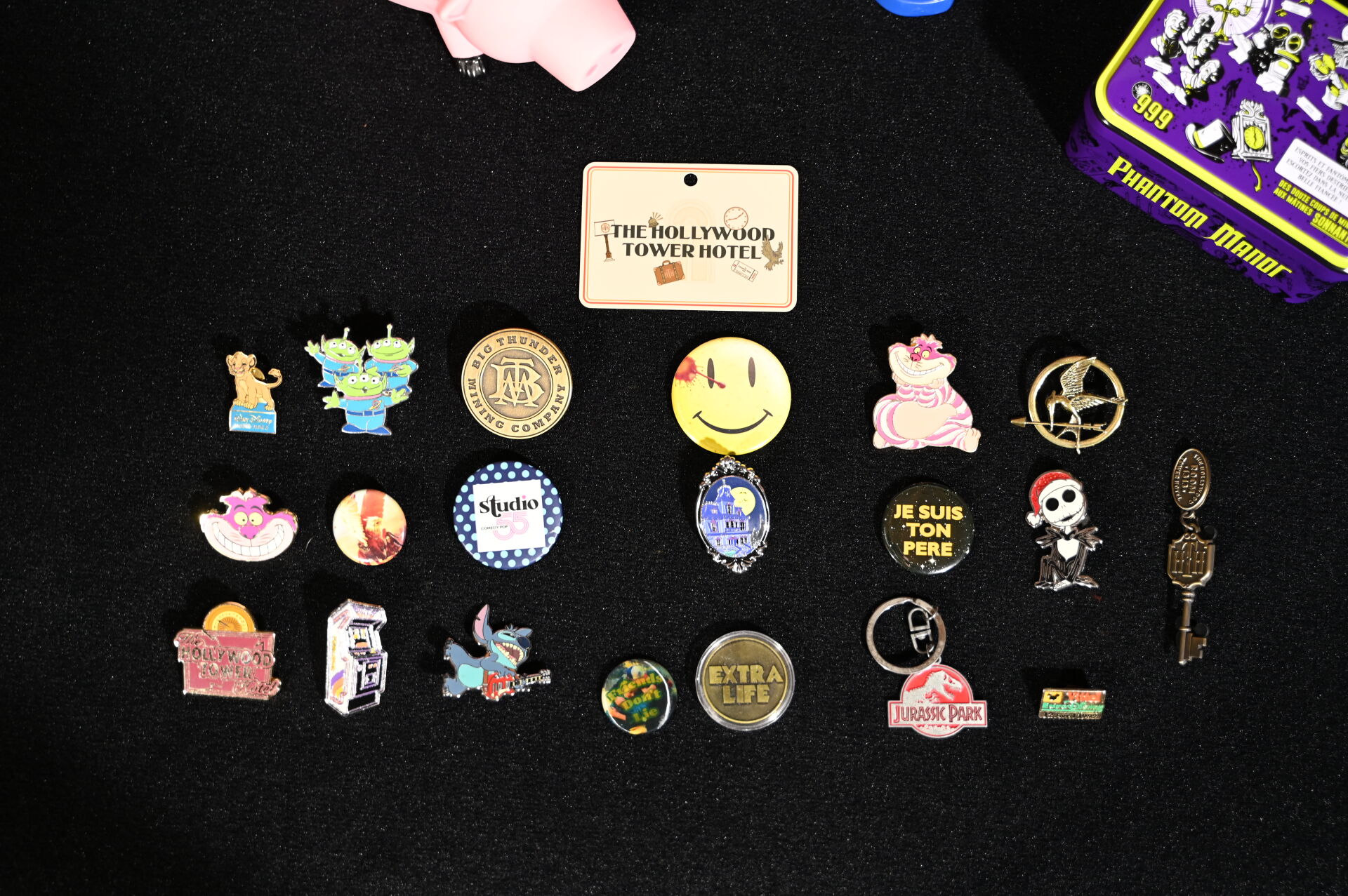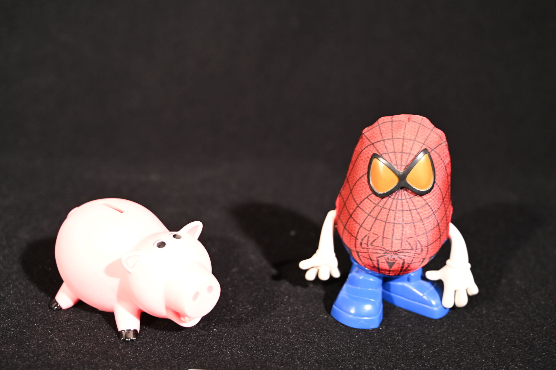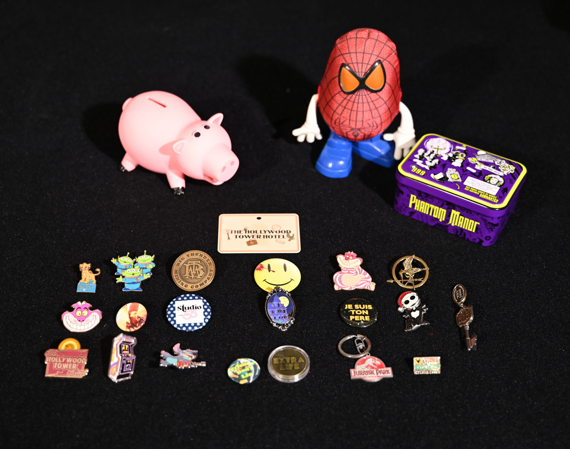 DISNEY : TOY STORY et DISNEYLAND PARIS. Deux figurines soit une tirelire du cochon Bayonne en plastique (piqures) et Monsieur Patate déguisé en Spider-Man (cassé) de HASBRO (2010). Haut. de Monsieur Patate : 17 cm. On joint une boîte « Phantom Manor » contenant des pins, badges et porte-clef variés.