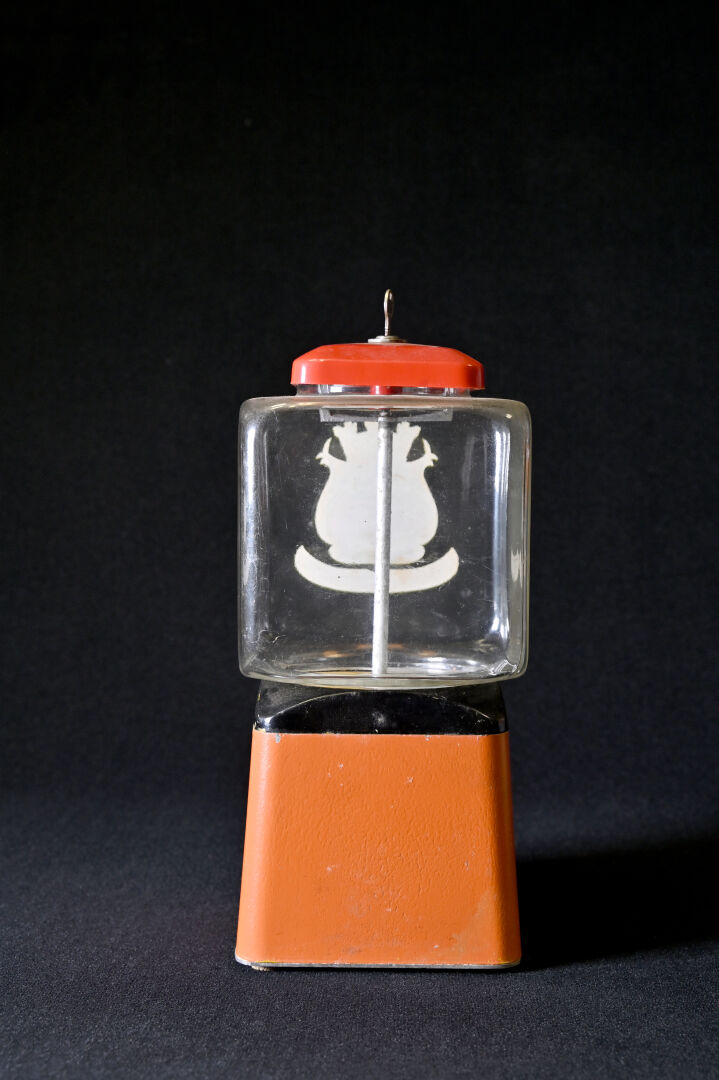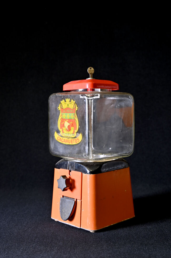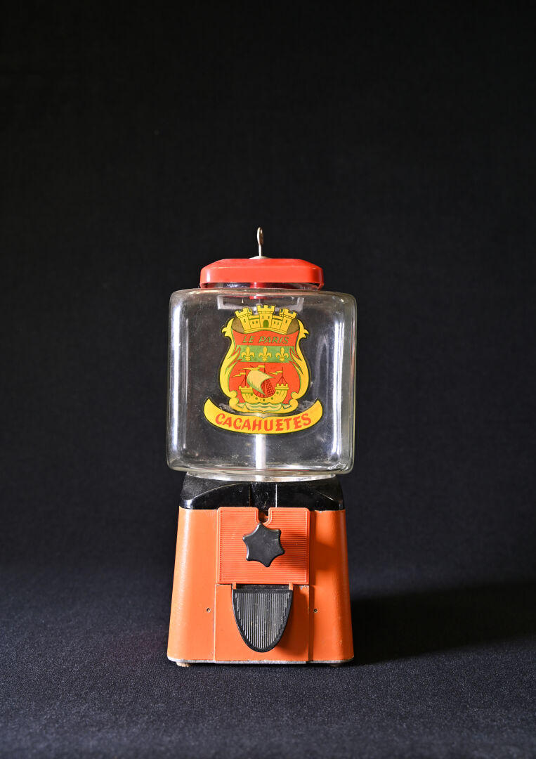 Distributeur publicitaire « Le Paris – Cacahuetes » en verre et métal orange et rouge. Haut. : 46,5 cm (avec la clé).