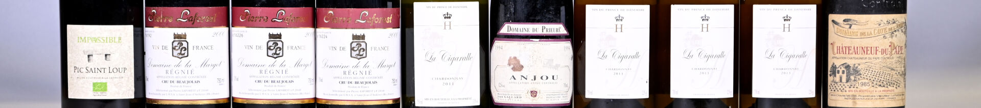 DIVERS – Ensemble de 10 bouteilles composé de : 1 bouteille, Châteauneuf-du-Pape, Domaine de la Côte de l’Ange, 1985. En l’état. 3 bouteilles, Régnié, Domaine de la Margot, 2000. En l’état. 1 bouteille, Pic Saint Loup, Les Coteaux du Pic, Impossible, 2015. En l’état. 1 bouteille, Anjou, Domaine du Prieuré, 1994. En l’état. 4 bouteilles, IGP Côtes du Lot, Vin du Prince du Danemark, La Cigarelle, Chardonnay, 2011 (1) et 2013 (3). En l’état.