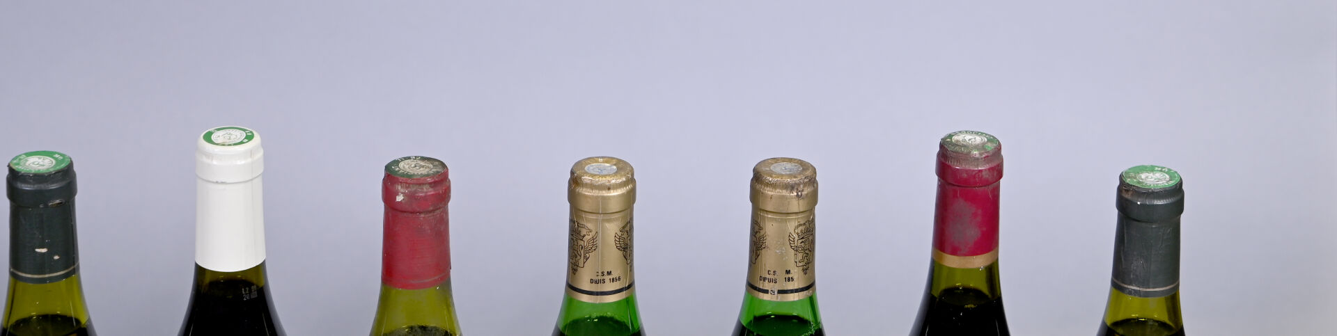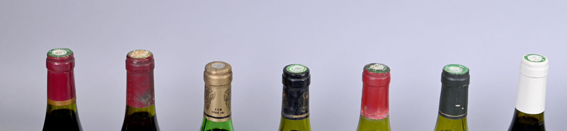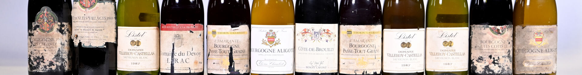 DIVERS – Ensemble de 12 bouteilles composé de : 2 bouteilles, Bourgogne Hautes Côtes de Nuits, Producteur ? Bouteilles tastevinées, peut-être 1982 ? Capsules sales. Etiquettes et contre-étiquettes très sales et dégradées. 1 bouteille, Côte de Nuits-Villages, Vaucher père et fils, bouteilles tastevinées, 1989. Capsule sale. Etiquette sale et dégradée. 2 bouteilles, Bourgogne Passe-Tout-Grains, Thorin-Chambert, 1986. En l’état. 3 bouteilles, Vin de Pays des Sables du Golfe du Lion, Domaine Villeroy-Castellas, Sauvignon Blanc, 1987. En l’état. 2 bouteilles, Bourgogne Aligoté, Thorin-Chambert, 1986. En l’état. 1 bouteille, Côte-de-Brouilly, Les Petits Fils de Benoit Lafont, 2000. En l’état. 1 bouteille, Lirac, Domaine du Devoy, 1985. En l’état.