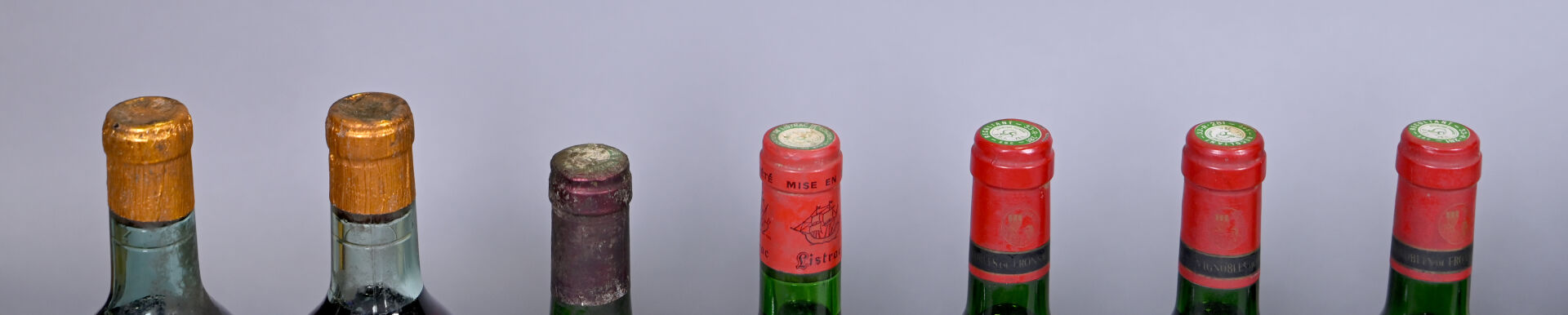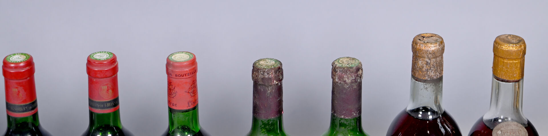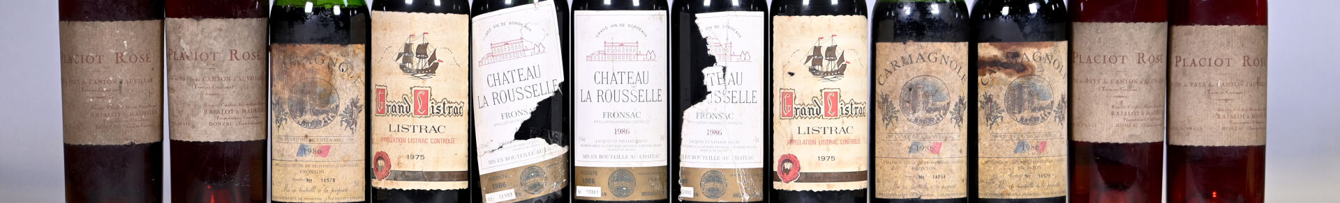 DIVERS – Ensemble de 12 bouteilles composé de : 3 bouteilles, Fronsac, Château La Rousselle, 1986 (ou supposé de ce millésime pour une bouteille). En l’état. 2 bouteilles, Listrac, Grand Listrac, 1975. En l’état. 3 bouteilles, Côtes du Frontonnais, Cave Coopérative de Fronton, Carmagnole, 1986. En l’état. 4 bouteilles, Vin de Pays du Canton d’Auvillar, Rajalot et Madrière. En l’état.