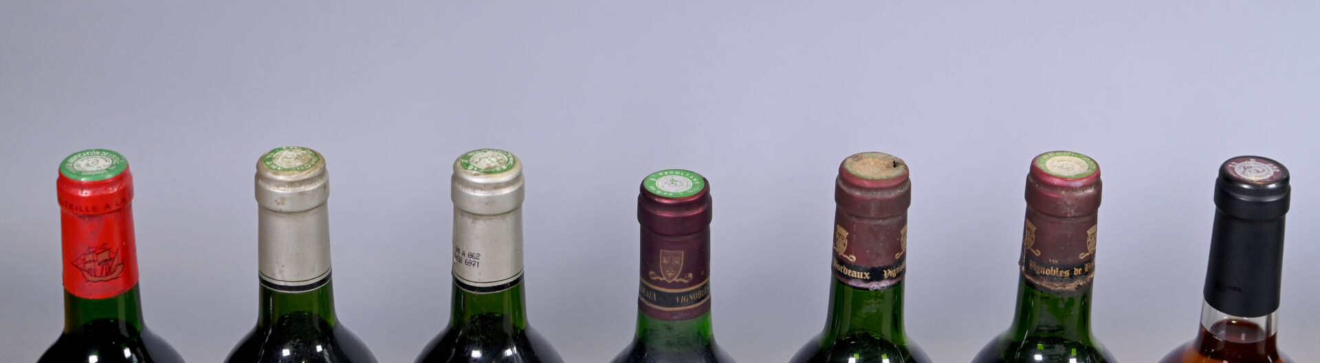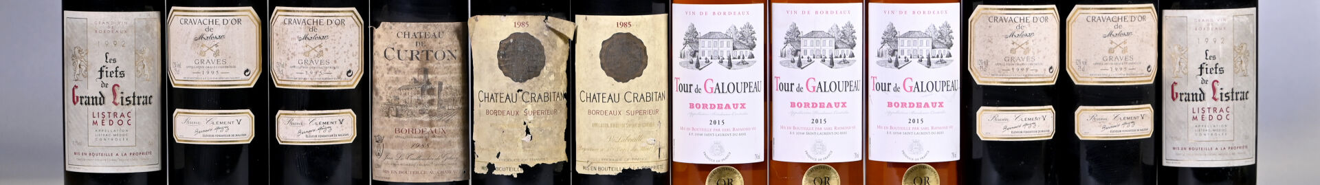 DIVERS – Ensemble de 12 bouteilles composé de : – 4 bouteilles, Graves, Cravache d’Or de Malesan, 1995. 2 bouteilles, Listrac, Les Fiefs de Grand Listrac, 1992. En l’état. 2 bouteilles, Bordeaux Supérieur, Château Crabitan, 1985. En l’état. 1 bouteille, Bordeaux, Château de Curton, 1988. En l’état. 3 bouteilles, Bordeaux rosé, Tour de Galoupeau, 2015. En l’état.
