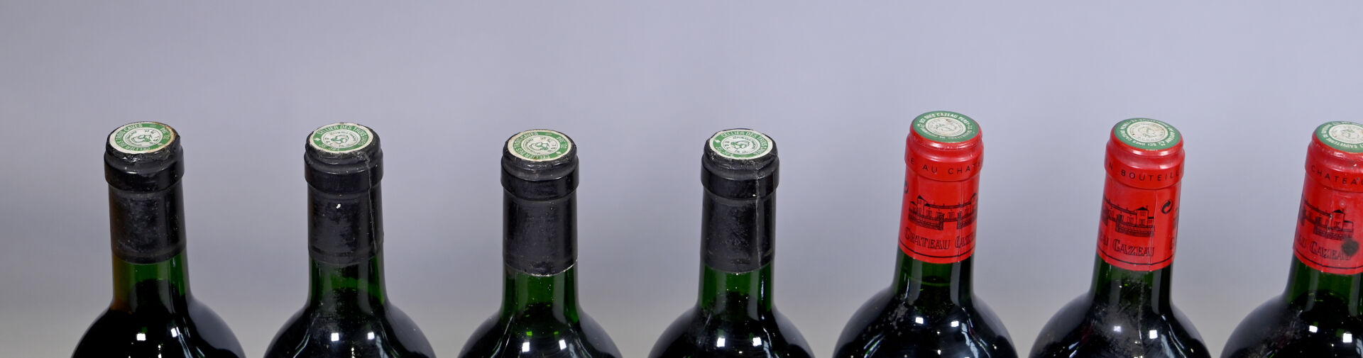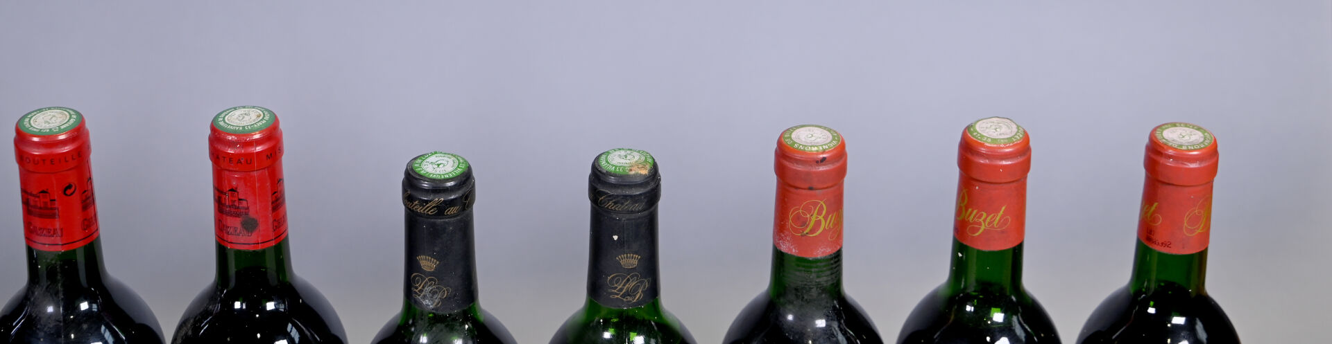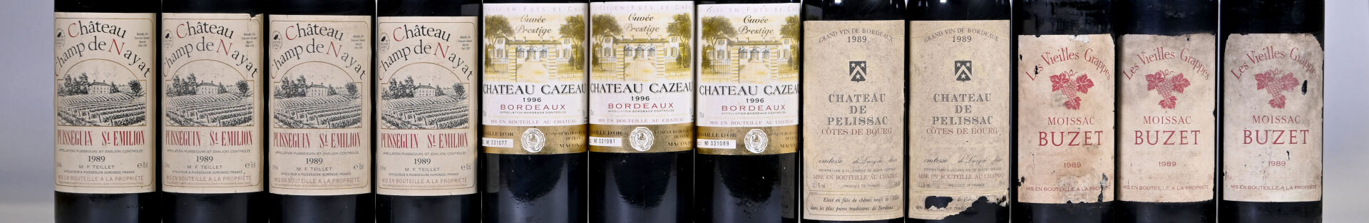 DIVERS – Ensemble de 12 bouteilles composé de : 4 bouteilles, Puisseguin Saint-Emilion, Château Champ de Nayat, 1989. En l’état. 2 bouteilles, Côtes de Bourg, Château de Pelissac, 1989. En l’état. 3 bouteilles, Bordeaux, Château Cazeau, 1996. En l’état. 3 bouteilles, Buzet, Les Vieilles Grappes, 1989. En l’état.