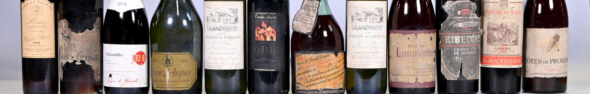 DIVERS – Ensemble de 12 flacons composé de : 1 bouteille, Cahors, Château de Camy, 1949. En l’état. 2 bouteilles, Vin de Pays de Côtes de Gascogne, Domaine du Tariquet, 1999. En l’état. 1 bouteille, Cave Coopérative de Labastide de Lévis. Rosé de Labastide. En l’état. 1 bouteille, Chiroubles, Marquis de Beaucel, 1994. En l’état. 1 bouteille, Côtes de Provence (rosé), Ogier et fils. En l’état. 1 medium (50 cl), Maury, Domaine de la Coume du Roy, Cuvée Agnès, 1998. En l’état. 1 bouteille, Côtes de Fronton, Producteur ? Millésime ? En l’état. 1 bouteille, Ribedine, Grand Vin de dessert. En l’état. 1 bouteille, Cahors, Carte Noire, 1992. En l’état. 1 bouteille, Blanquette de Limoux, Sieur d’Arques, Brut, 1978. En l’état. 1 bouteille, Jurançon, Roger Lanta, millésime ? En l’état.