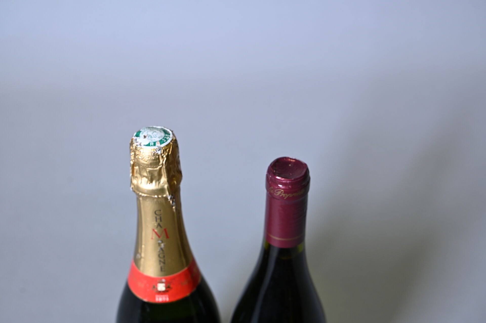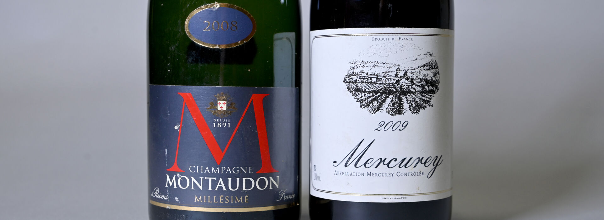 DIVERS – Ensemble de 2 bouteilles composé de : 1 bouteille, Champagne, Montaudon, Brut, millésimé 2008. Coiffe abimée avec plusieurs déchirures notamment au niveau du bouchon et de la bague et avec des traces de frottement. Etiquette légèrement abimée. 1 bouteille, Mercurey, producteur ? 2009. Capsule légèrement incurvée.