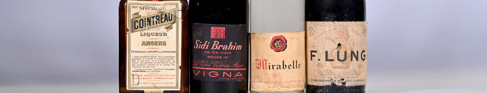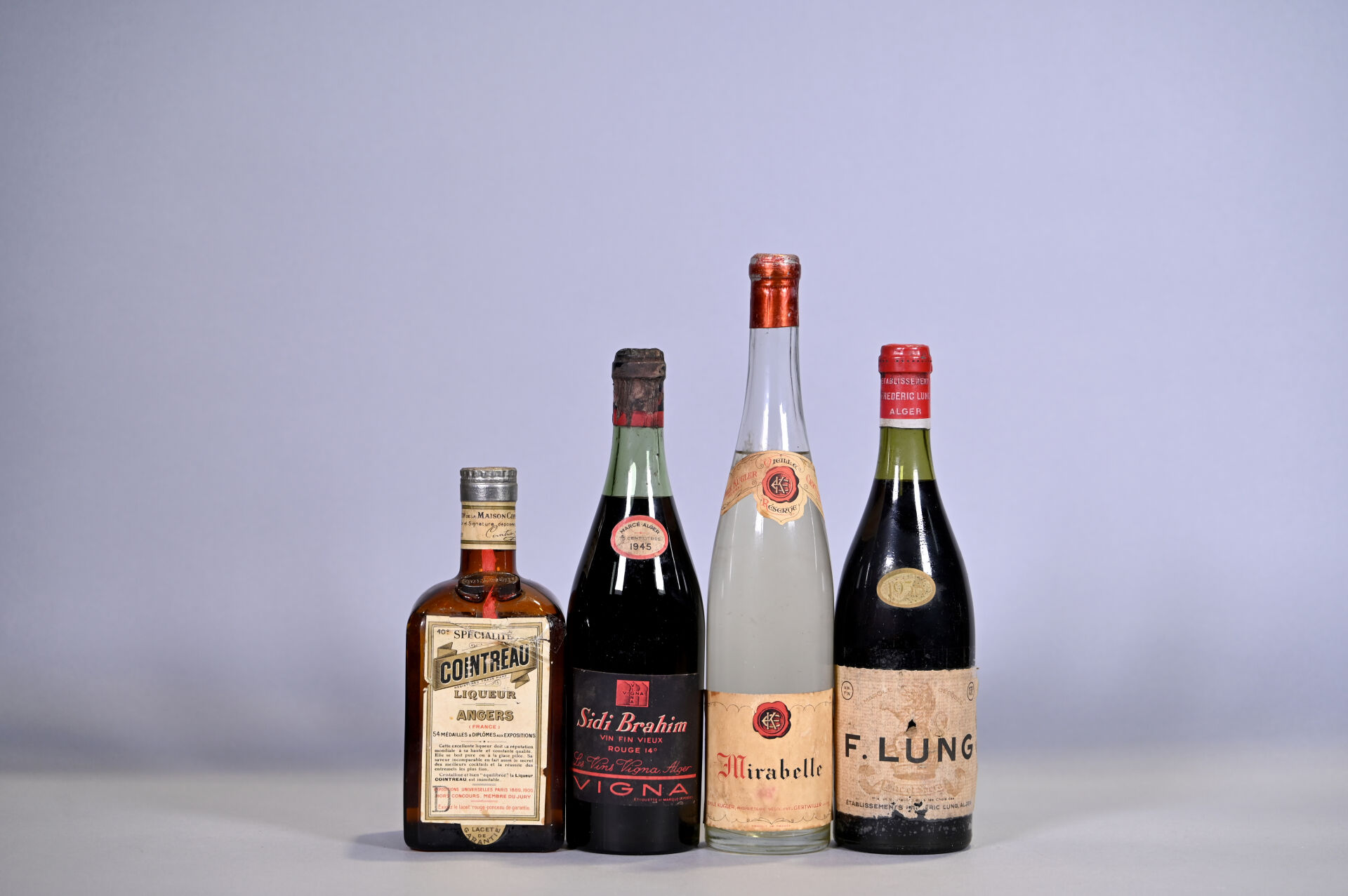 DIVERS – Ensemble de 4 flacons composé de : 1 bouteille, Les Vins Vigna, Sidi Brahim, Marcé Alger 1945. 4 cm. Capsule sale avec des plis. Pastille légèrement sale et abimée. Etiquette sale. 1 bouteille, Etablissements Frédéric Lung, Alger, 1938. 3 cm. Capsule légèrement sale. Pastille sale. Etiquette sale, abimée et entièrement décollée. 1 flacon, Liqueur, Cointreau. Niveau à 4 cm sous la capsule. Capsule légèrement sale. Etiquette légèrement sale, légèrement abimée et décollée au niveau de son angle droit supérieur. 1 bouteille, Eau-de-Vie de Mirabelle, Emile Kugler, Mirabelle, Vieille Réserve. Niveau légèrement bas. Capsule avec des égratignures. Collerettes et étiquettes légèrement sales avec des traces d’humidité.