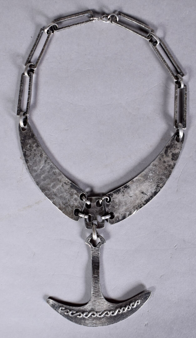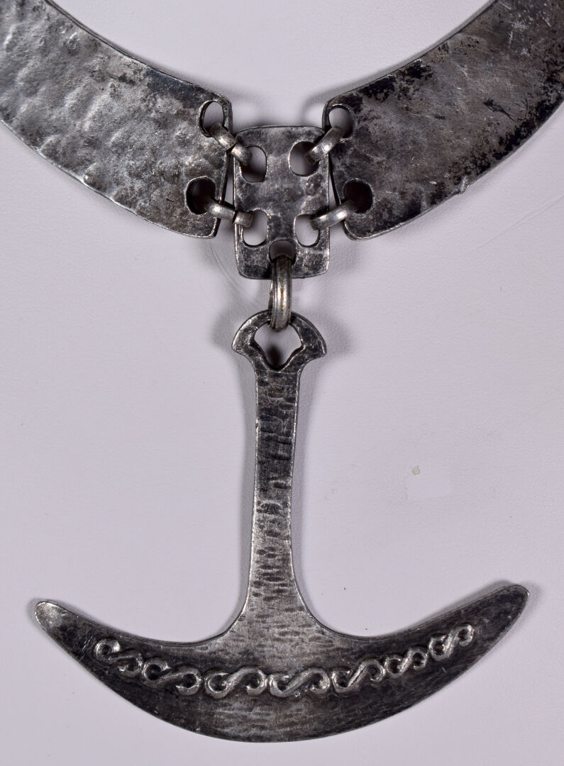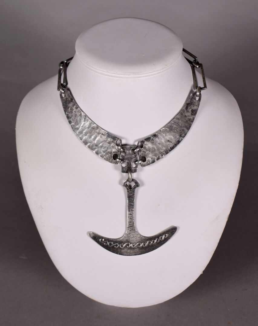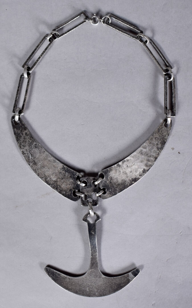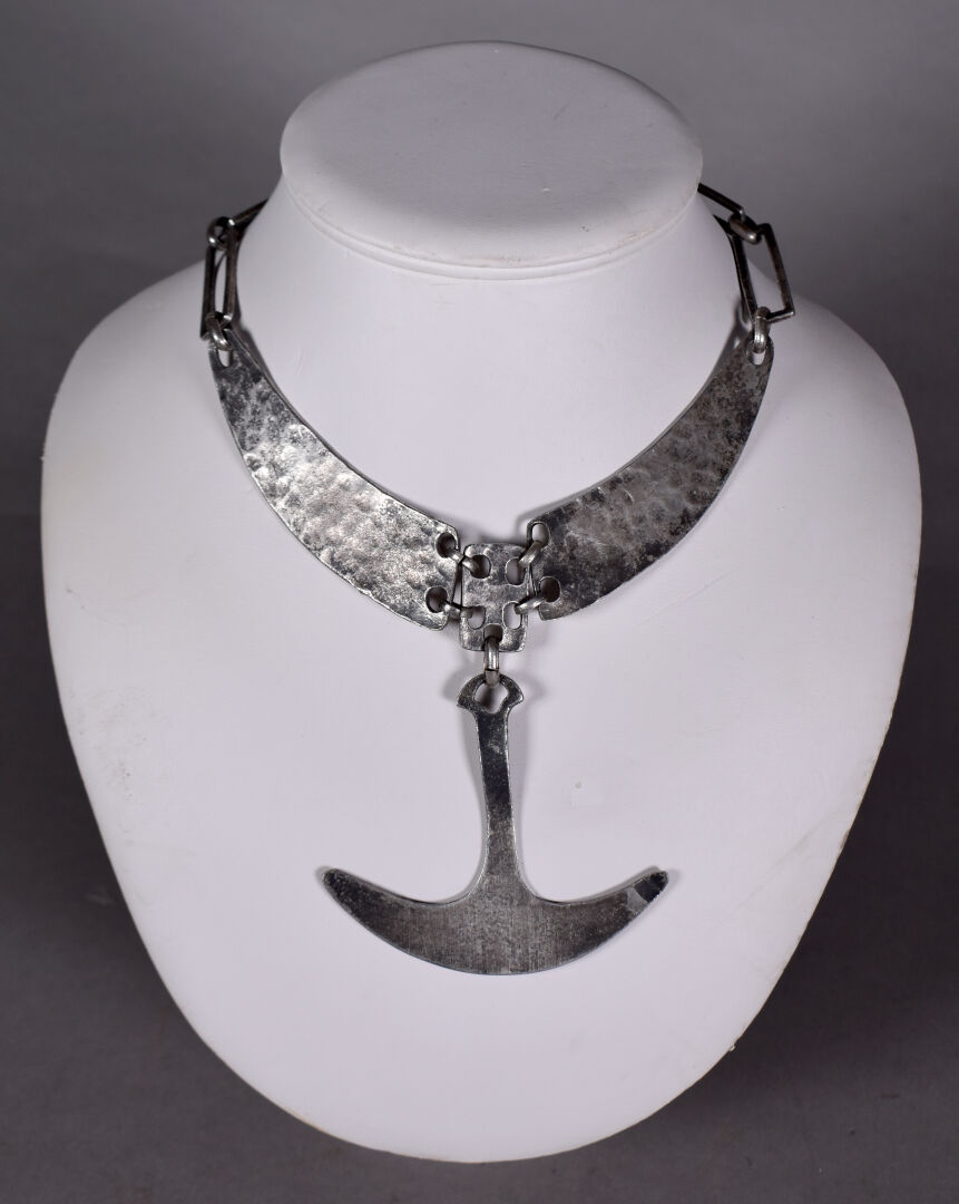 DLH. Collier plastron en métal argenté martelé (un coin plié). Monogrammé au dos. Travail des années 1970.