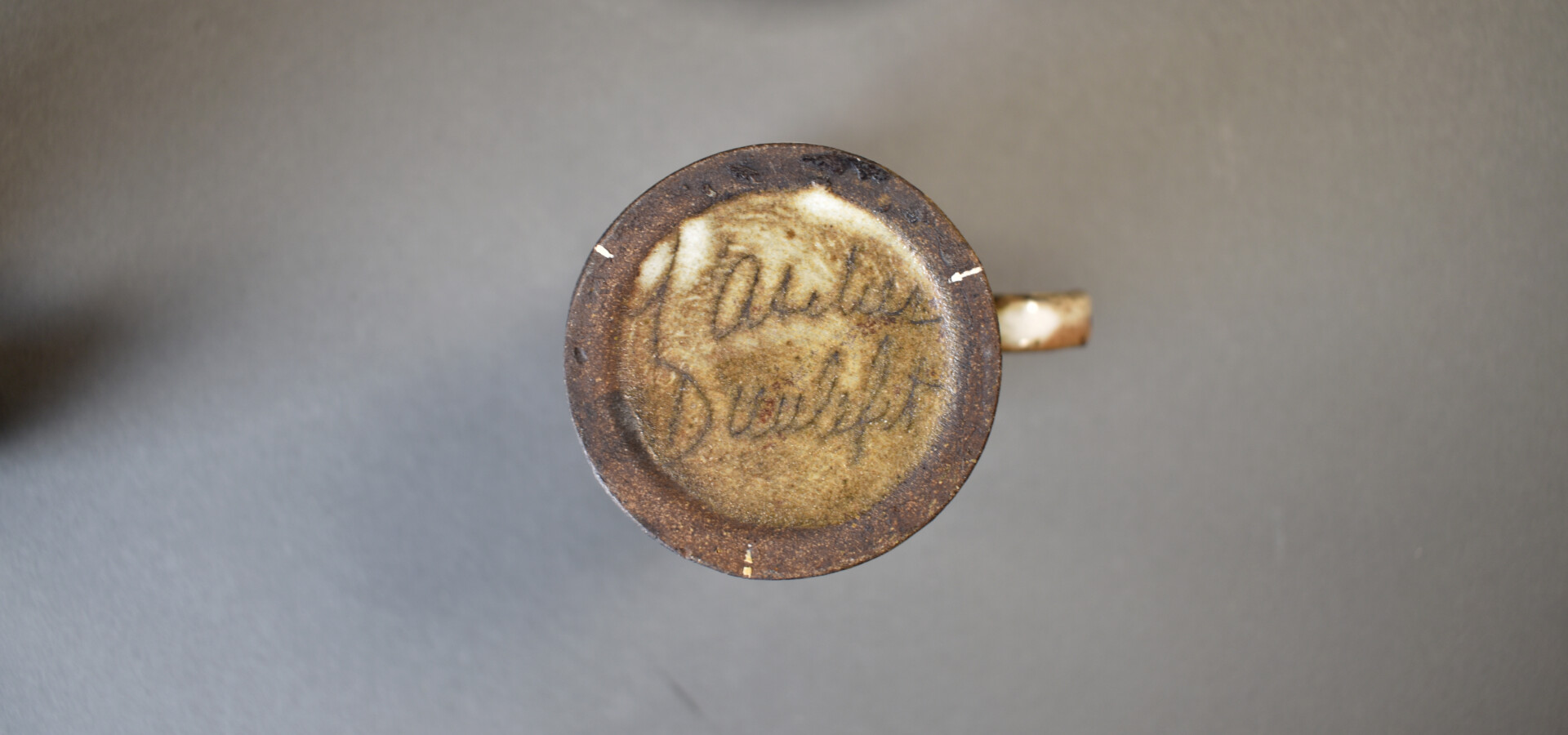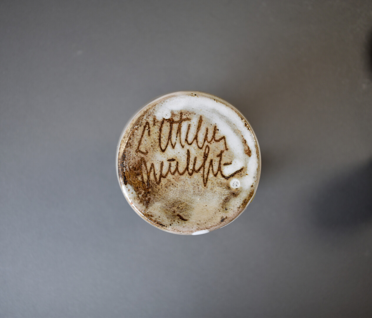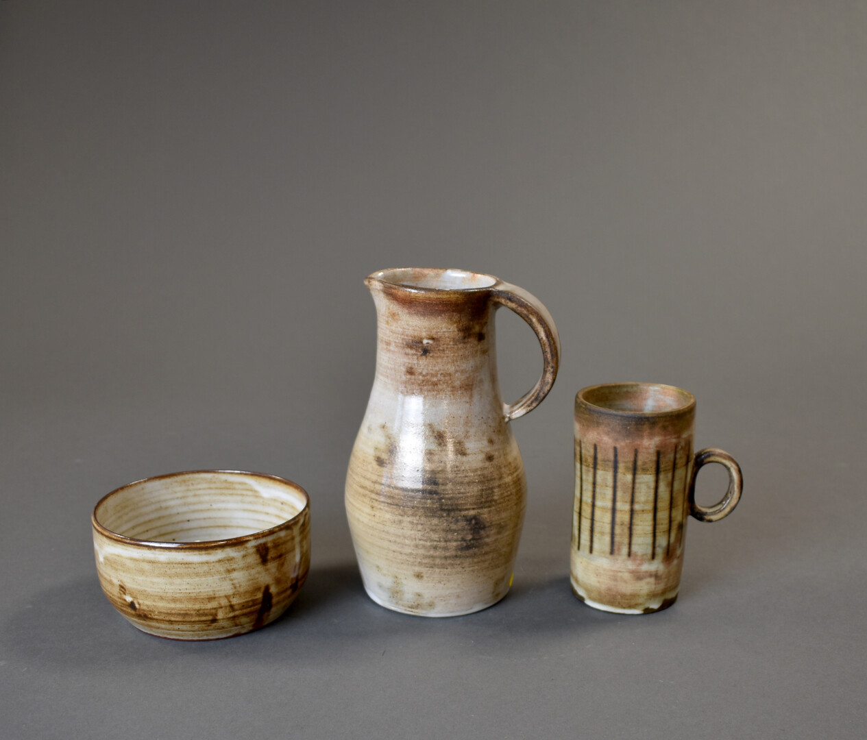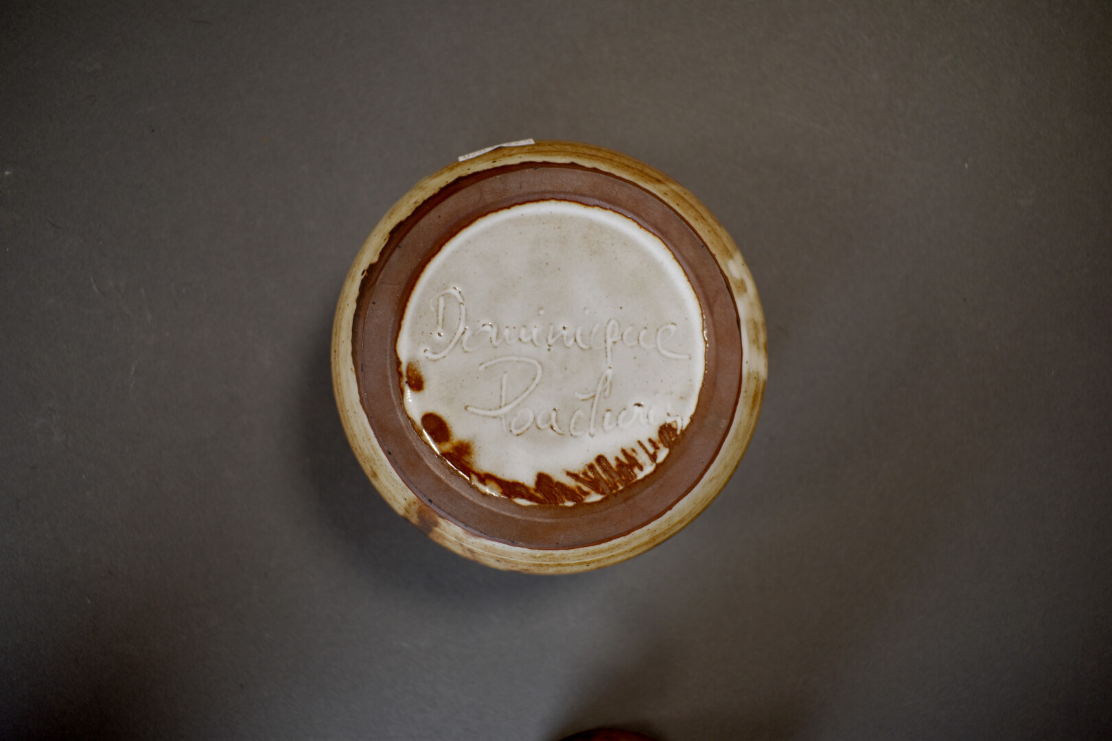 Dominique POUCHAIN (Né en 1956) – Atelier Dieulefit. Ensemble en céramique émaillée crème soit une verseuse, une tasse et une coupe. Signés. Haut. verseuse : 18,5 cm.