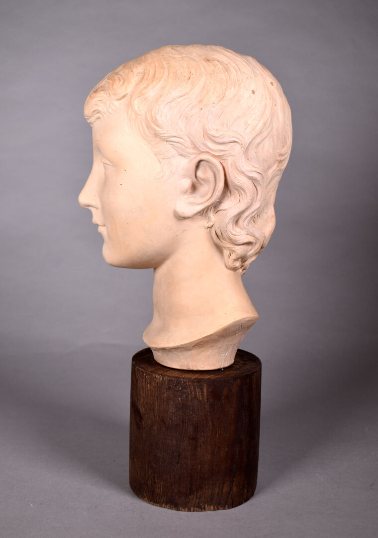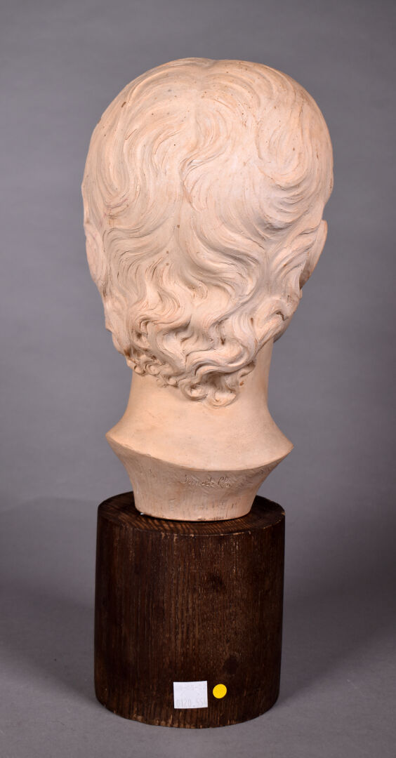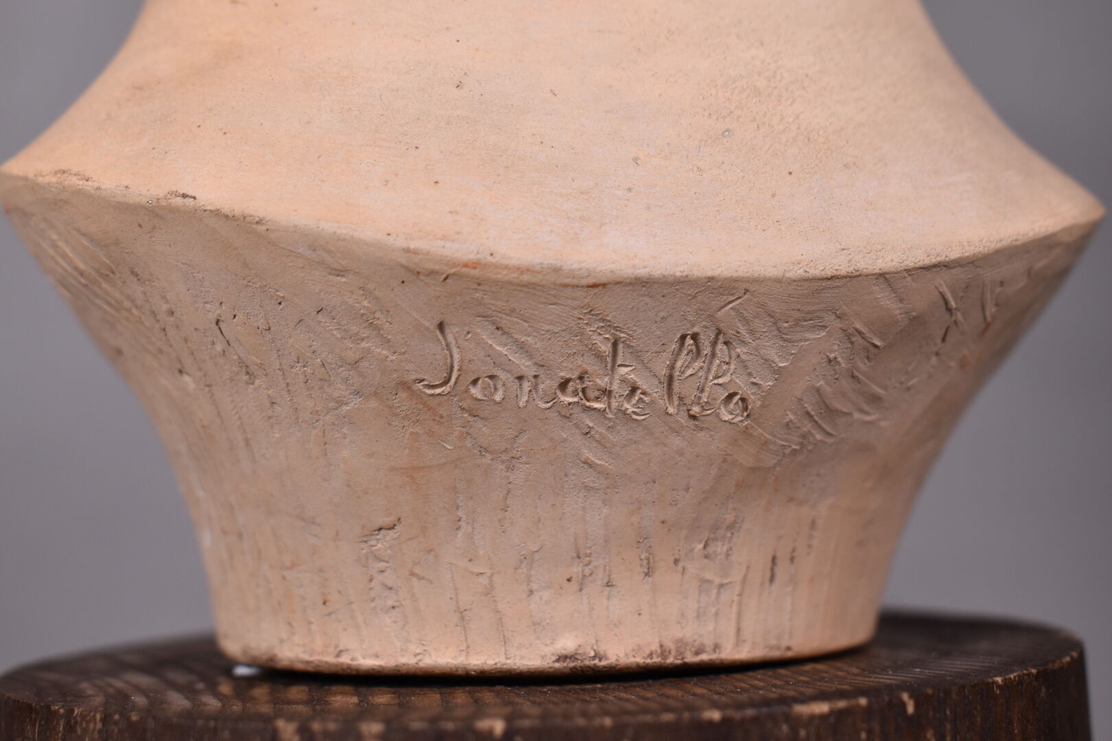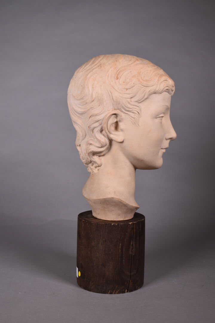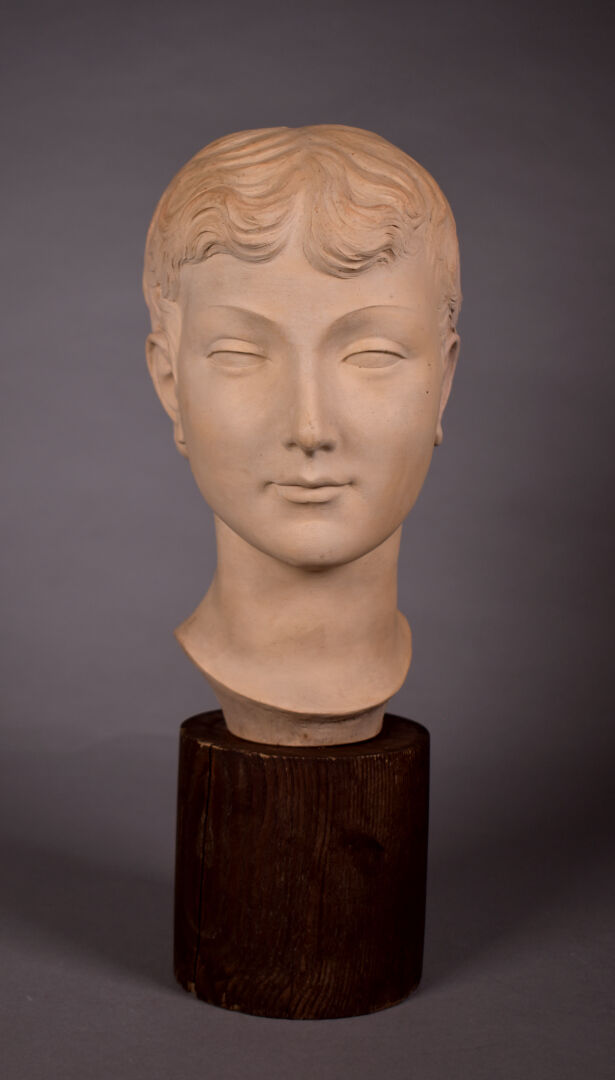 DONATELLO (XXe siècle). Tête de femme en céramique. Haut. : 28 cm. Socle de chêne tourné. Vers 1930.
