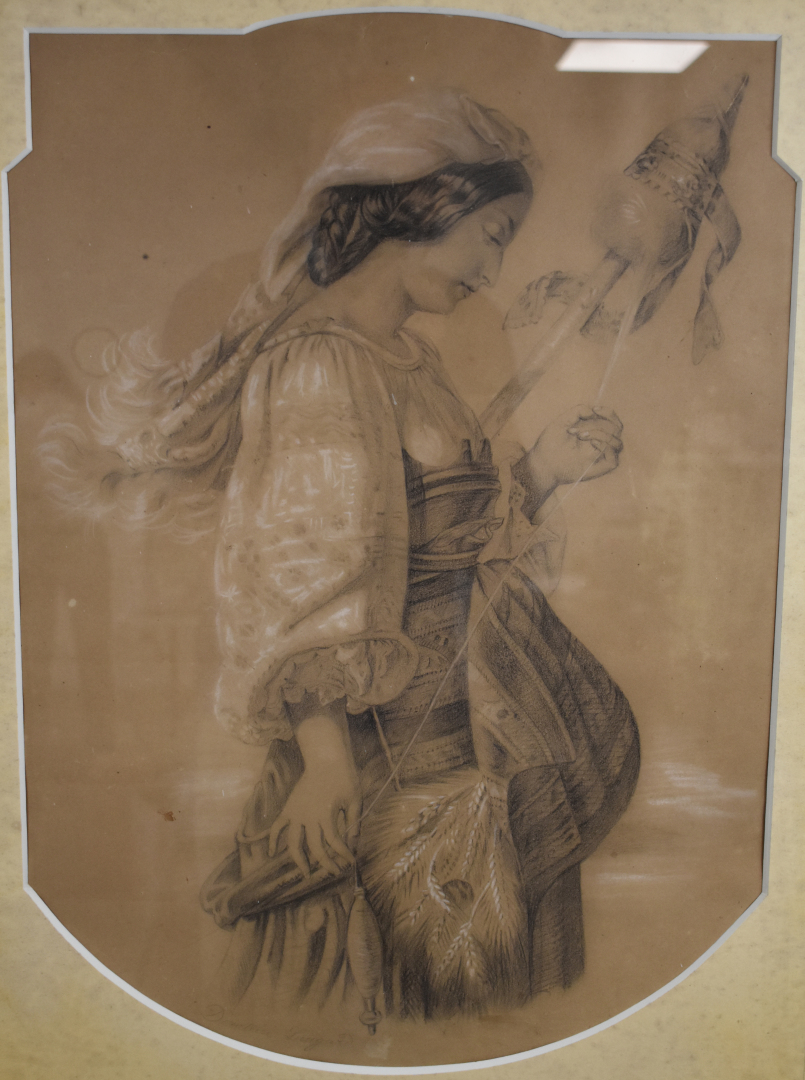 Dorothée LAUGARD (?) (XIXe – XXe siècle). Jeune tisserande. Dessin au fusain et rehauts de craie signé en bas à gauche (papier jauni). 56 x 40 cm.