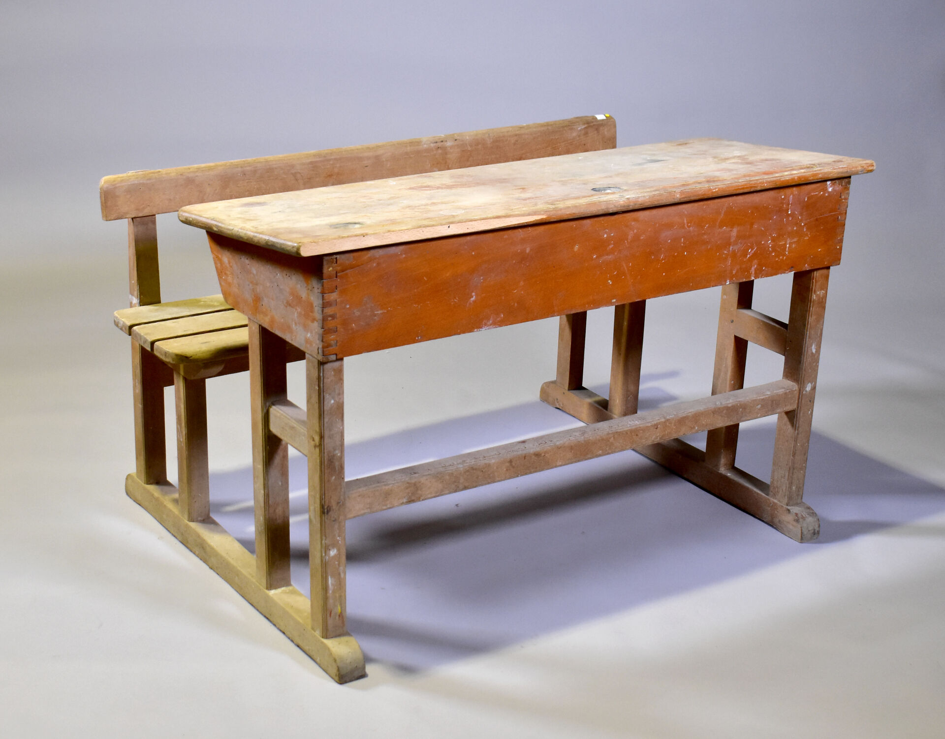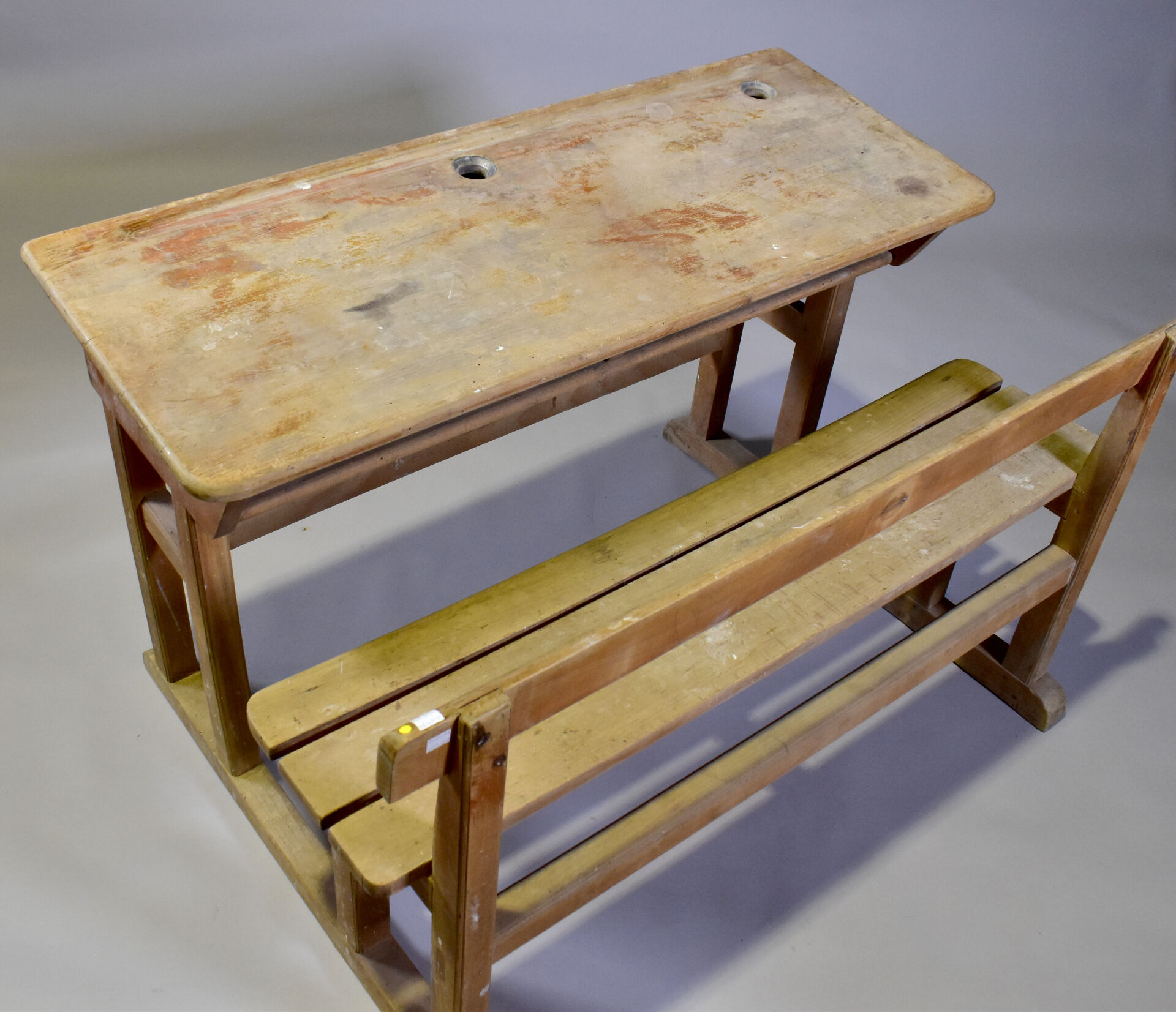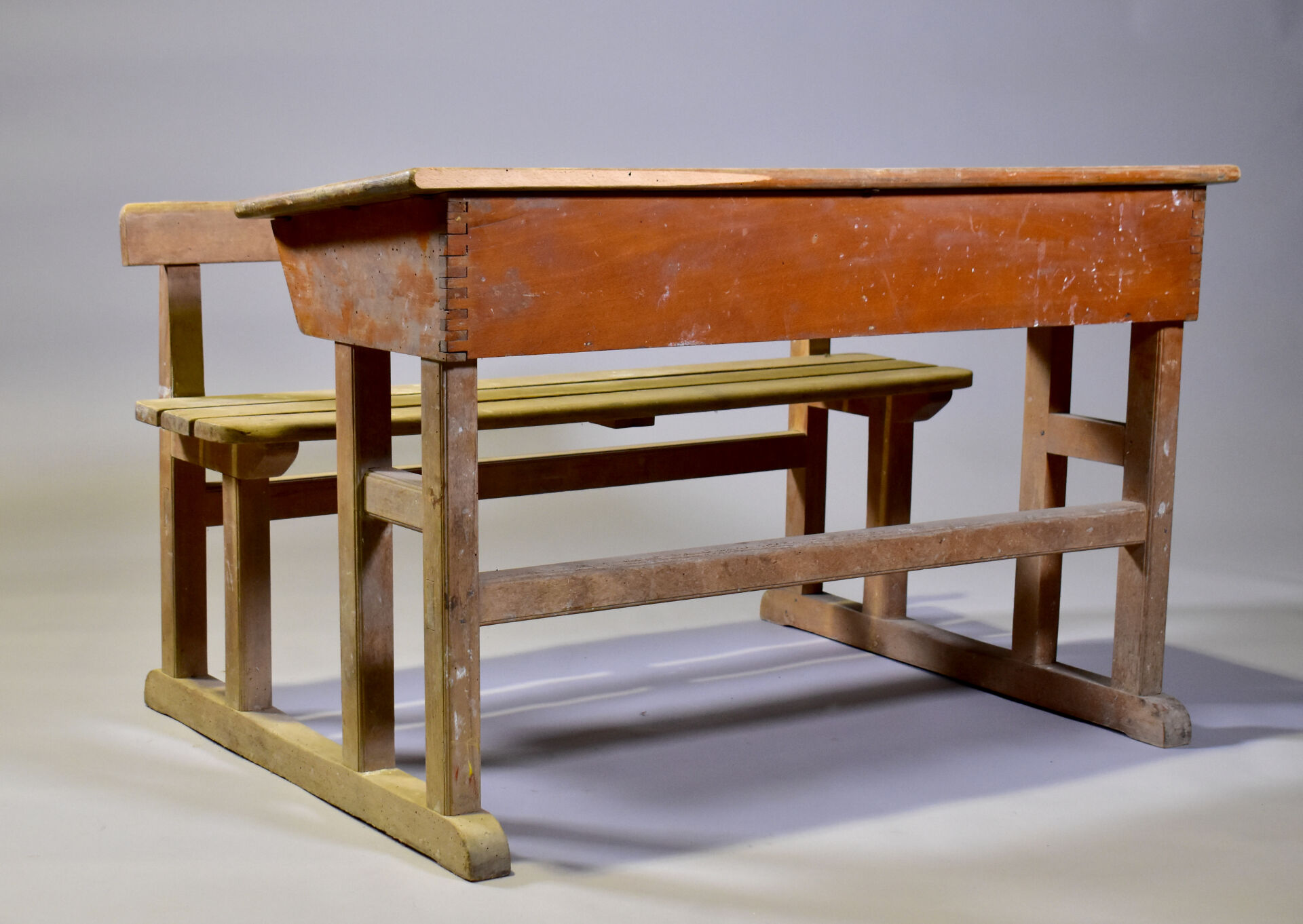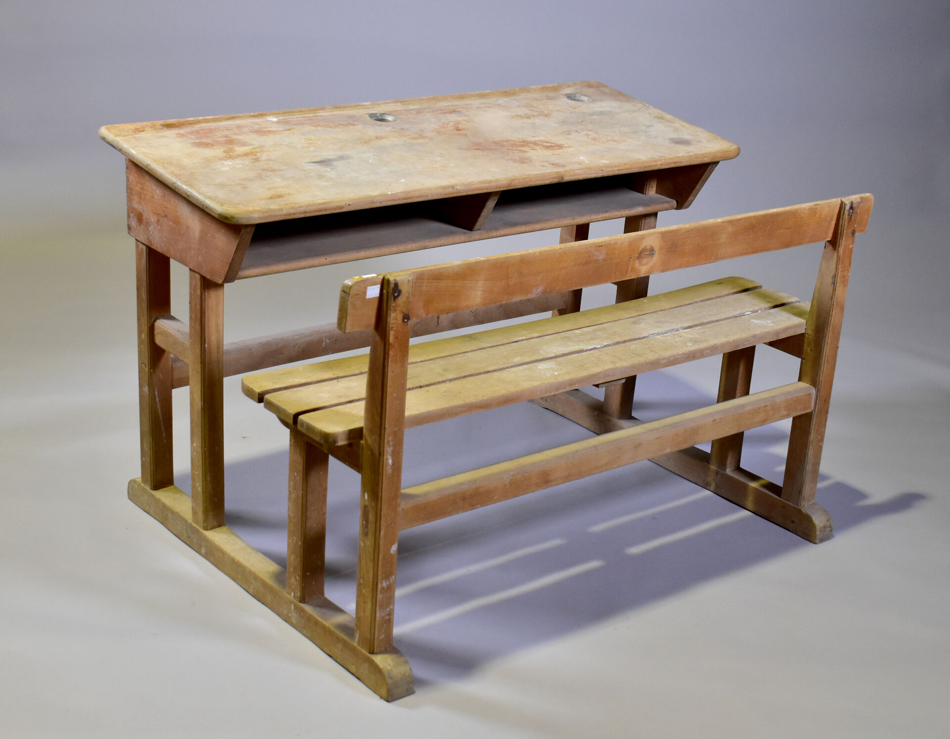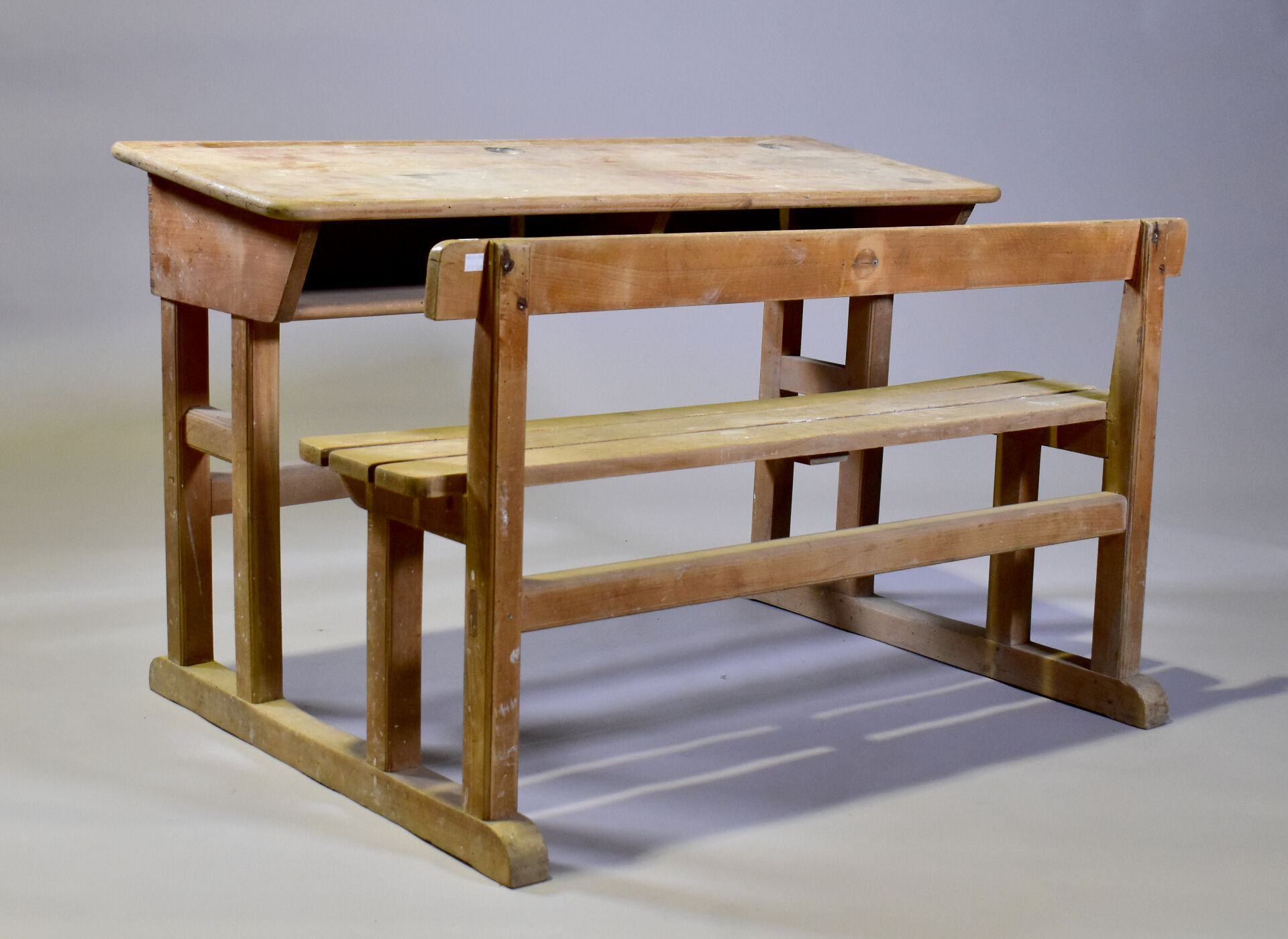 Double pupitre d’écolier en bois blond (usures d’usage). Milieu du XXe siècle. Haut. : 69 cm – Larg. : 110 cm – Prof. : 80 cm.