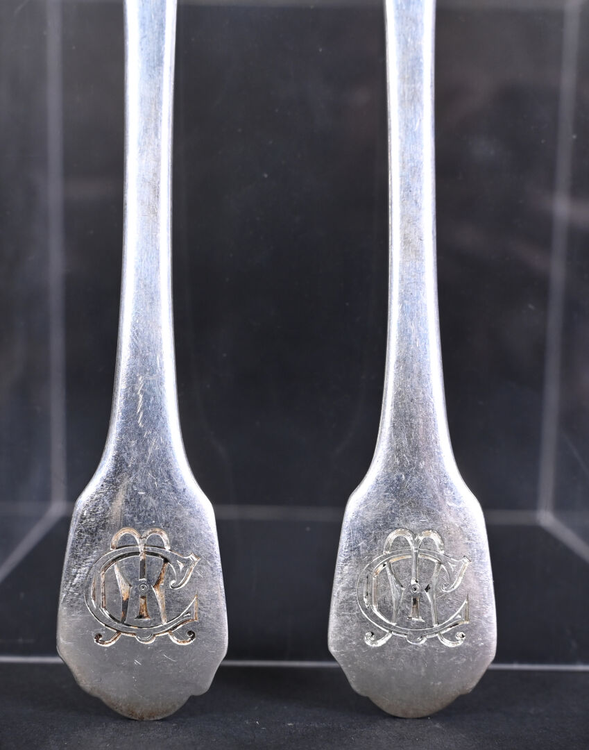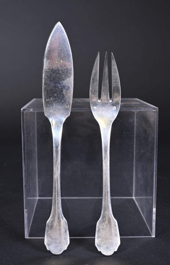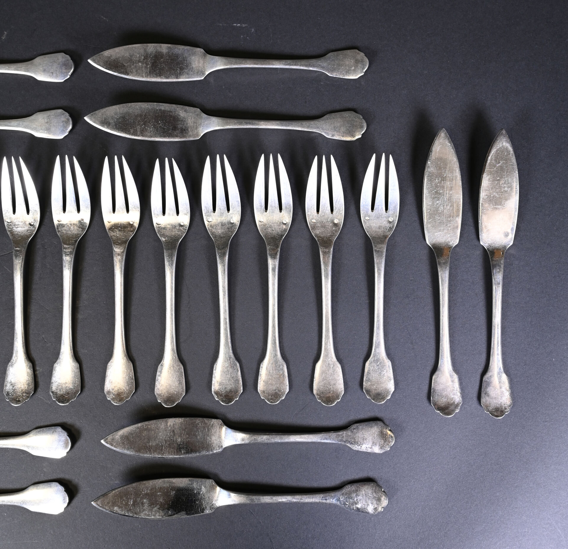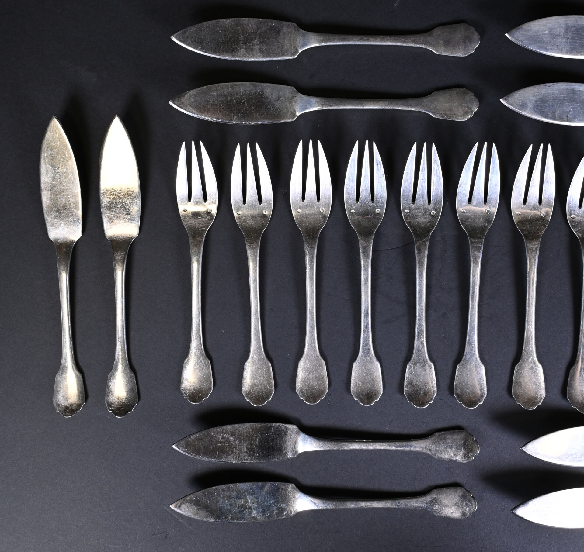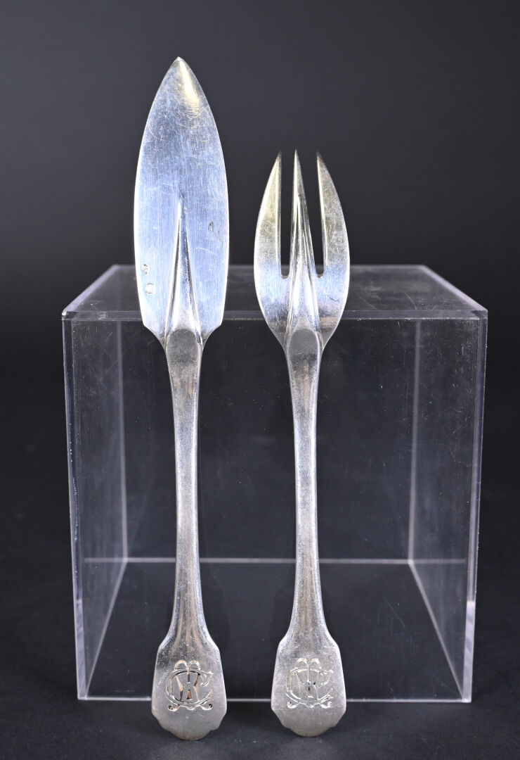Douze couverts à poisson en argent 925/1000e, la spatule chiffrée CM. Poids total : 1 591 g.