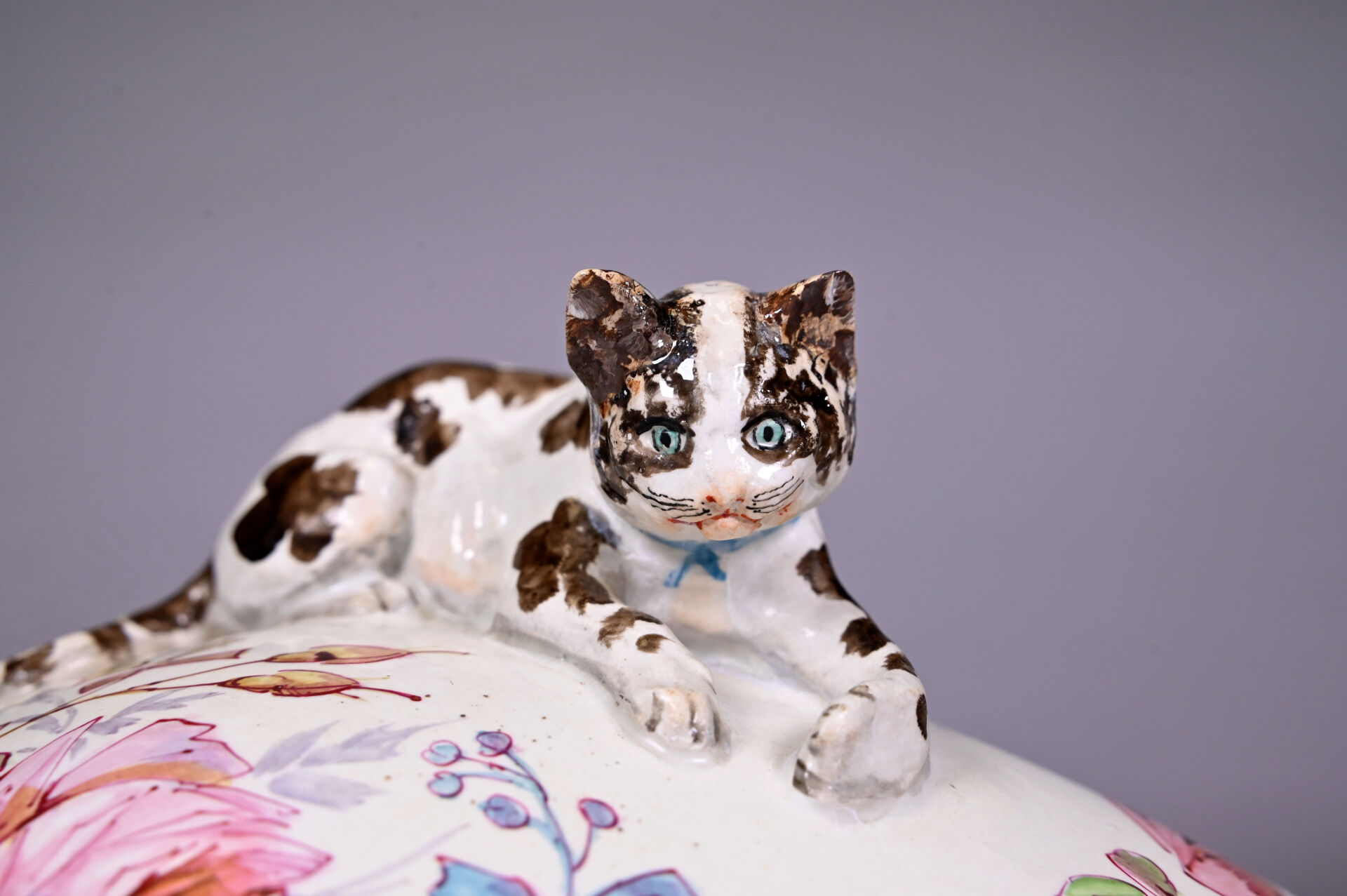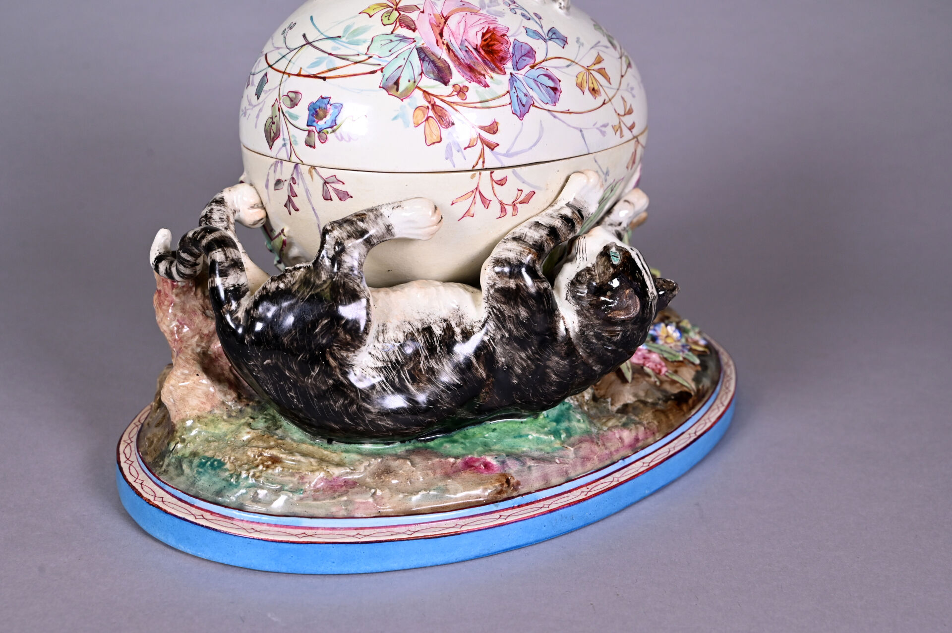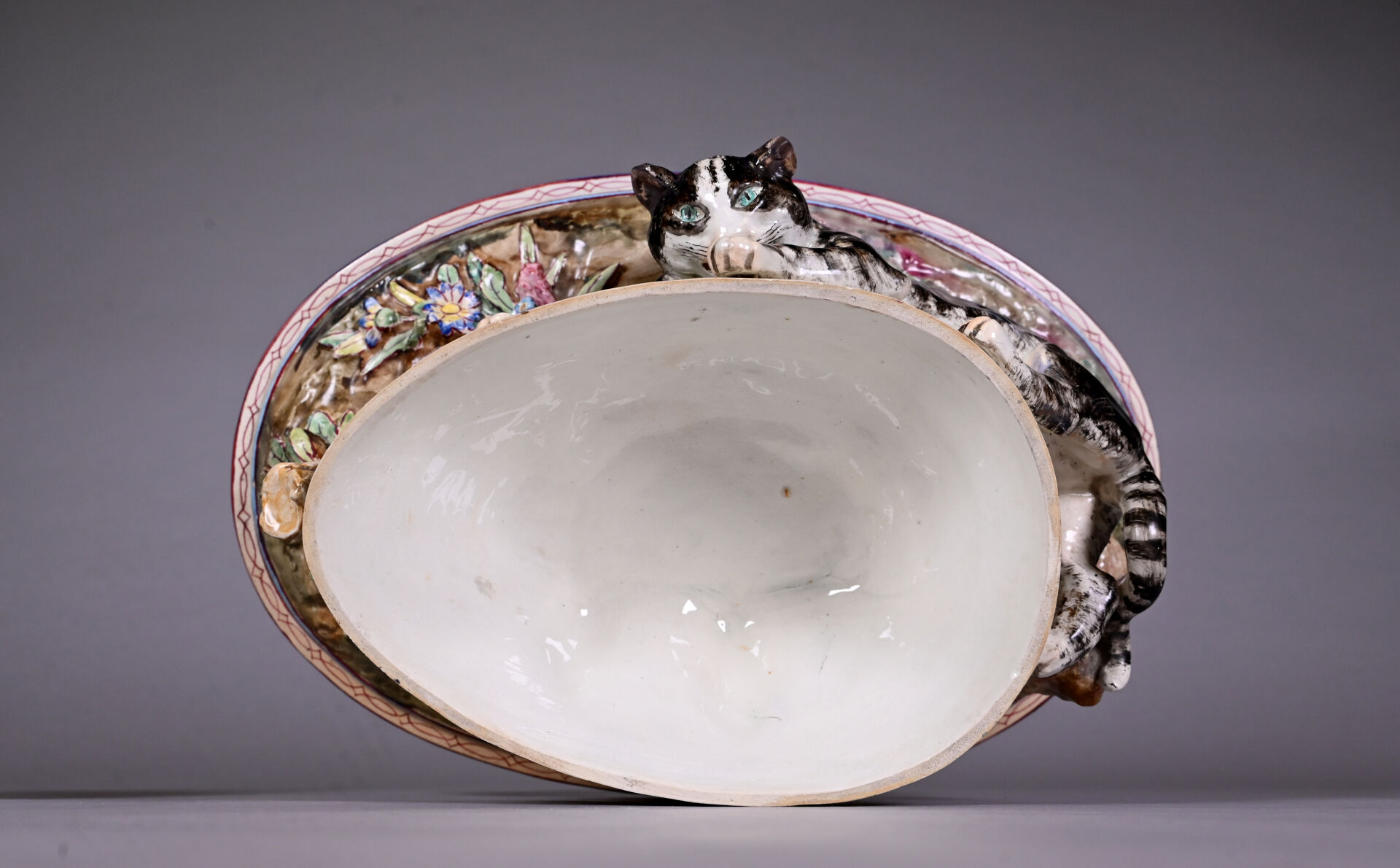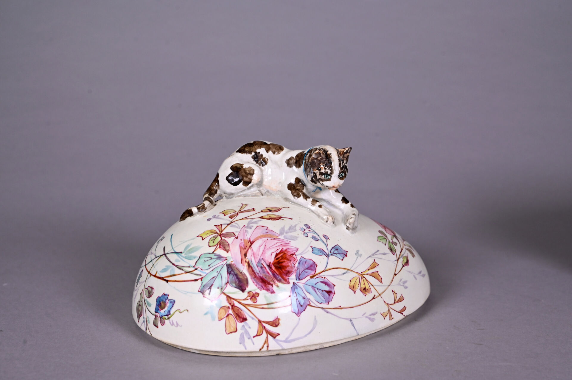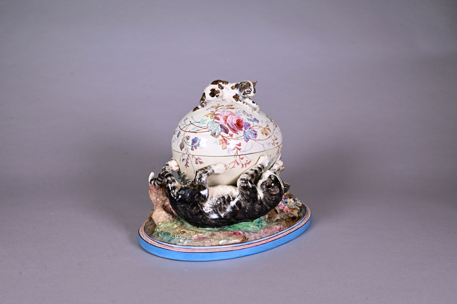 Drageoir en faïence figurant une chatte jouant avec son chaton posé sur un œuf géant (égrenures dans le couvercle). Production anglaise (?) vers 1900 (?). Haut. : 25 cm – Larg. : 33 cm – Prof. : 19 cm.