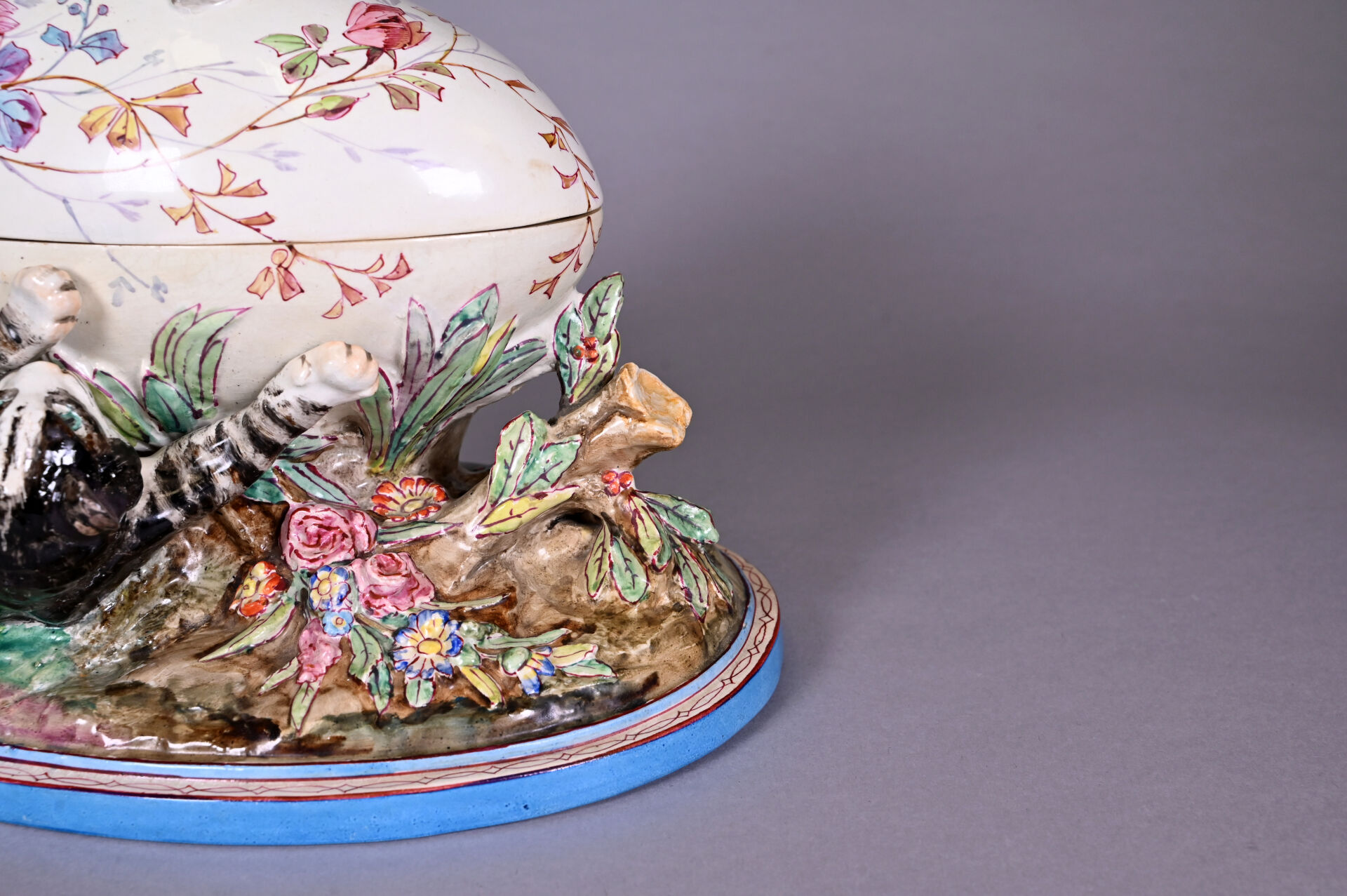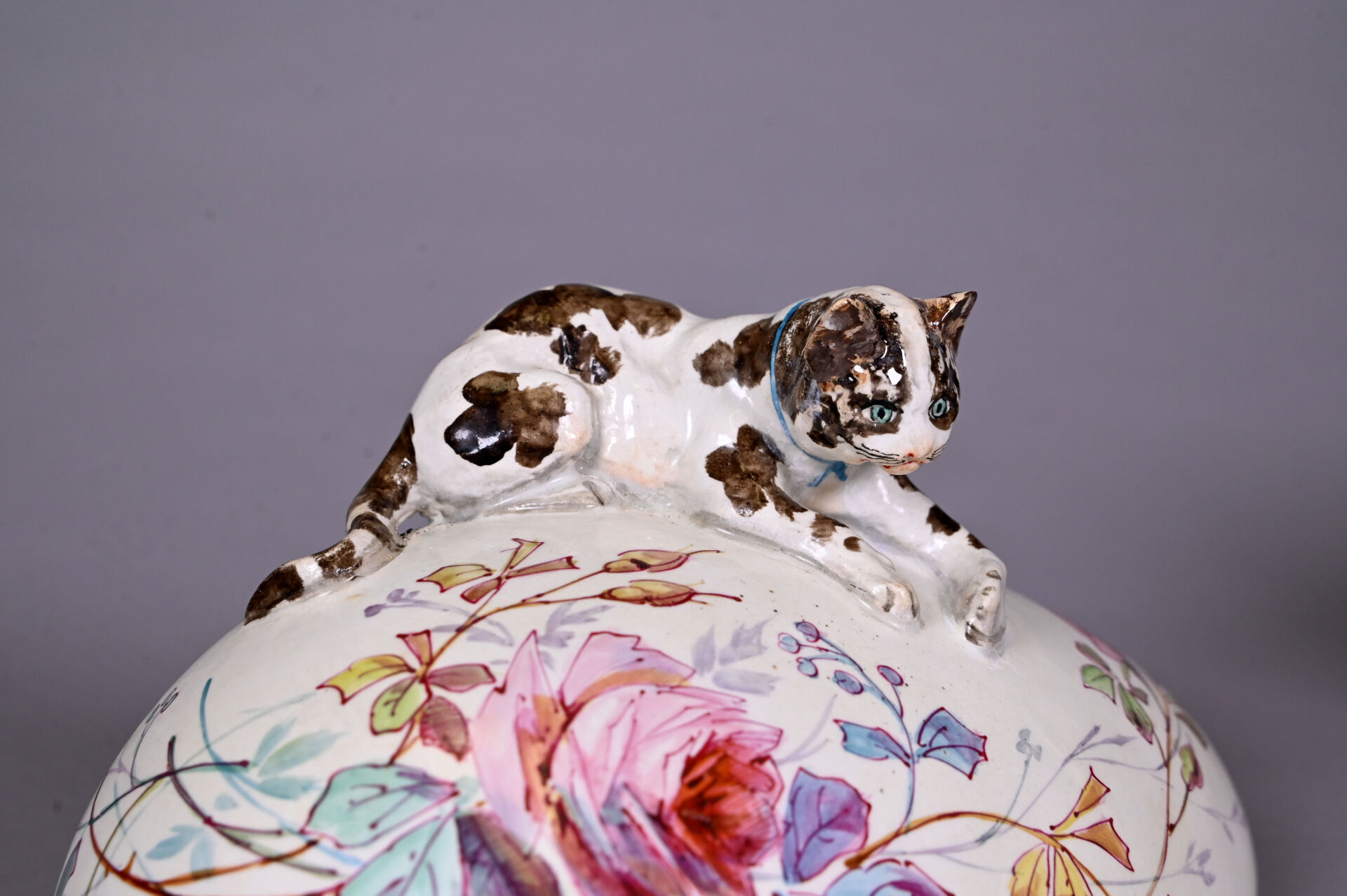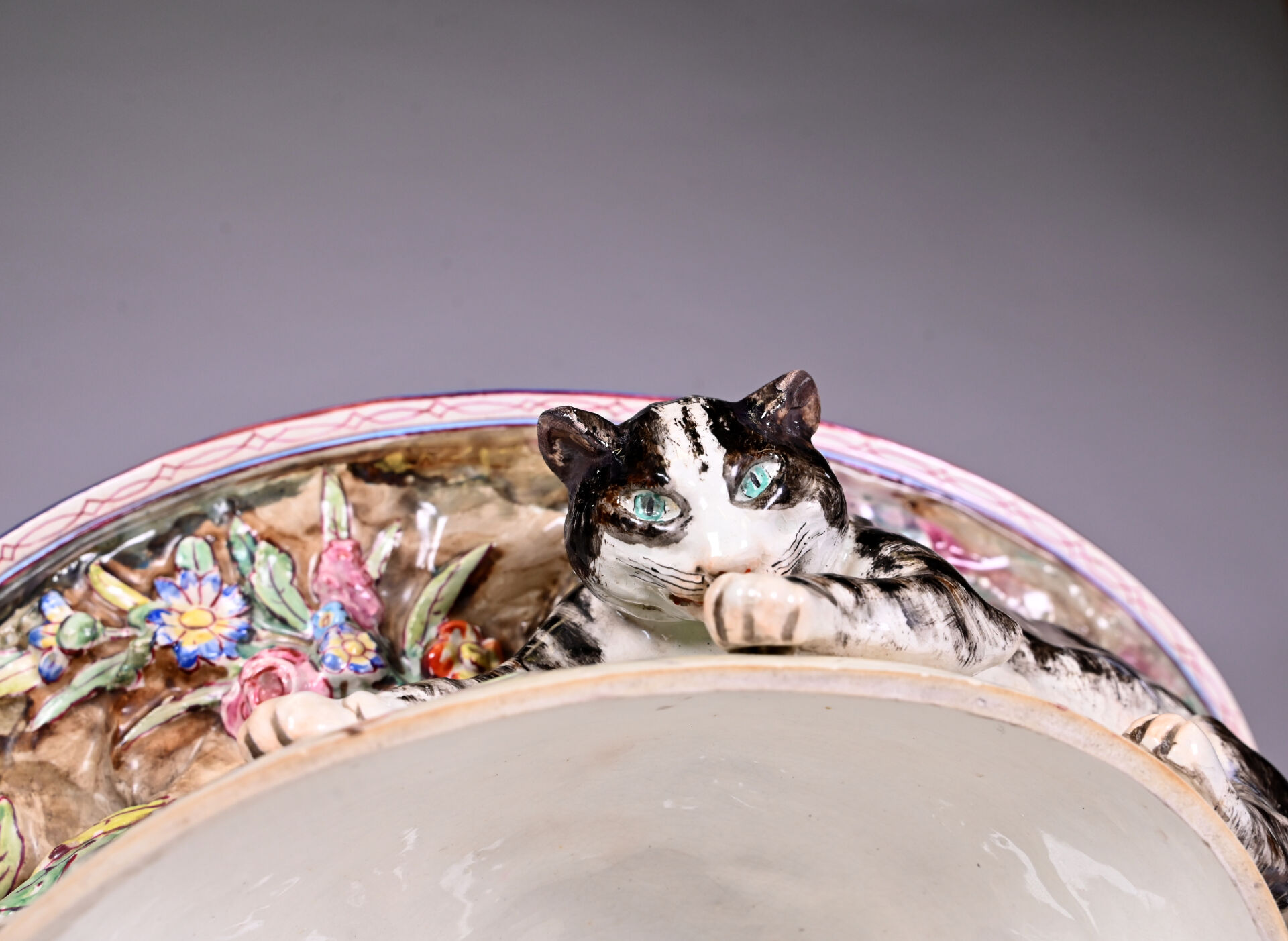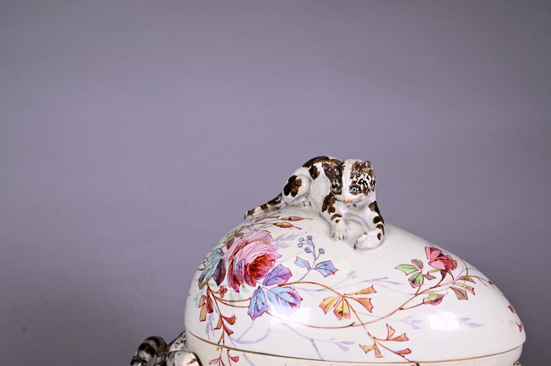 Drageoir en faïence figurant une chatte jouant avec son chaton posé sur un œuf géant (égrenures dans le couvercle). Production anglaise (?) vers 1900 (?). Haut. : 25 cm – Larg. : 33 cm – Prof. : 19 cm.