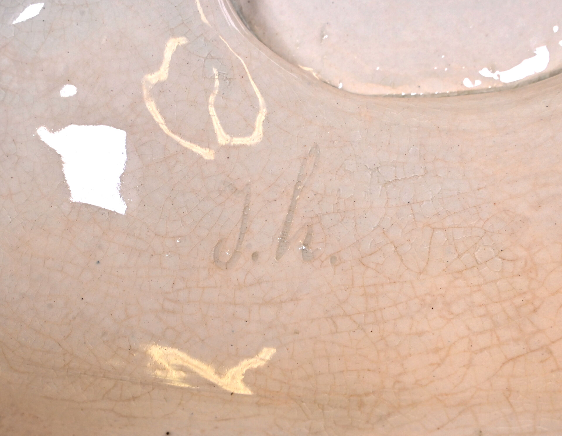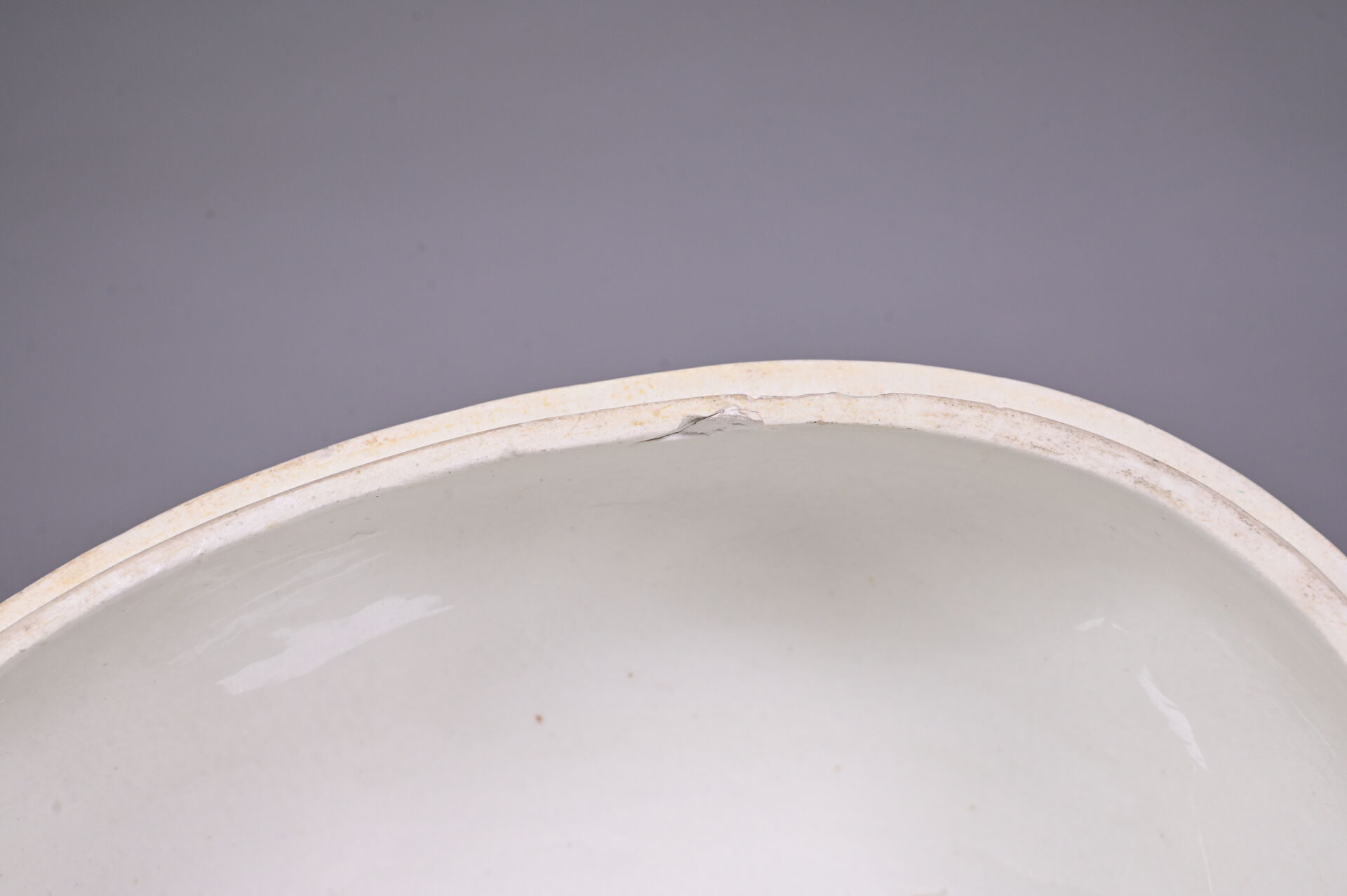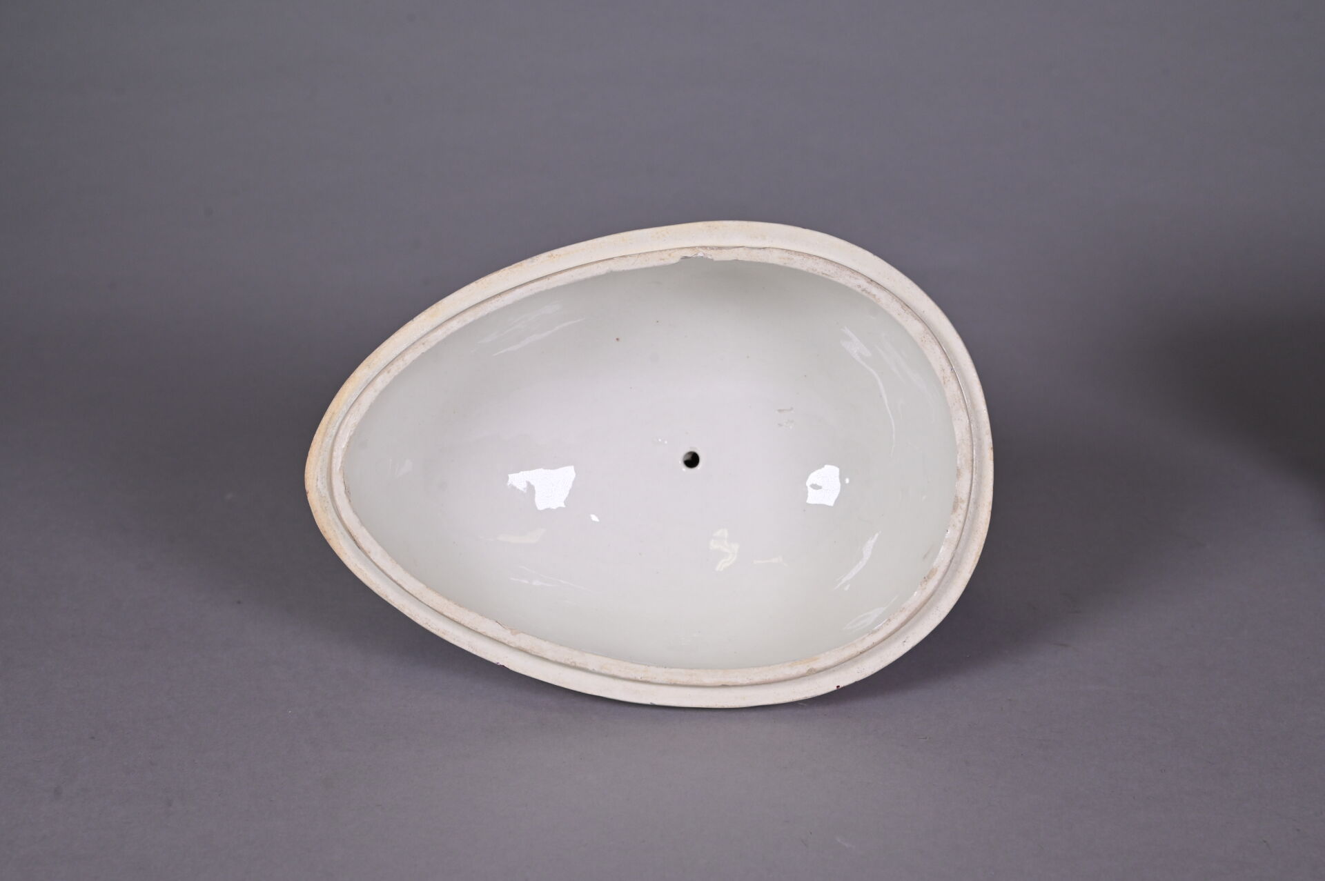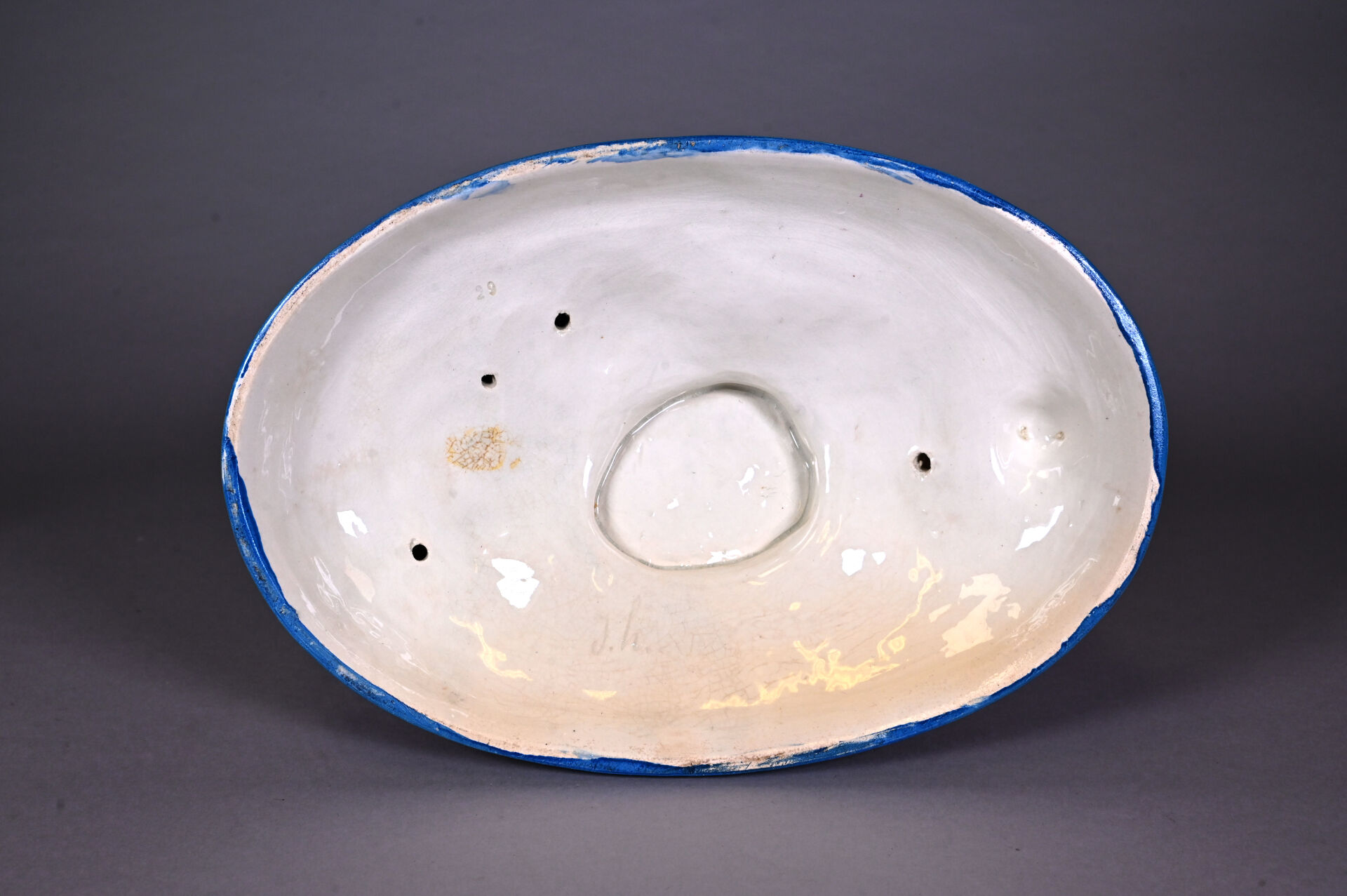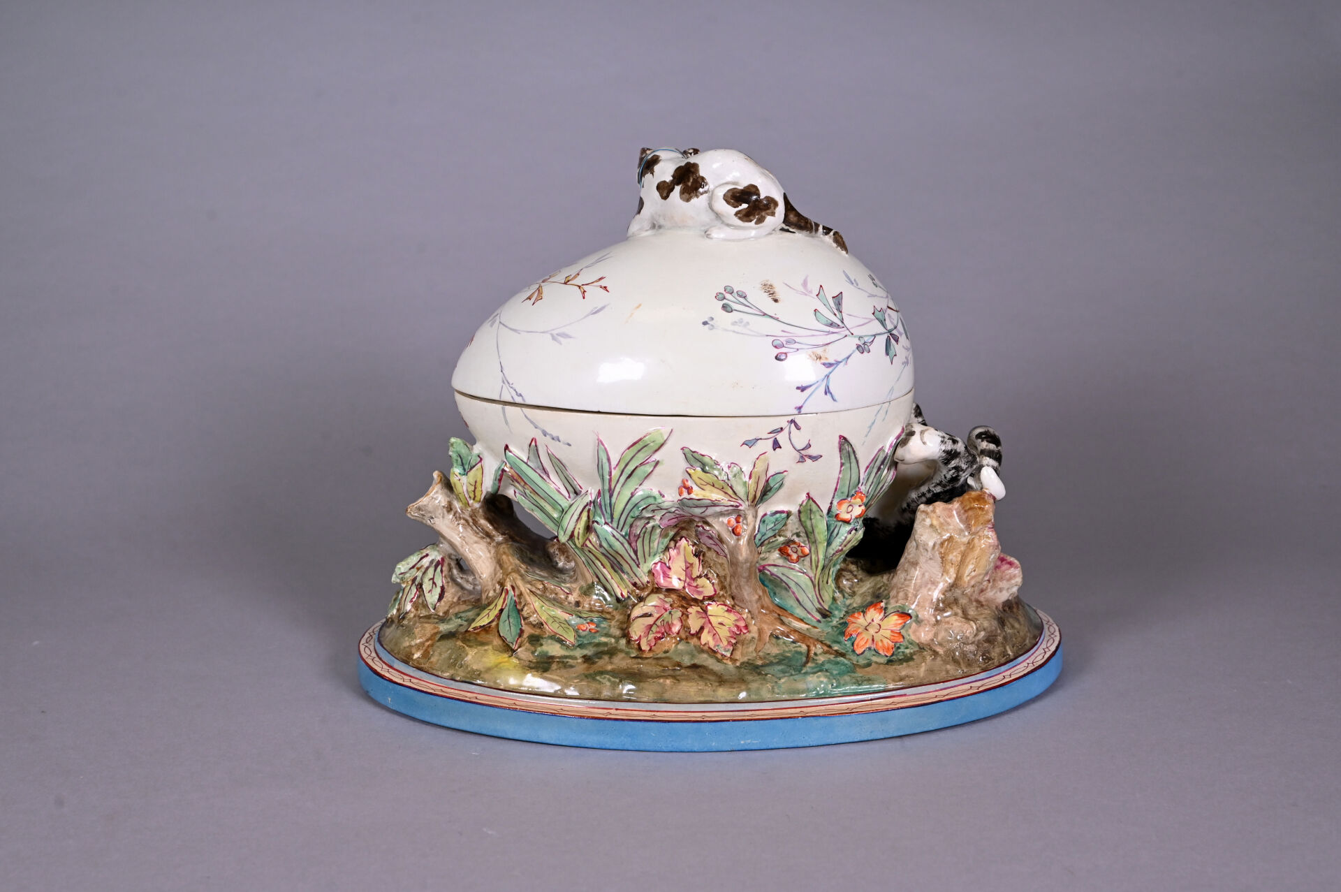 Drageoir en faïence figurant une chatte jouant avec son chaton posé sur un œuf géant (égrenures dans le couvercle). Production anglaise (?) vers 1900 (?). Haut. : 25 cm – Larg. : 33 cm – Prof. : 19 cm.