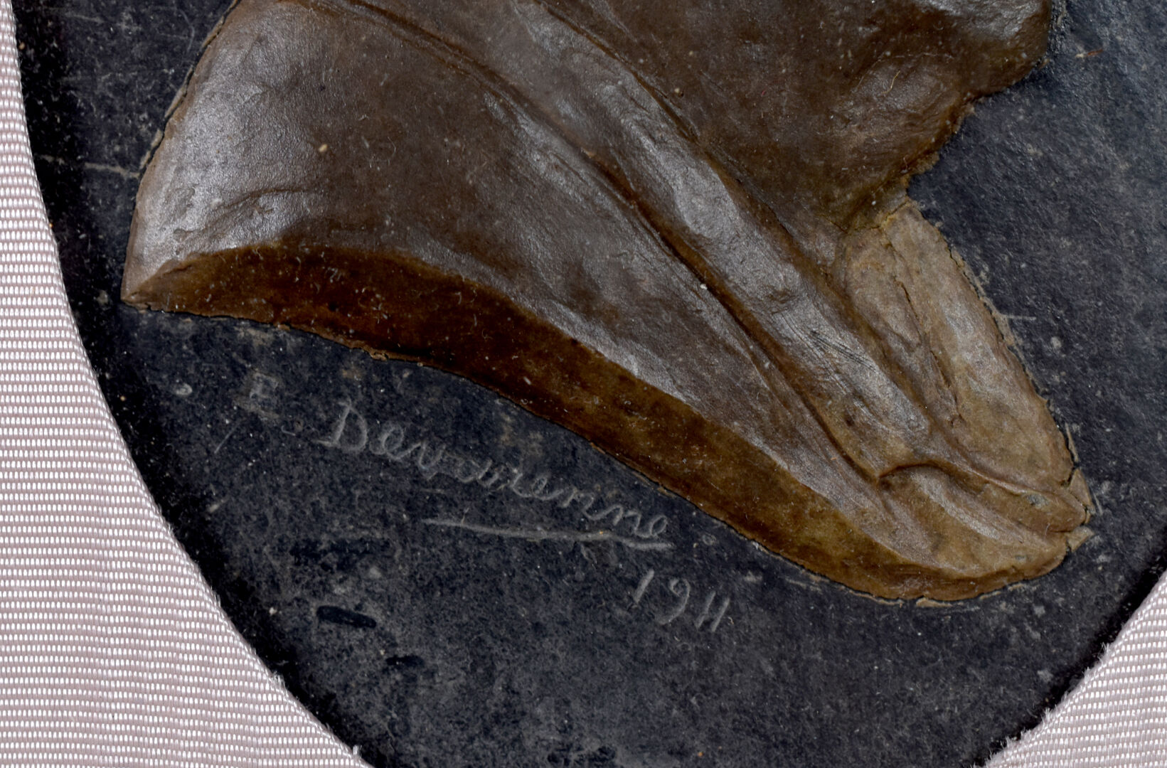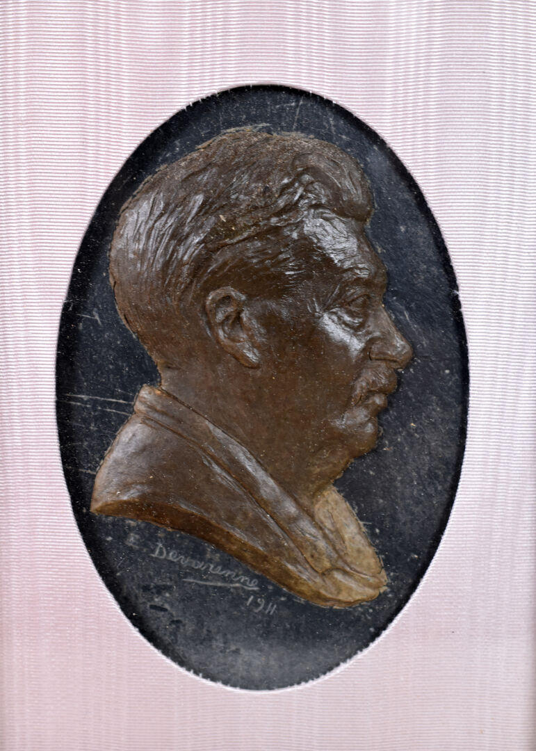 E. DEVARENNE (XIXe – XXe siècle). Profil d’homme en bas relief (probablement en terre crue) dans un médaillon encadré. Signé et daté 1911. Dimensions totales : 25 x 20 cm.