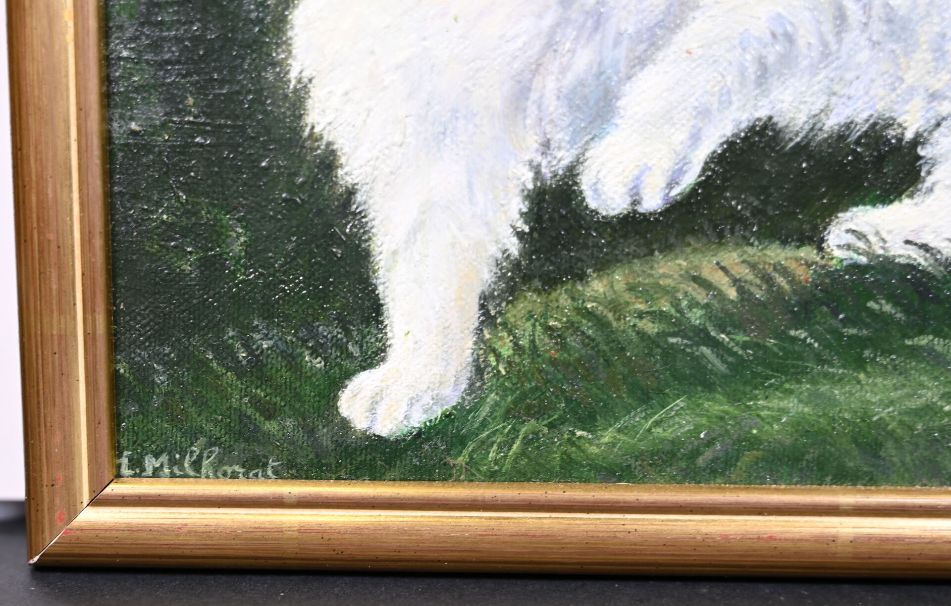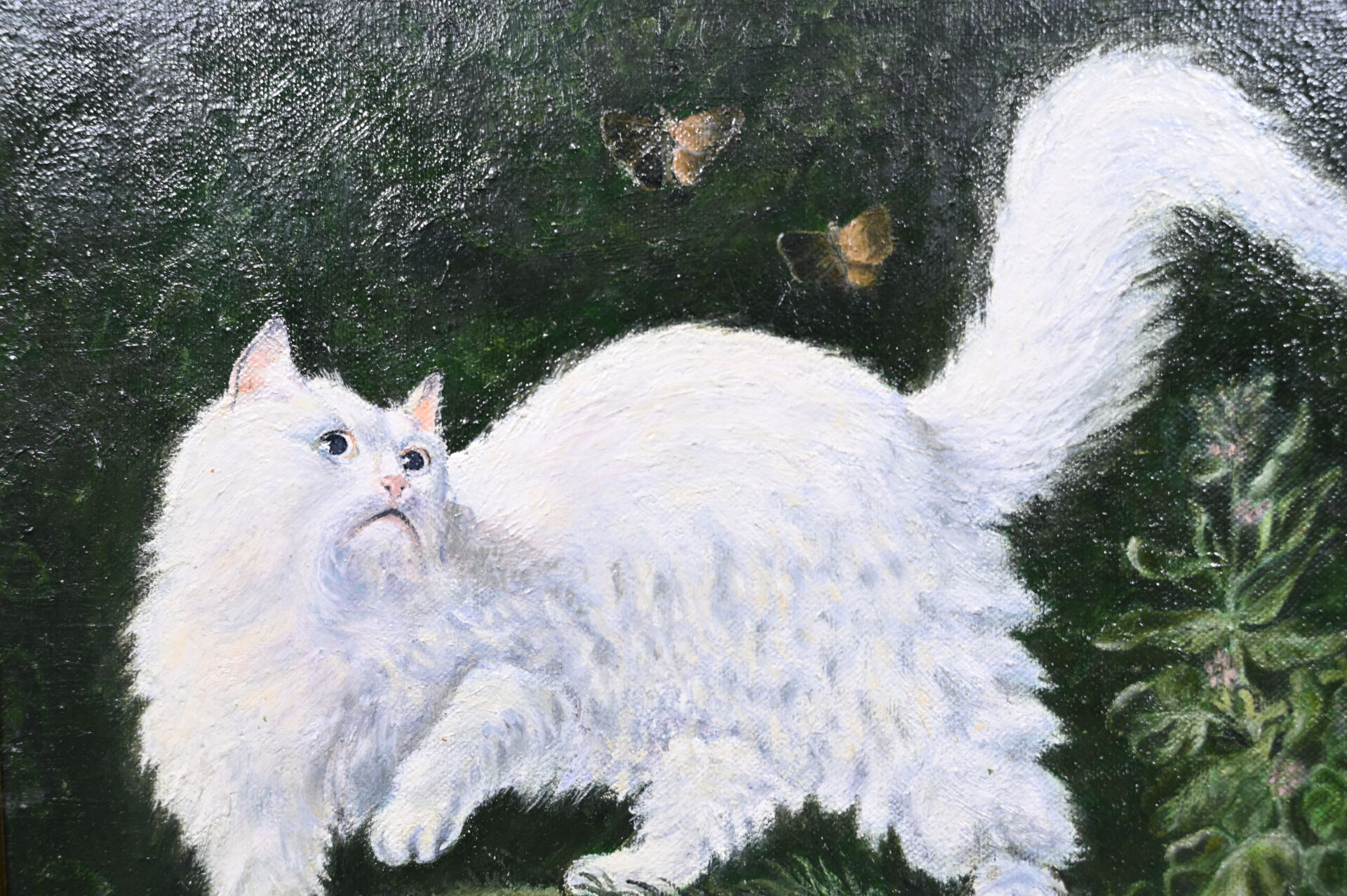 E. MILHORAT ? (XXe siècle). Le chat blanc. Huile sur toile marouflée sur carton, signée en vas à gauche. 21,5 x 26,5 (à vue).