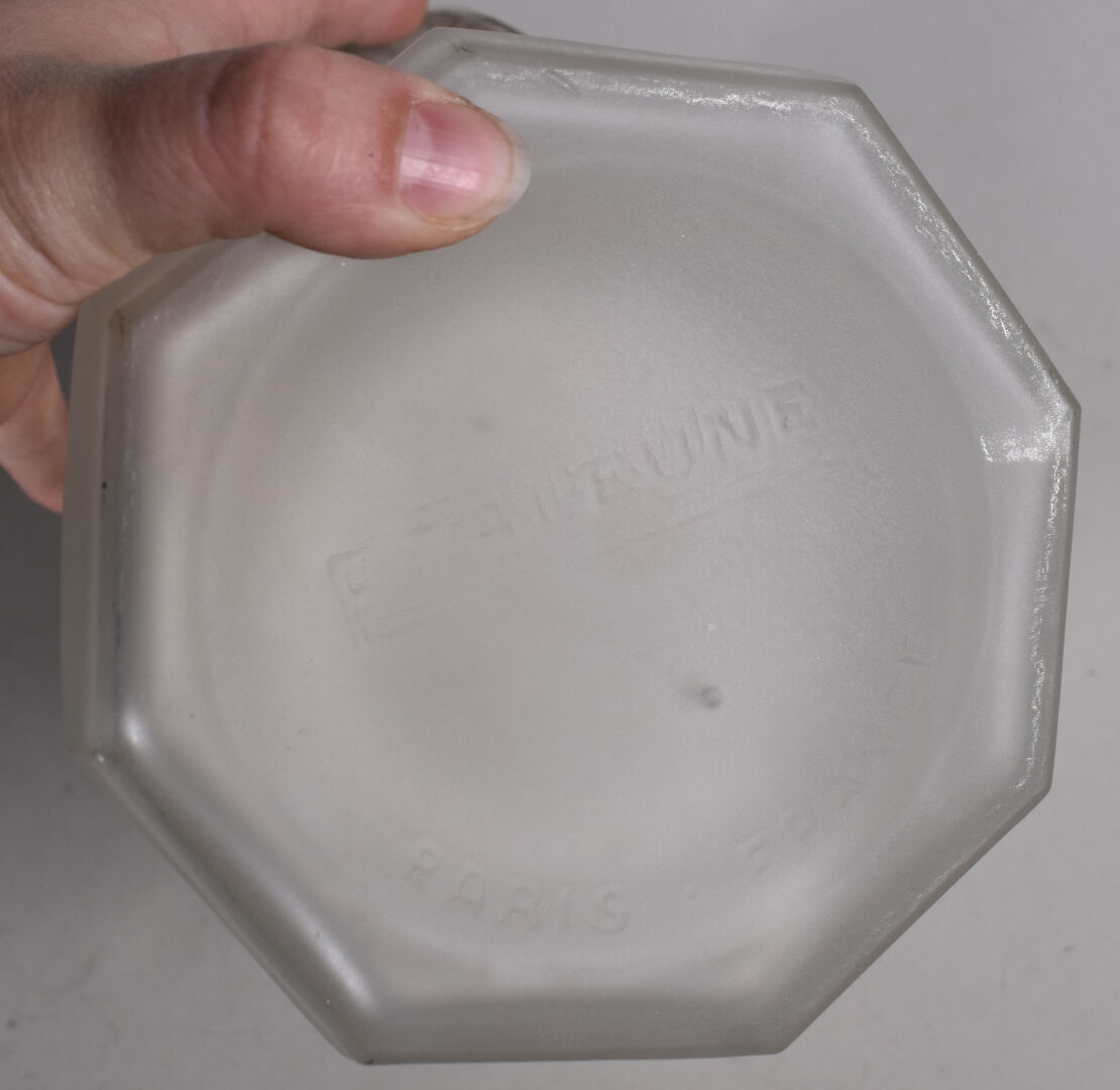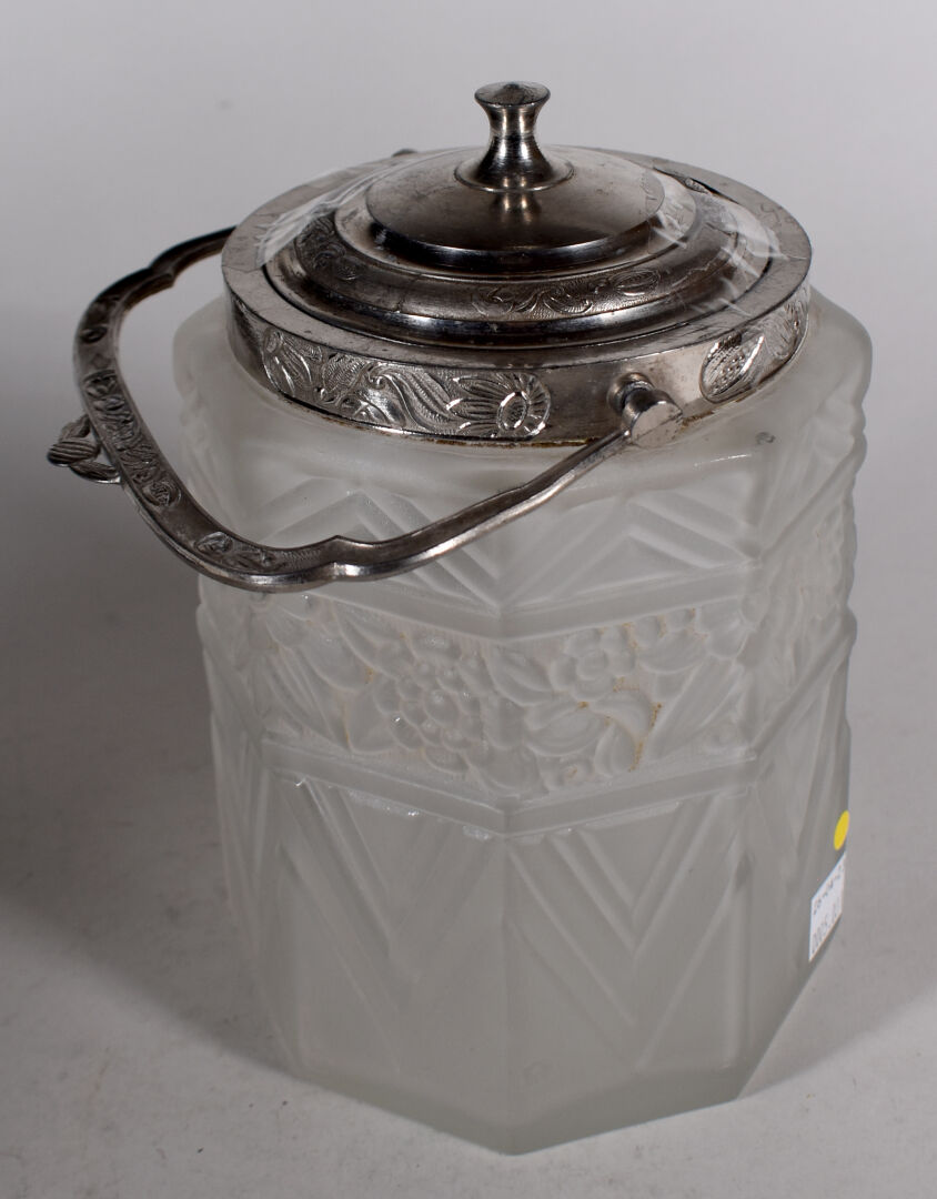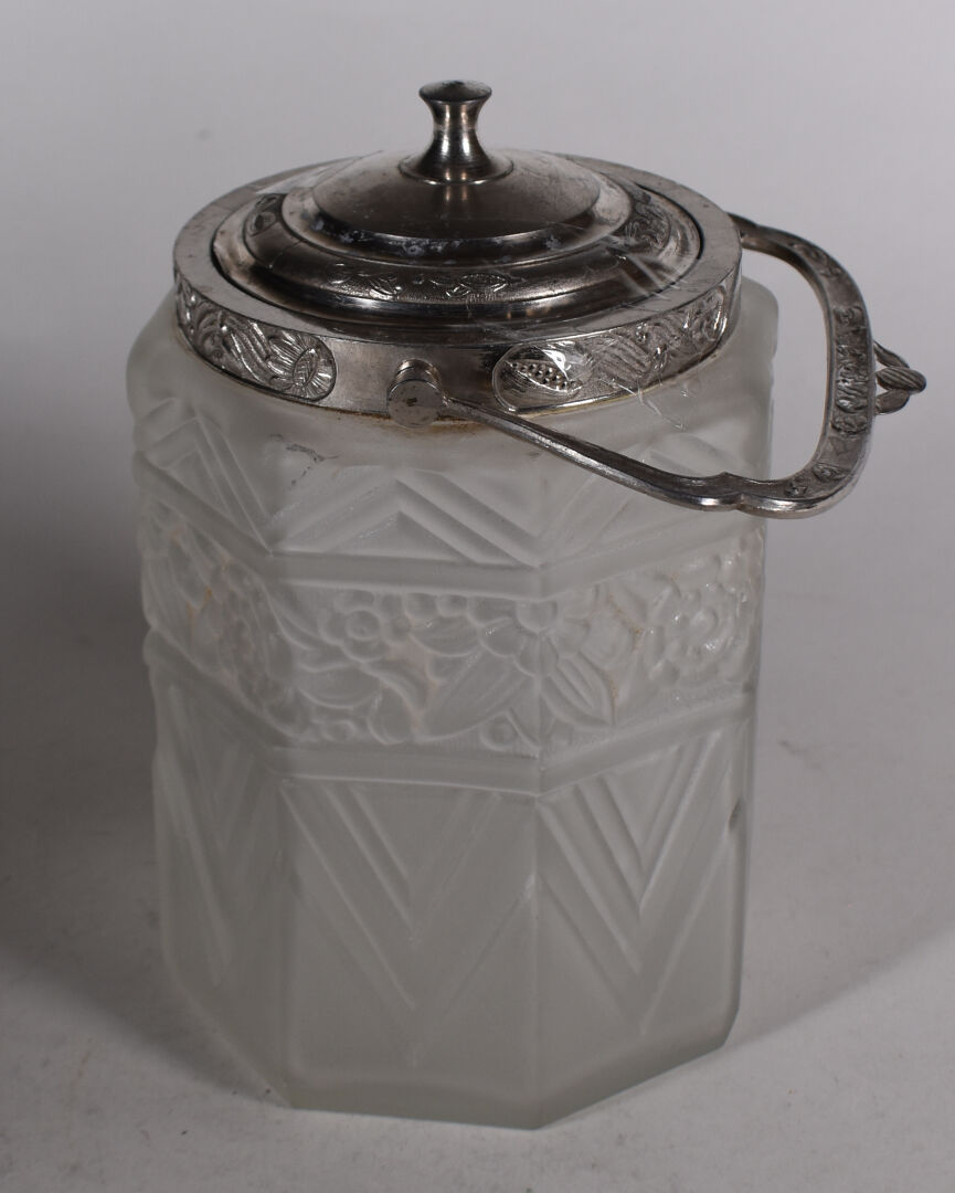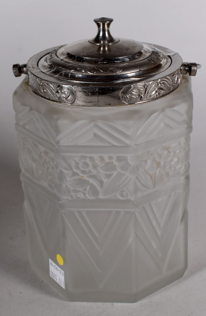 E. TALEUNE. Pot à biscuits en verre moulé sablé à décor d’une frise de fleurs et chevrons. Monture en métal. Epoque Art Déco. Marqué. Haut. : 21 cm.