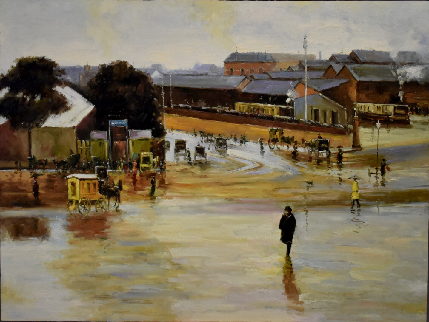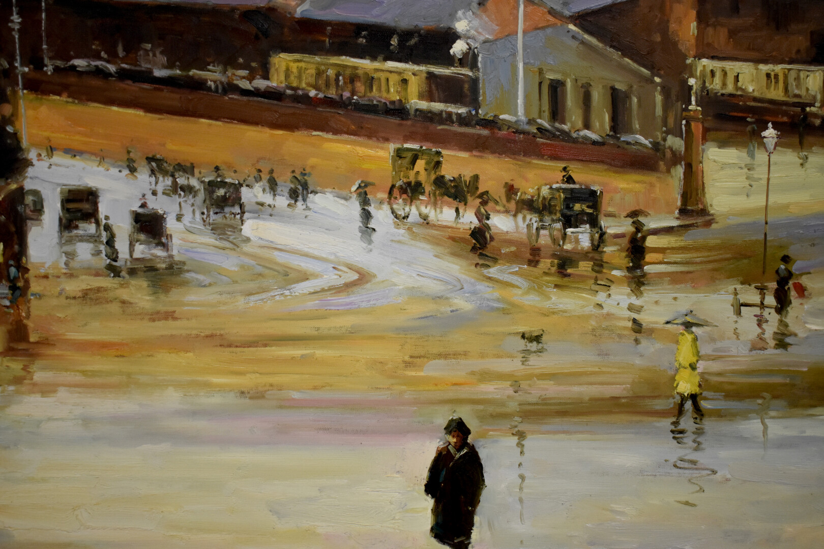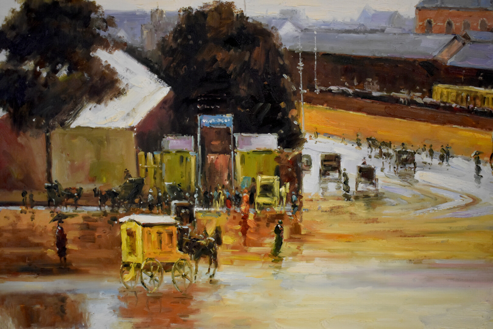 École asiatique du XXe siècle. Scène de rue animée. Huile sur toile. 92 x 121,5 cm.