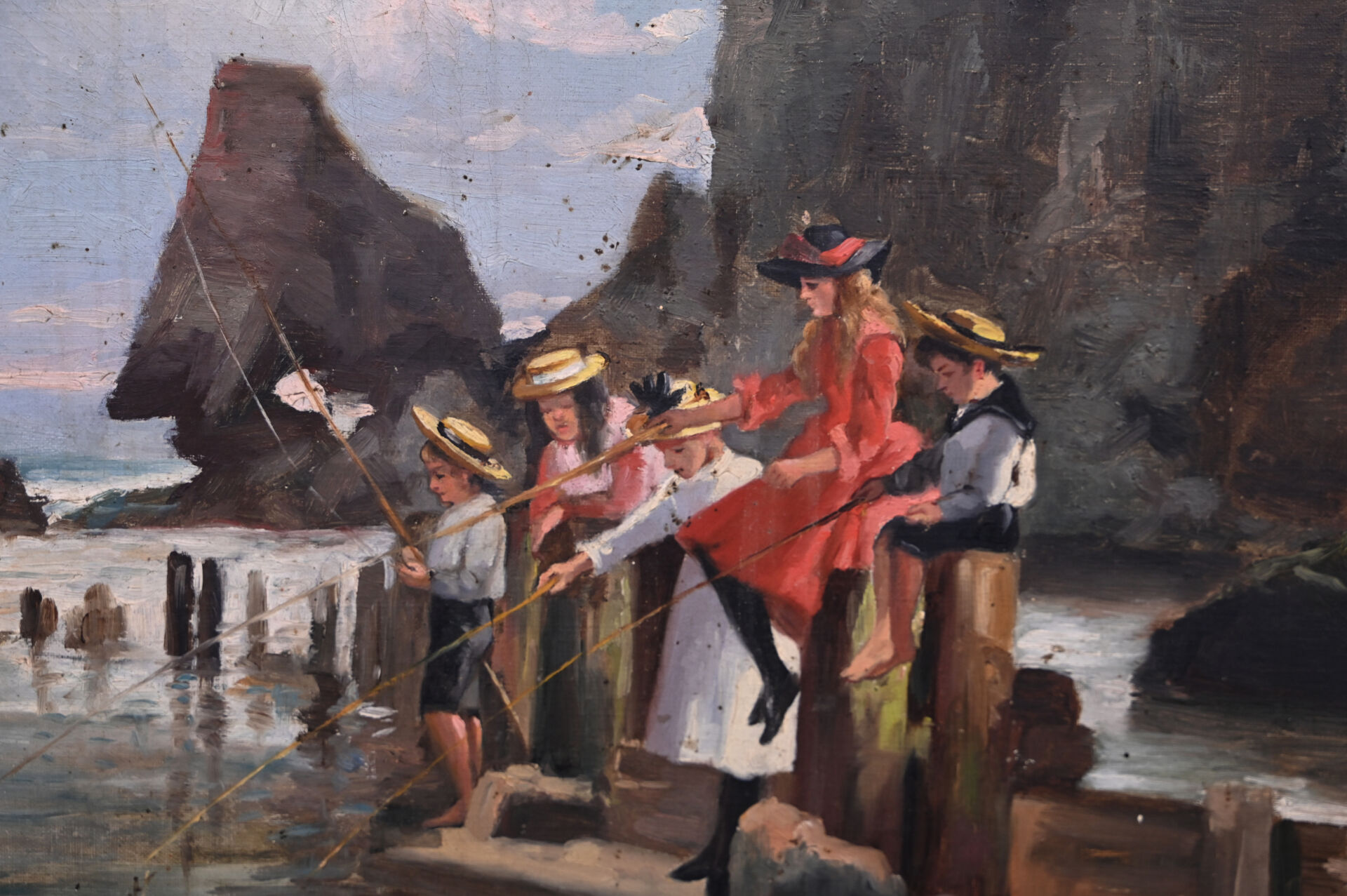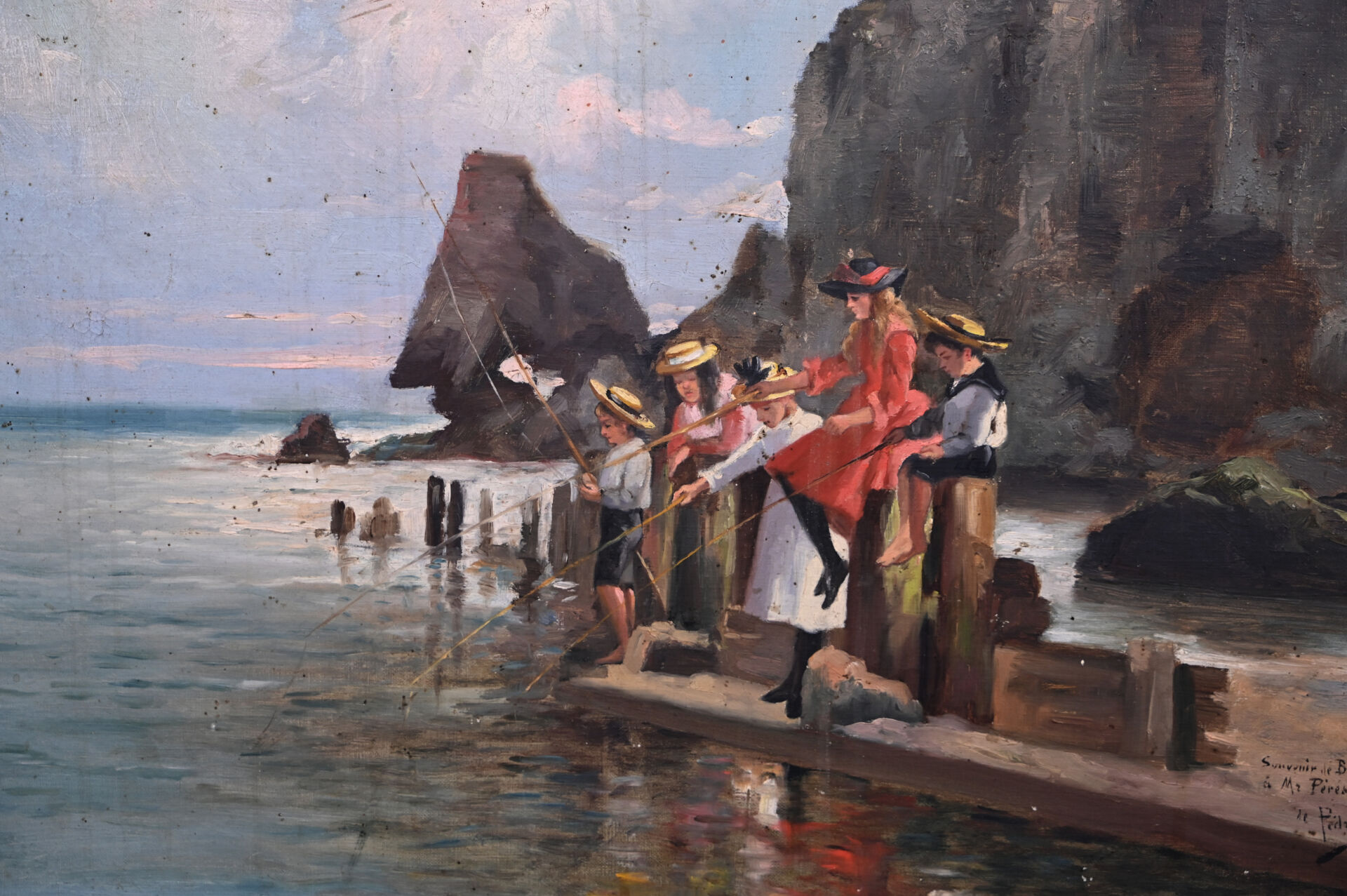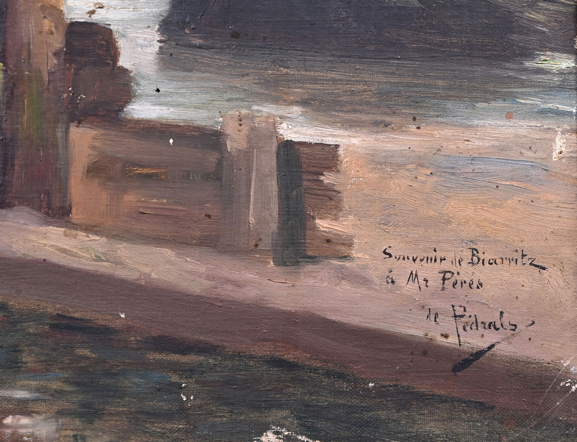 Ecole basque du début du XXe siècle (PEDRALS). Les petits pêcheurs, Biarritz. Huile sur toile signée et dédicacée à Mr Peres en bas à droite. 46 x 61 cm.