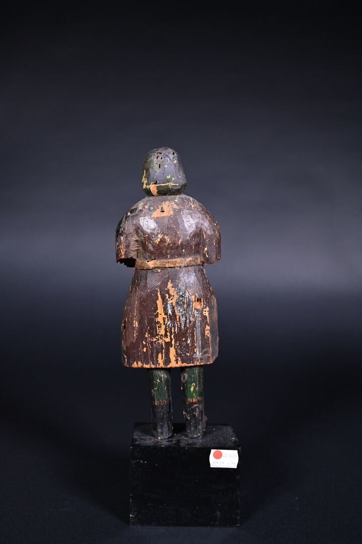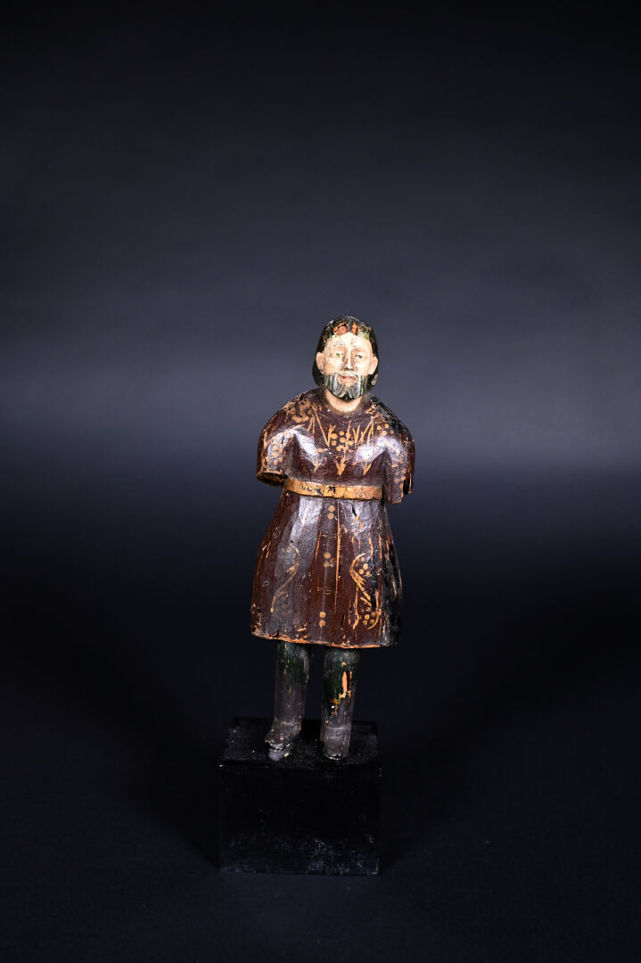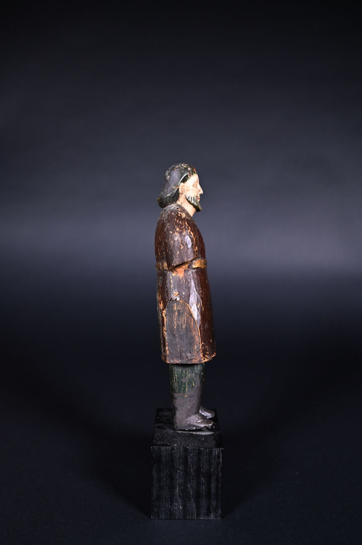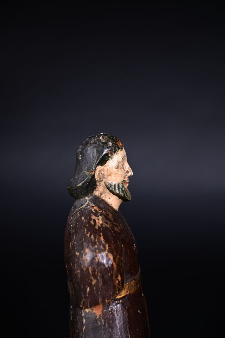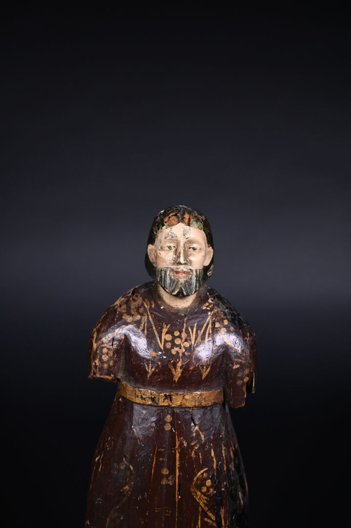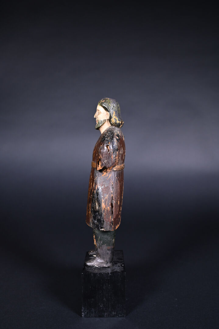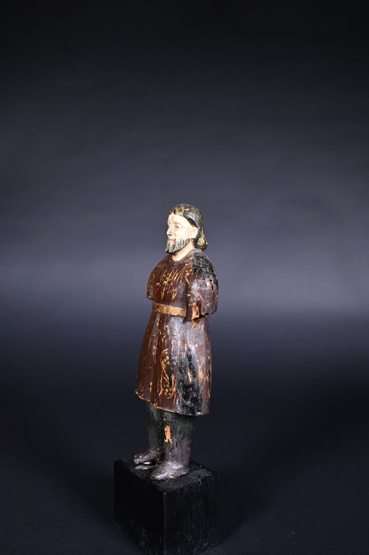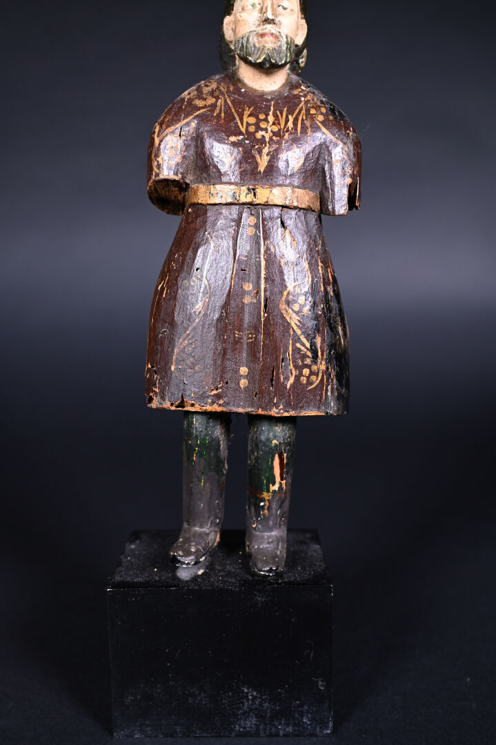 École coloniale hispanique du XIXème siècle. Saint personnage Statuette en bois polychromé et doré. Accidents et bras manquants. Base cubique en bois noir. Haut. : 27,5 cm.
