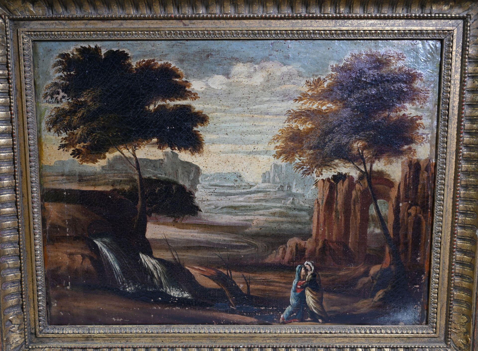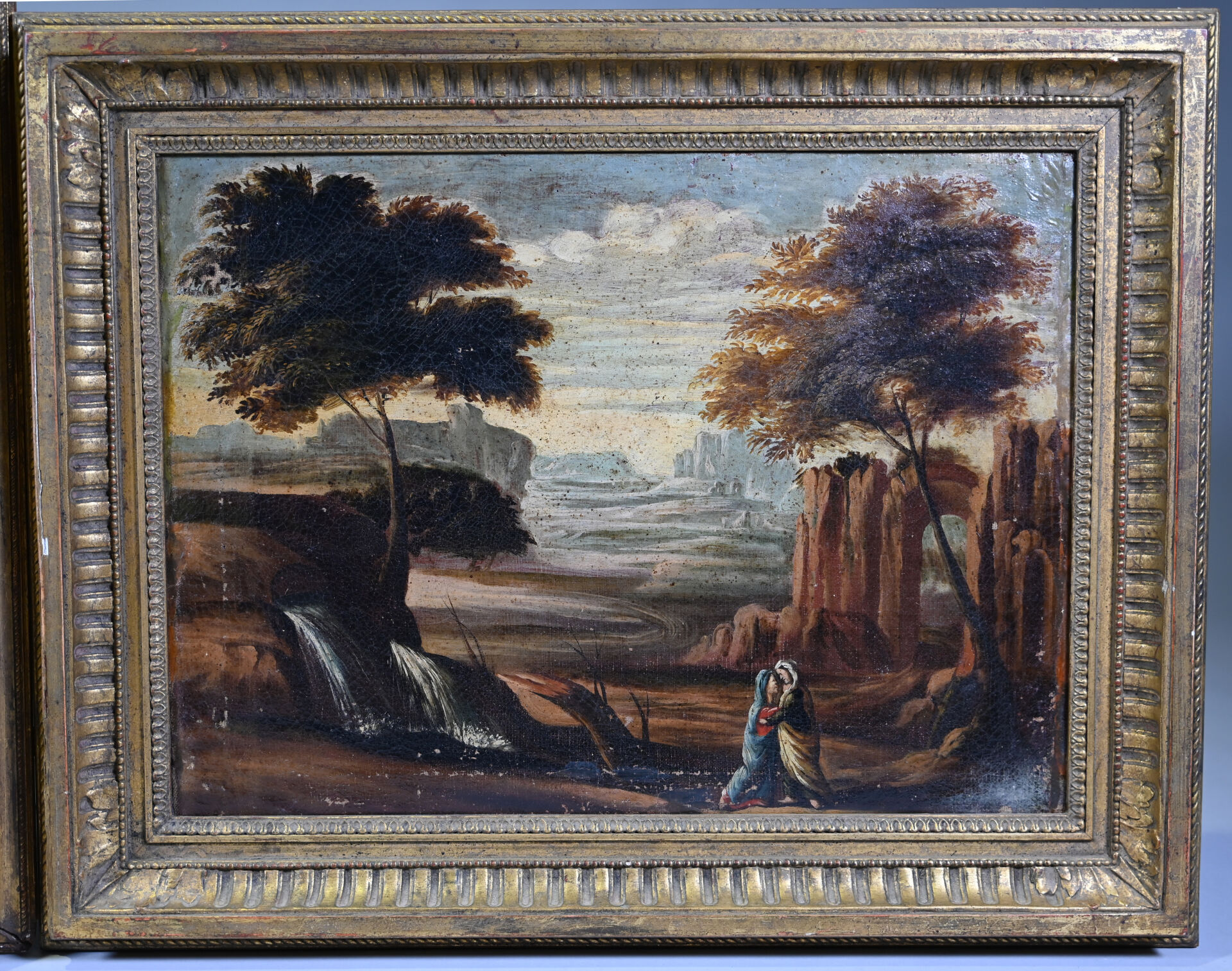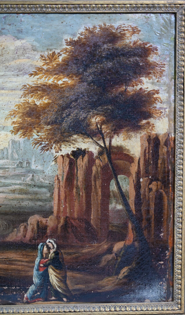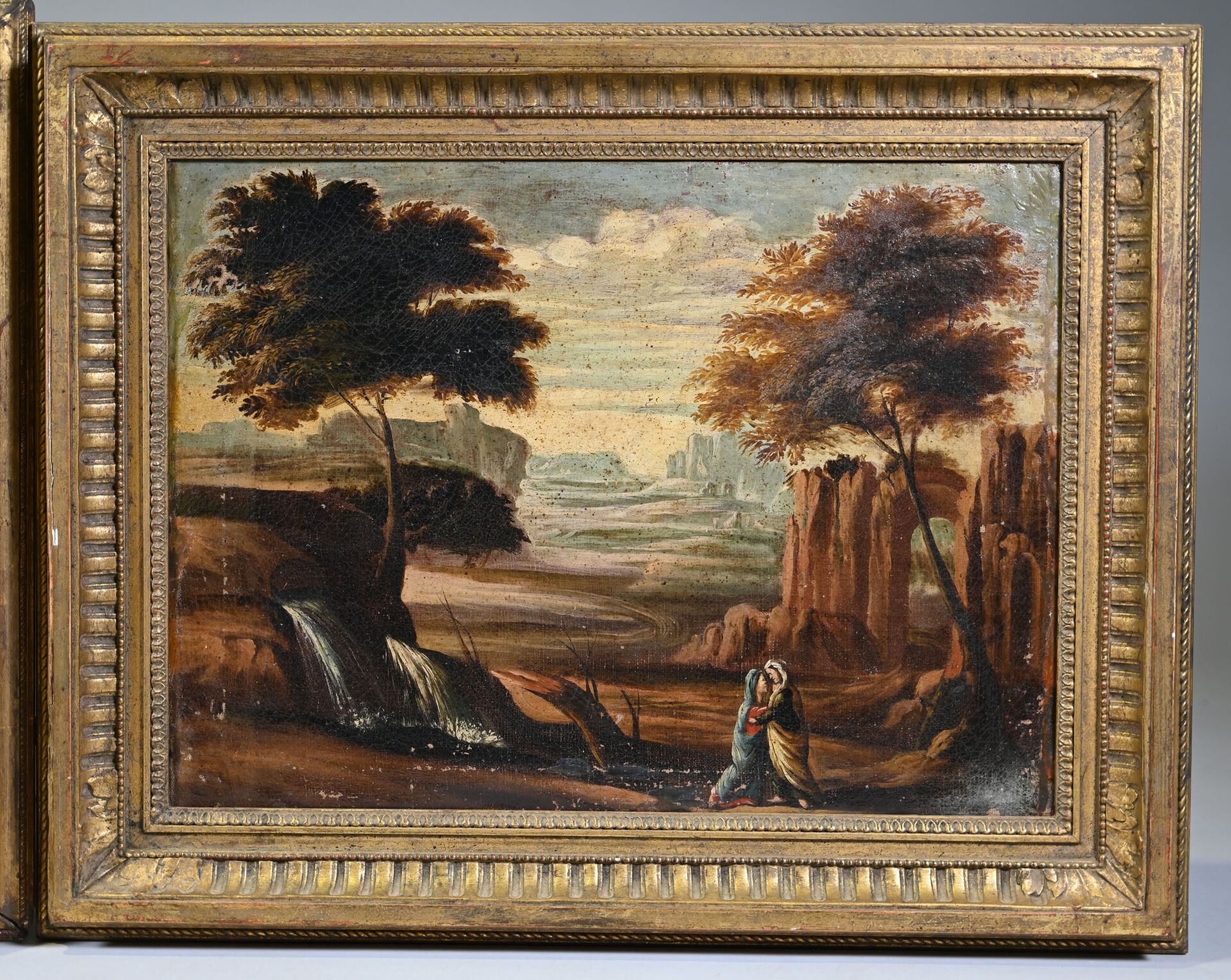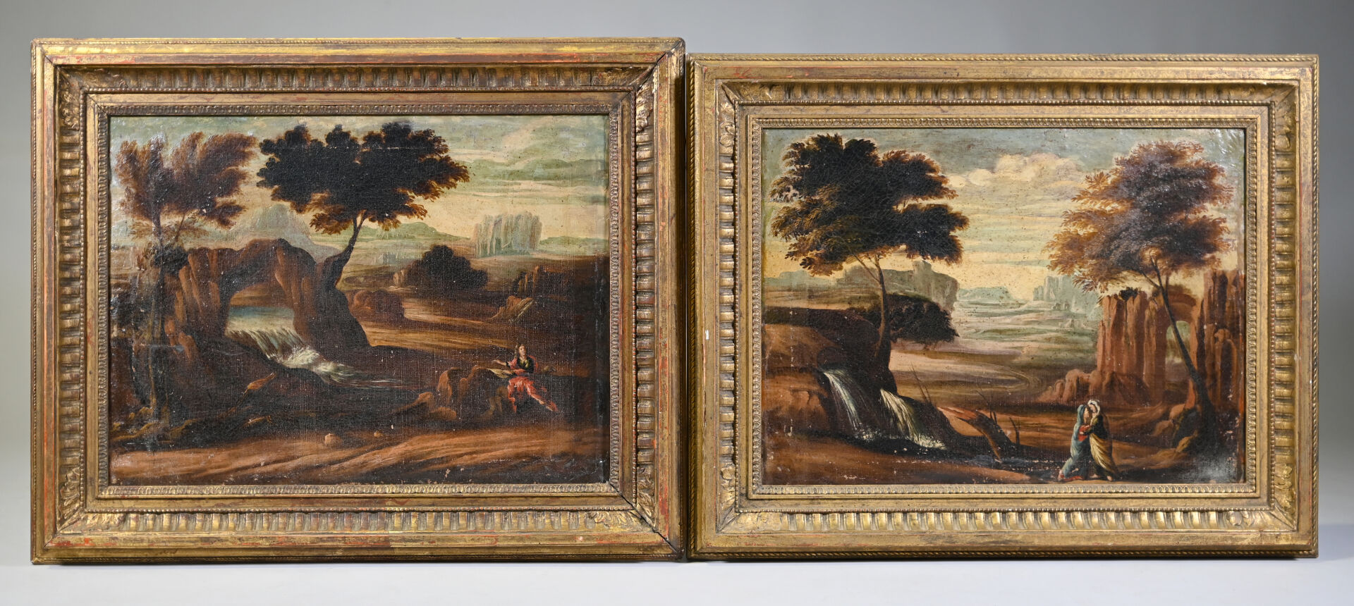 École de la fin du début du XIXème siècle. Rome, vers 1800. Paysage animé d’une figure de Saint-Jean et de la Vierge et Sainte Anne. Deux huiles sur toile. 44,5 x 60 cm.