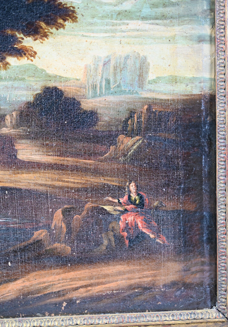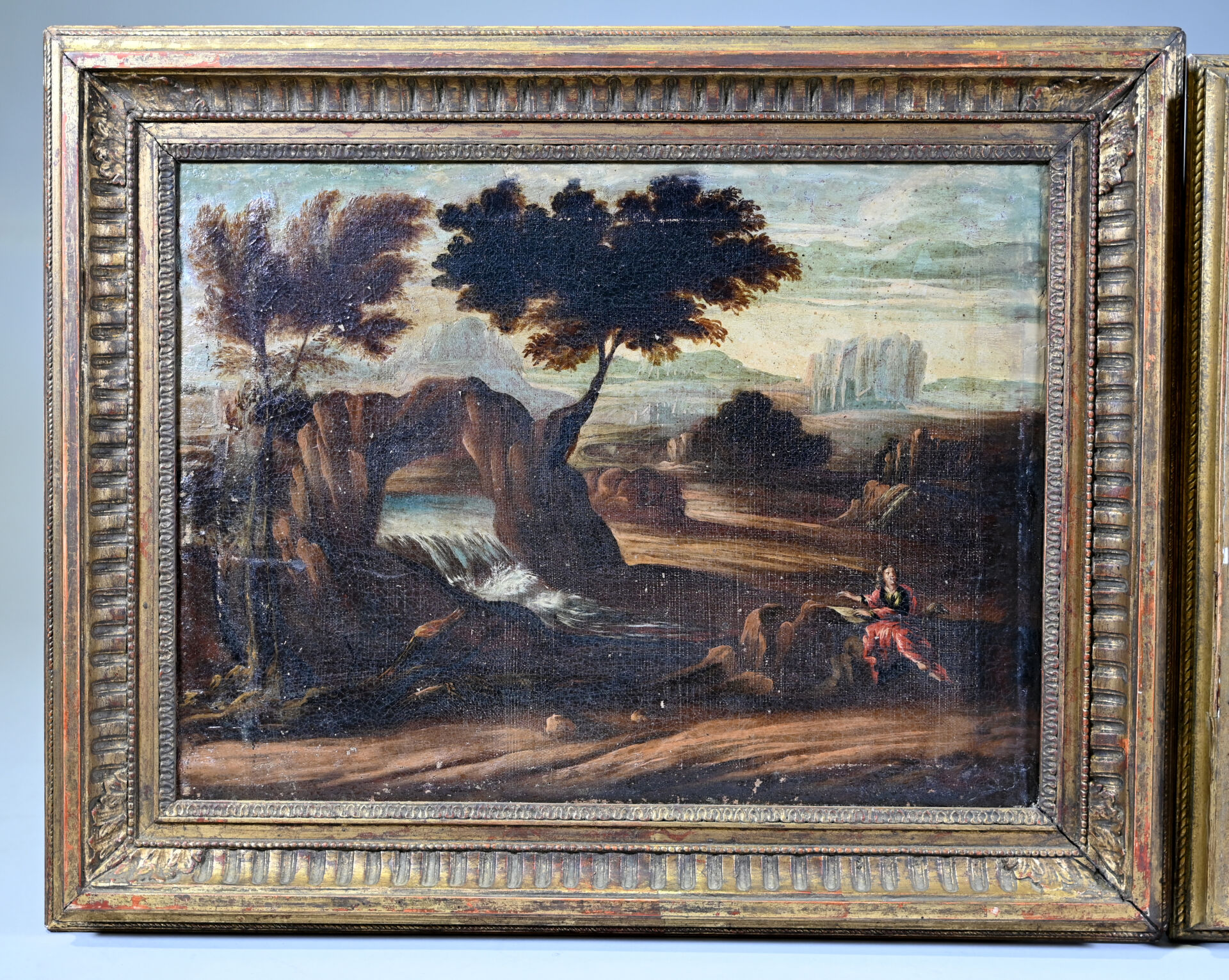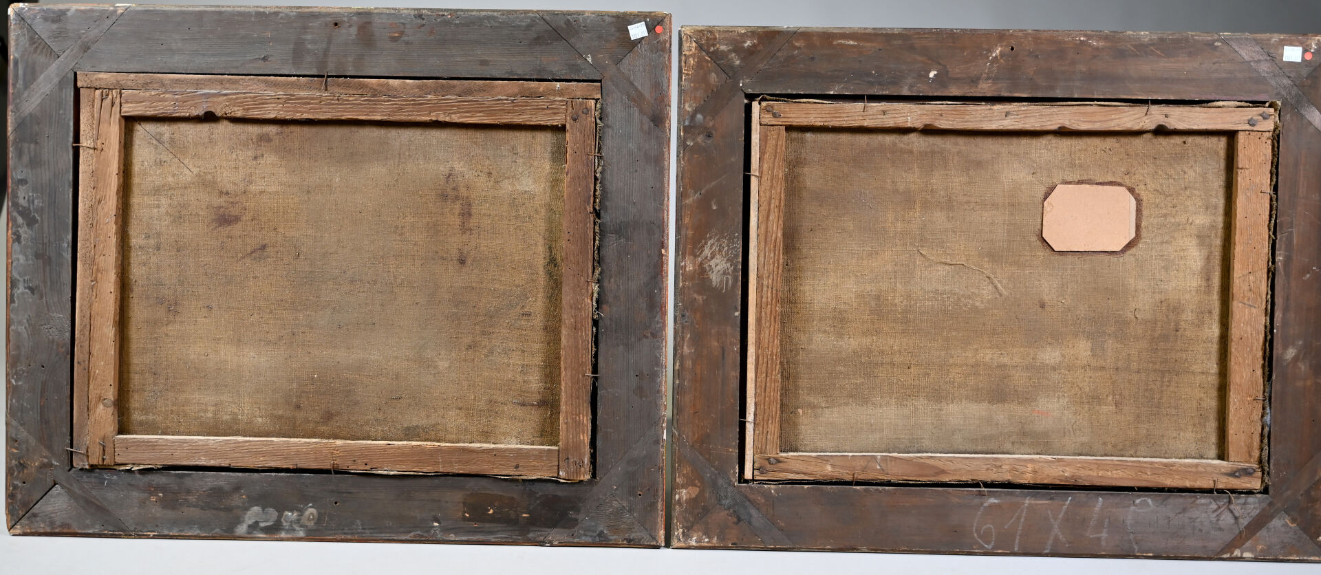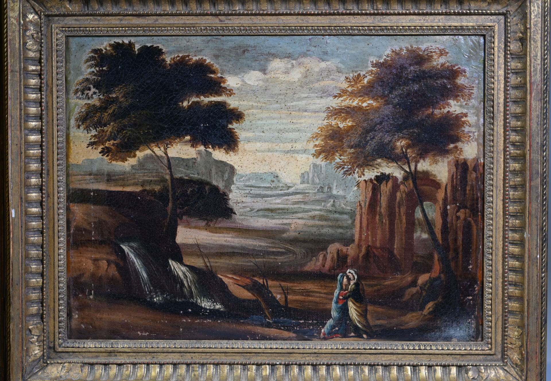 École de la fin du début du XIXème siècle. Rome, vers 1800. Paysage animé d’une figure de Saint-Jean et de la Vierge et Sainte Anne. Deux huiles sur toile. 44,5 x 60 cm.