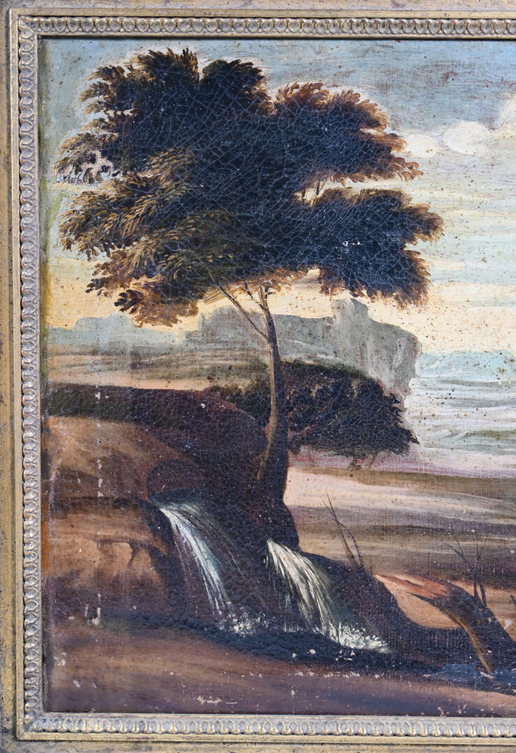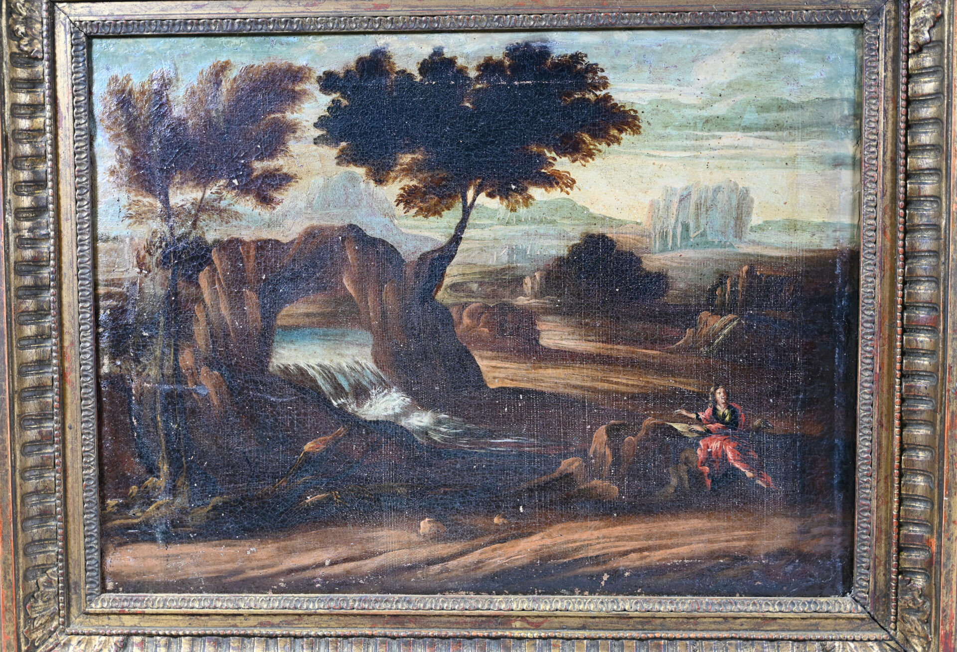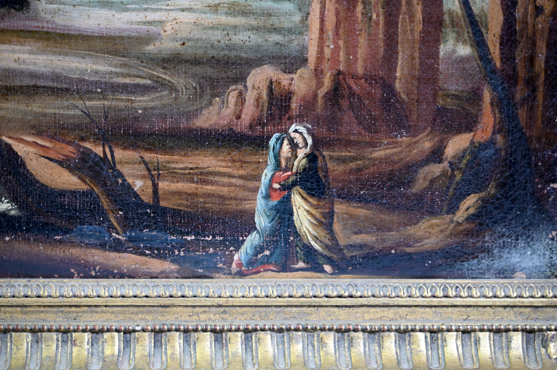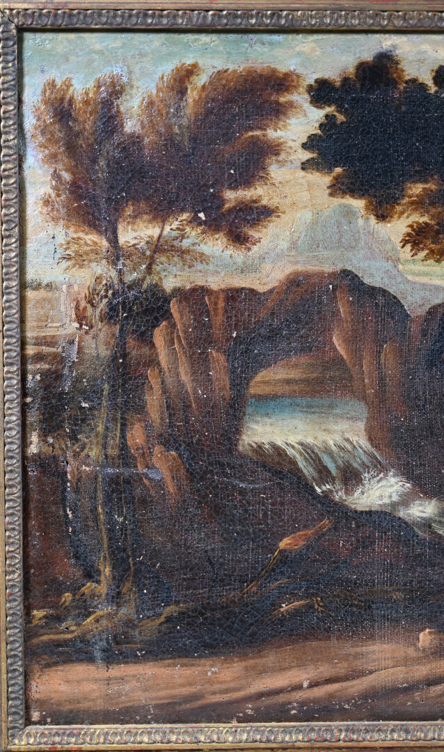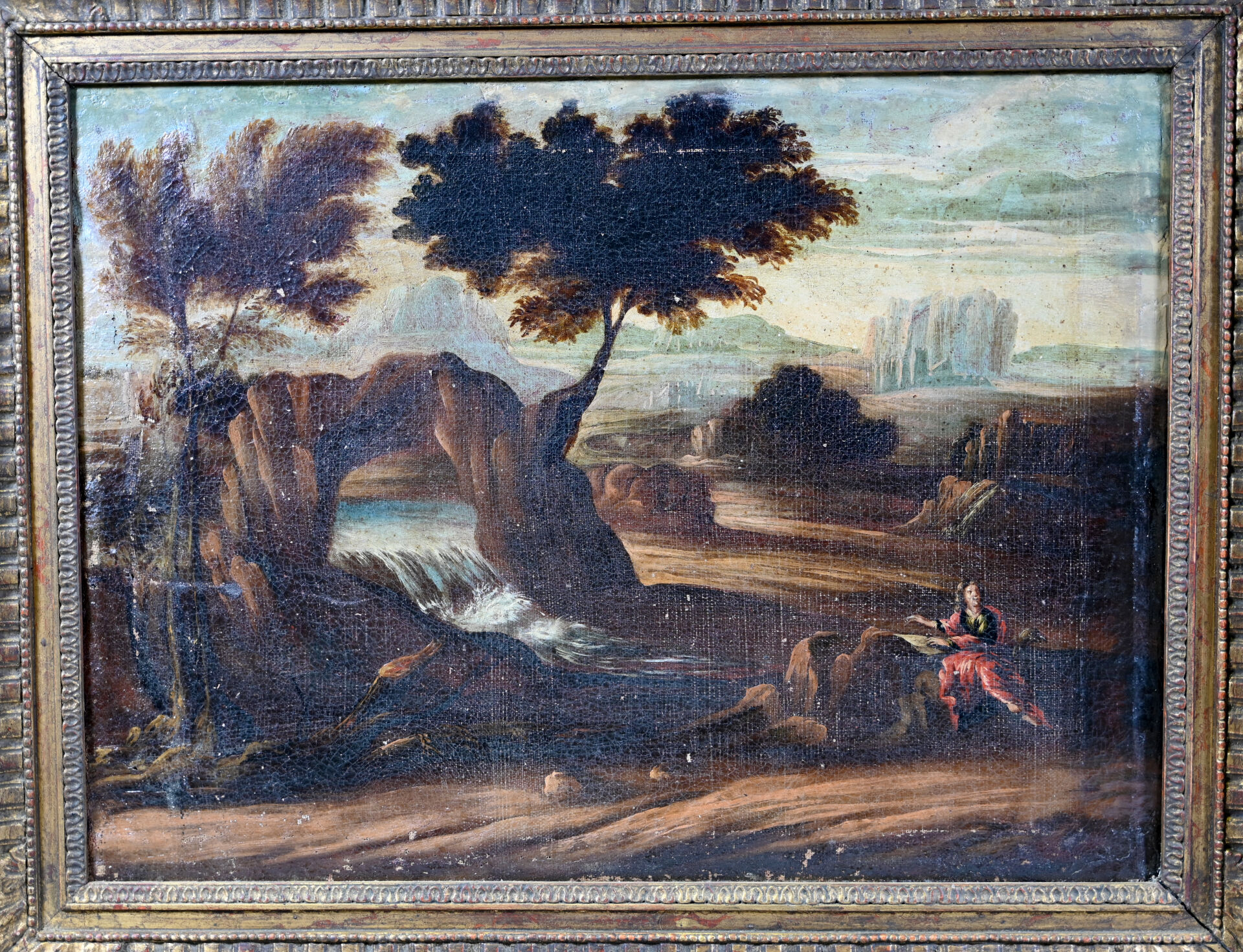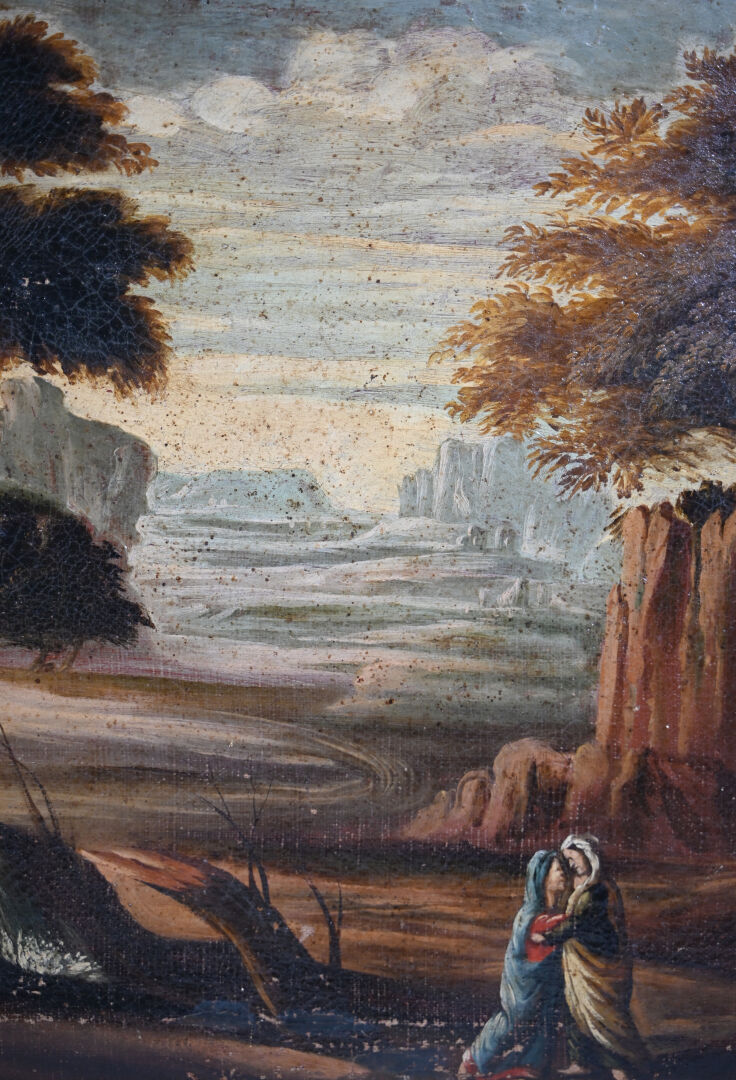 École de la fin du début du XIXème siècle. Rome, vers 1800. Paysage animé d’une figure de Saint-Jean et de la Vierge et Sainte Anne. Deux huiles sur toile. 44,5 x 60 cm.